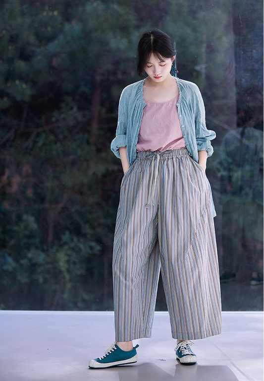 夏に履きたい色味◆上質なストライプコットン 9分丈ワイド イージーパンツ◆M/Lサイズ