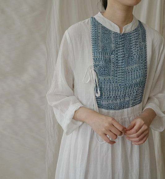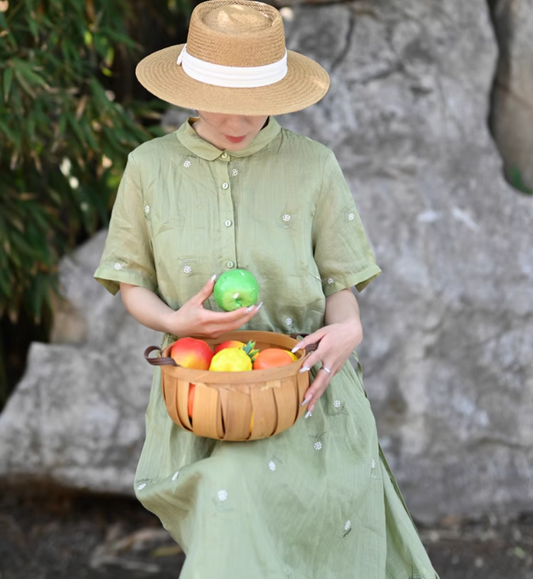 小ぶりな襟が可愛い◇ウエストギャザー 花柄刺繍 ラミーワンピース◇