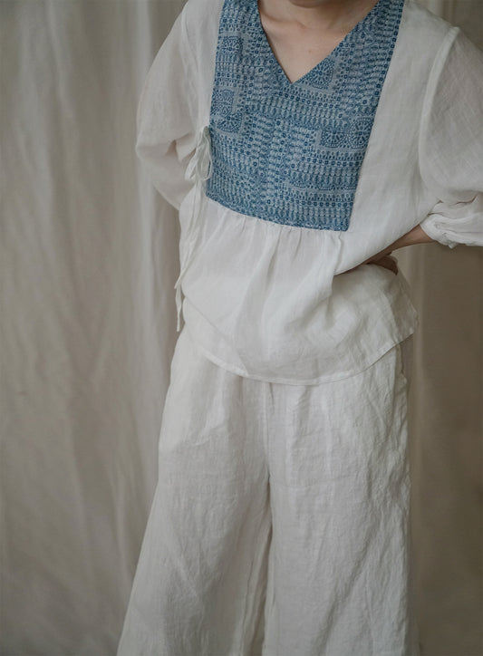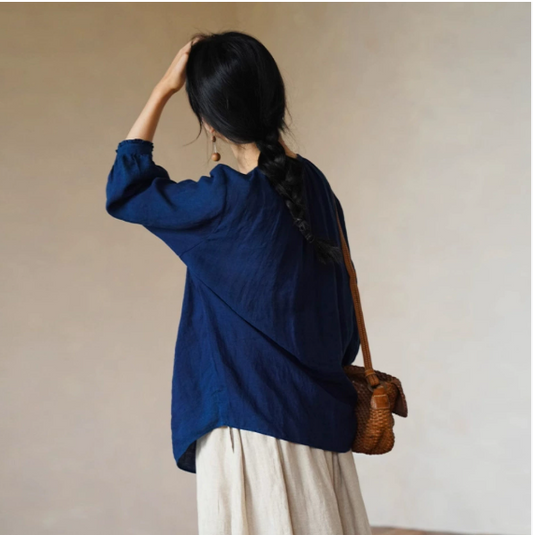 残りわずか✩インディゴ本藍染め✩フリル使いがポイント✩リネンシャツ✩