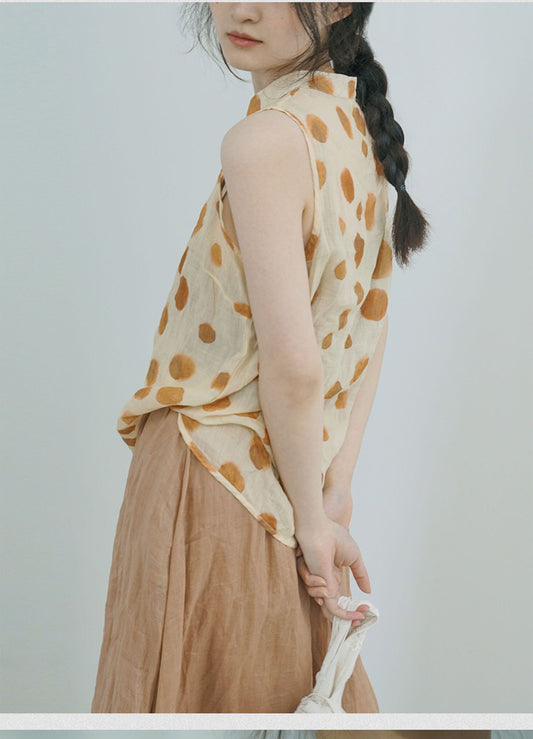 水彩タッチのドット柄プリント◇立ち襟ノースリーブ ラミーブラウス◇