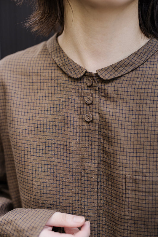 小ぶりな丸襟が可愛い◇ドロップショルダー格子柄リネンチェックシャツ◇