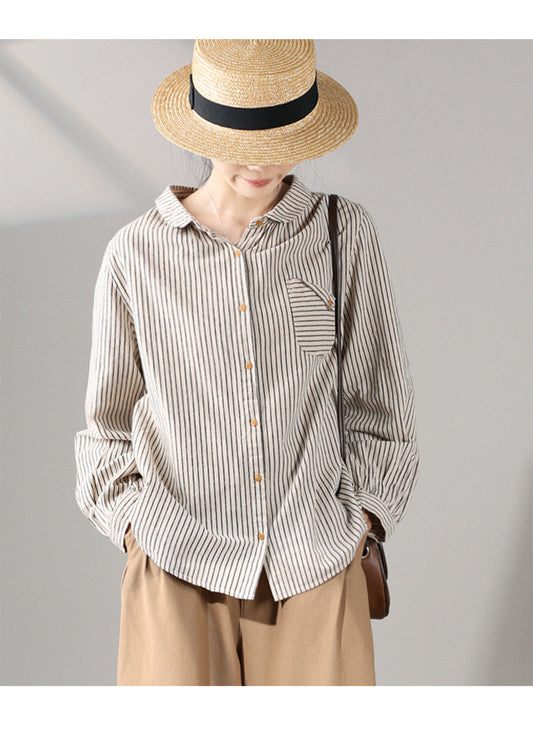 小ぶりな丸襟が可愛い◇リネンコットン ストライプ デザインポケット シャツ◇