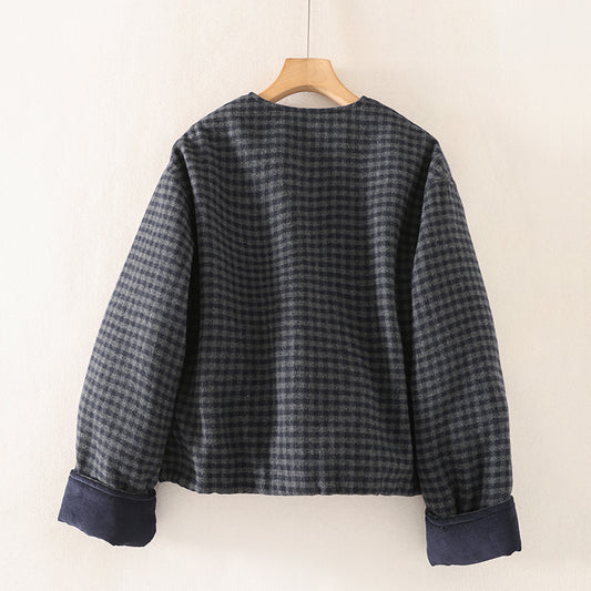 昨シーズン物売り切りセール◇ホワイトダックダウン使用◇ノーカラー チェックウール ダウンコート◇