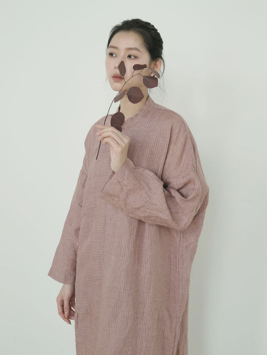 2色展開◇絶妙な色味のリネンストライプ◇オリエンタルデザイン ゆったりシルエット ロングスリーブ ワンピース◇