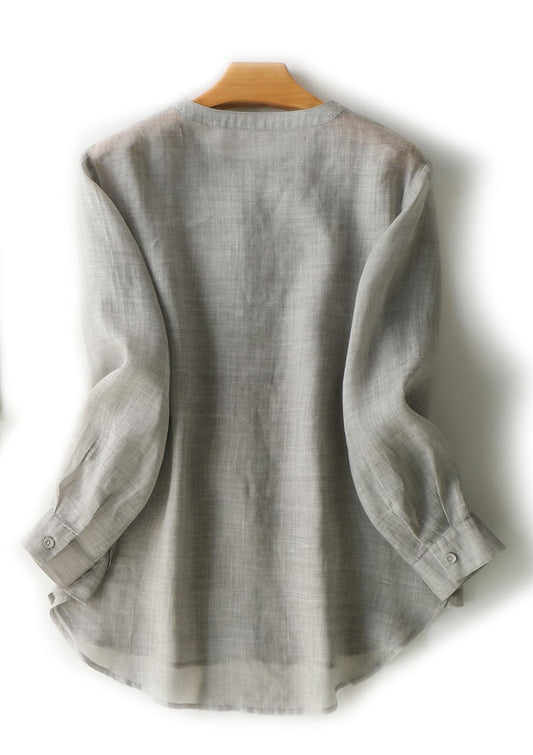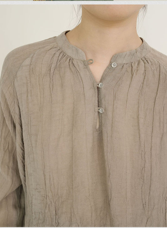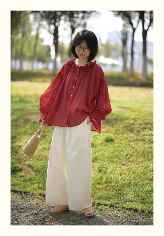 2色展開◇フリルネック リネンコットン ブラウス◇
