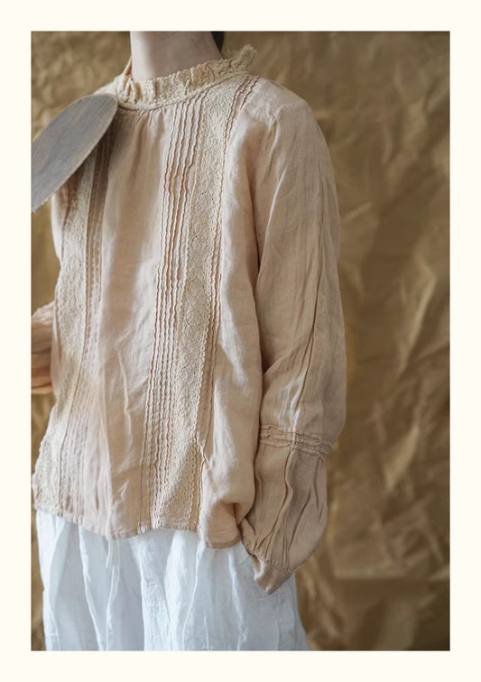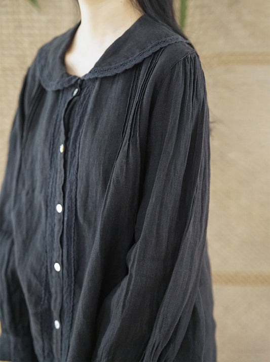 2色展開◇レース&ピンタック リネン 丸襟ブラウス◇