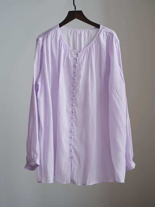 2色展開◇身幅ゆったりシルエット◇くるみボタンによる装飾が可愛いラミーギャザーシャツ◇