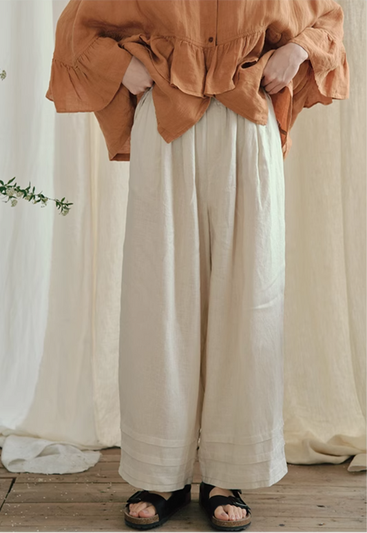 3色展開◇リネン100%◇裾レイヤーデザイン ワイド イージーパンツ◇