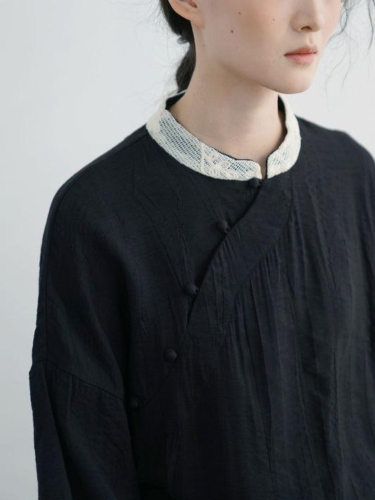 3色展開◇オリエンタルデザイン レース装飾 ドロップショルダー バンドカラー シャツ◇