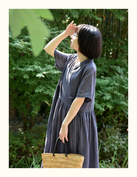 2色展開✩ショールカラー ウエストギャザー ラミー カシュクール ドレス ✩
