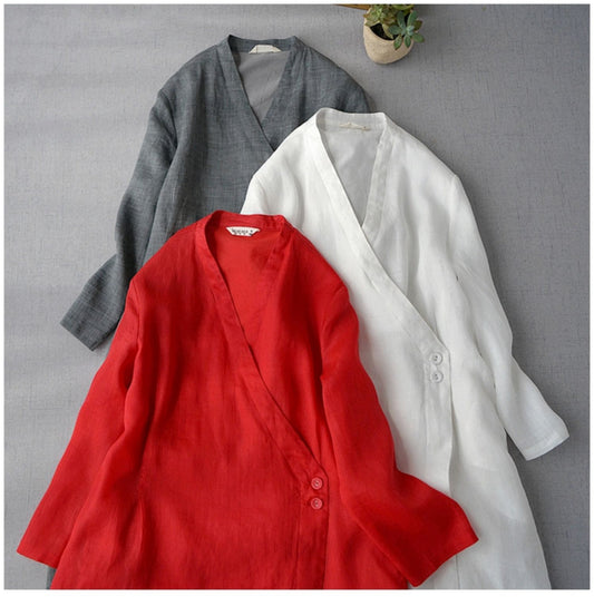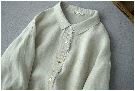 3色展開★切りっぱなしにステッチングがポイント★リネン デザインブラウス★シャツ