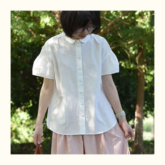 3色展開◇高密度コットン 小さいな襟がかわいいハーフスリーブシャツ◇ホワイト
