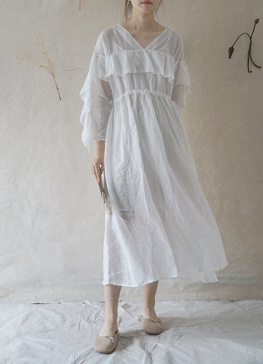 1点のみスペシャルSALE◇たっぷりフリル装飾がアクセントに◇Vネック ラミーロングワンピース◇
