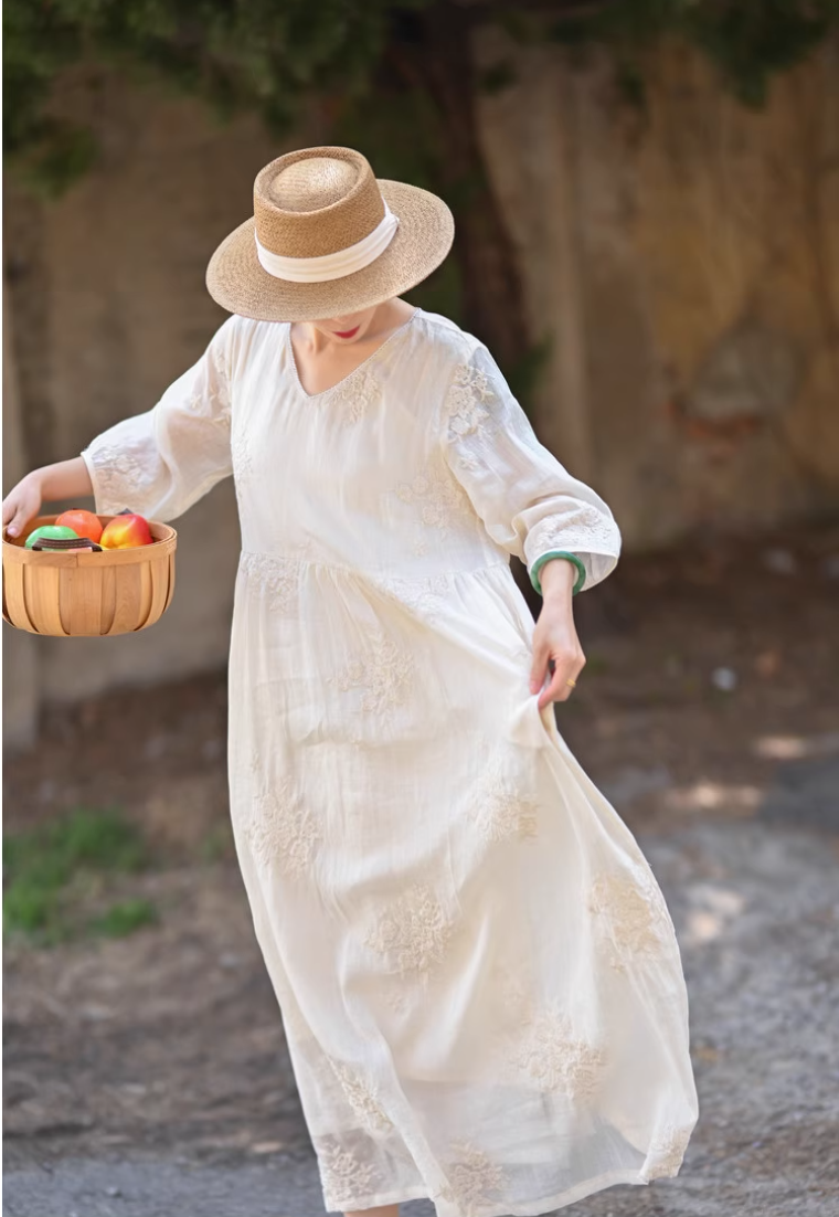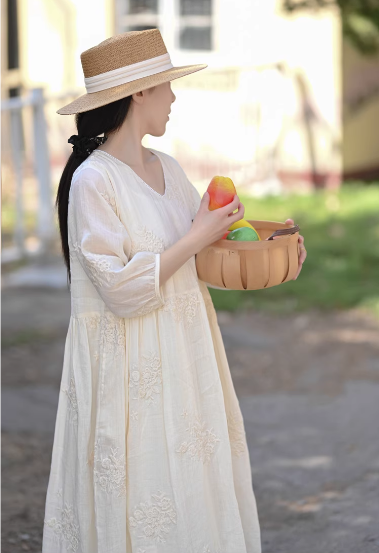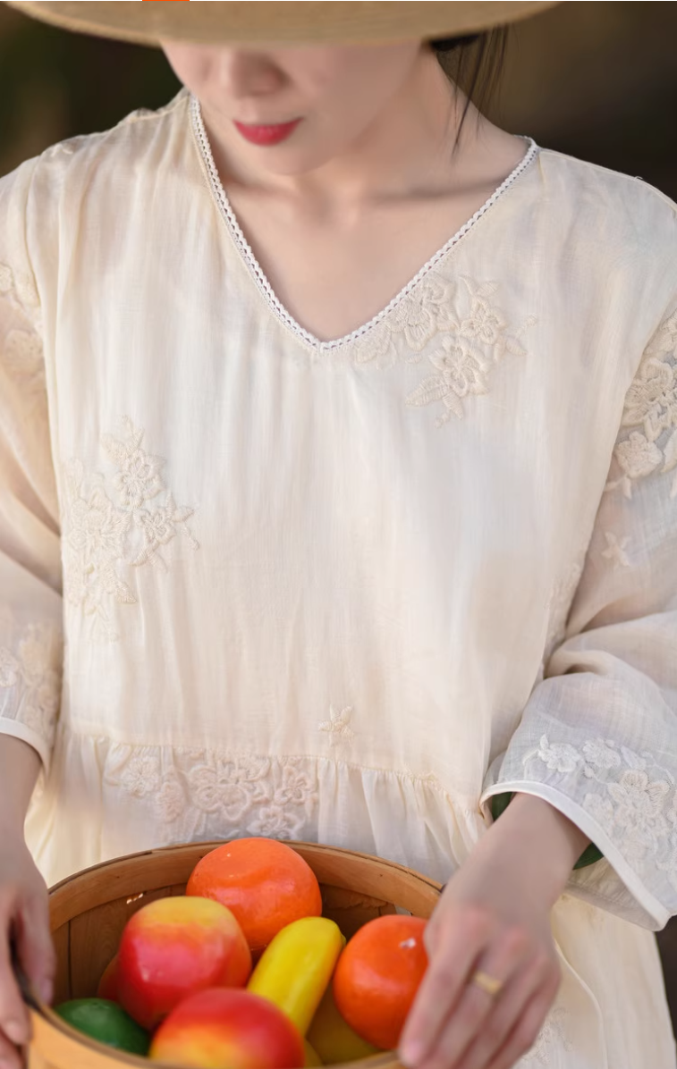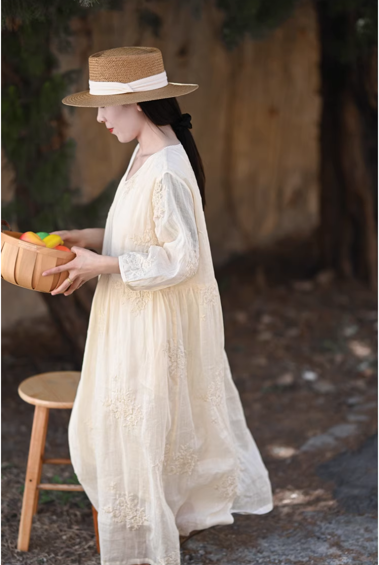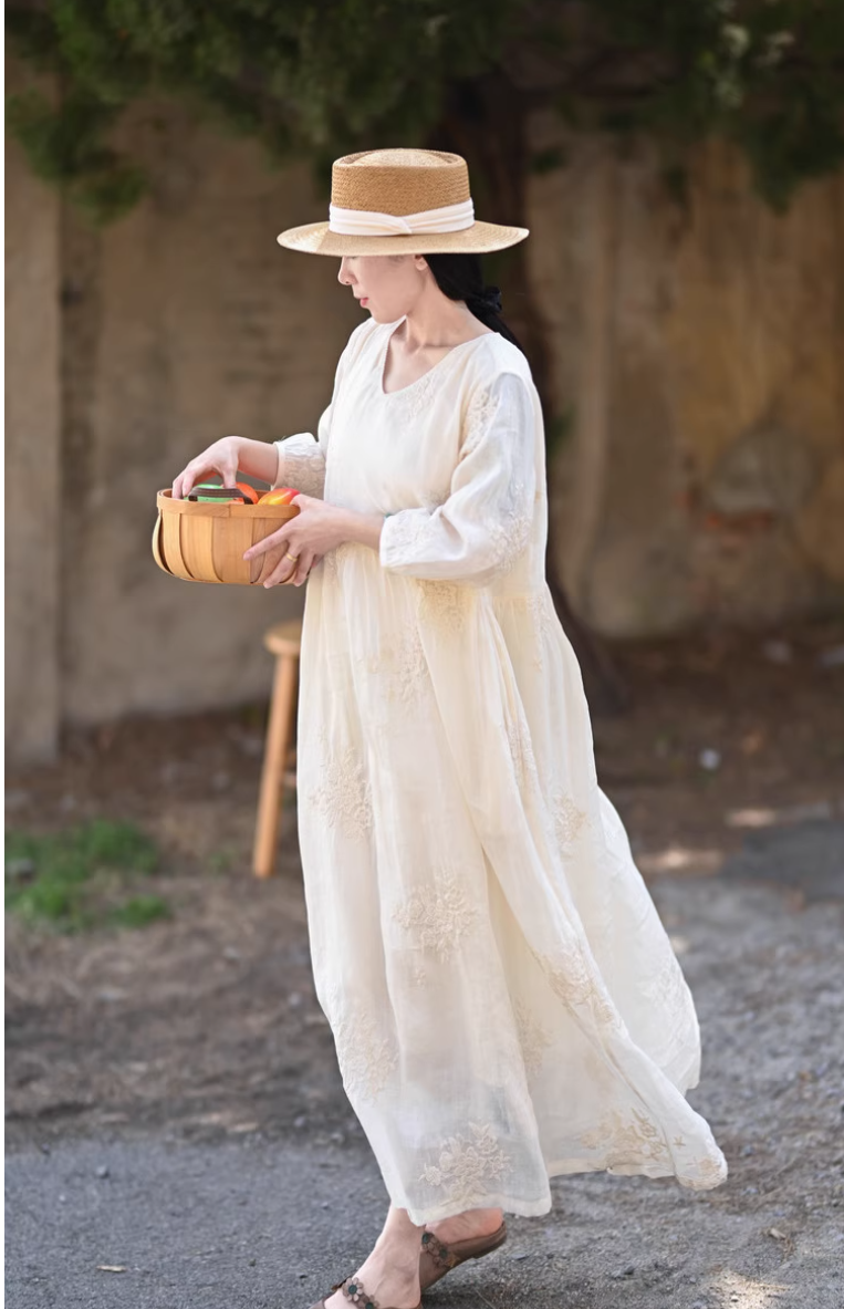 ◇ウエストギャザー 花柄刺繍 ラミーワンピース◇