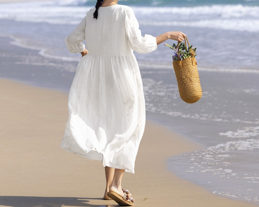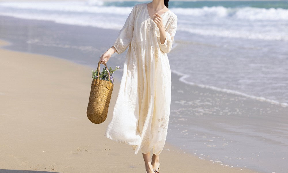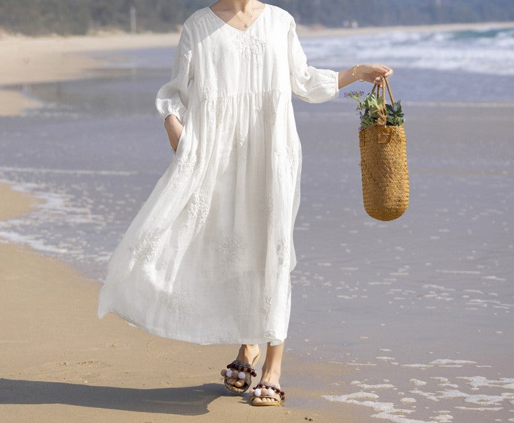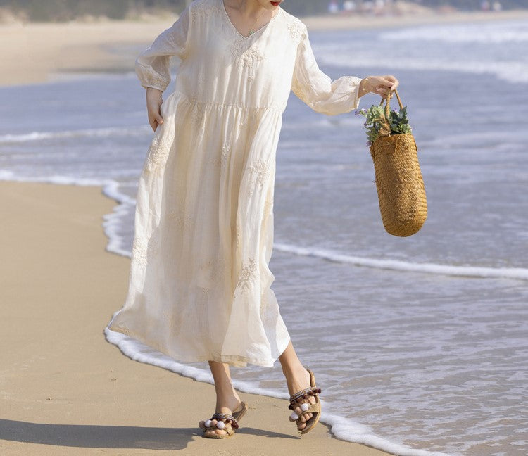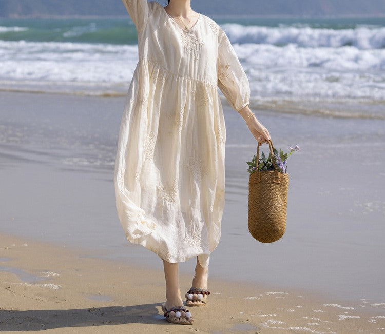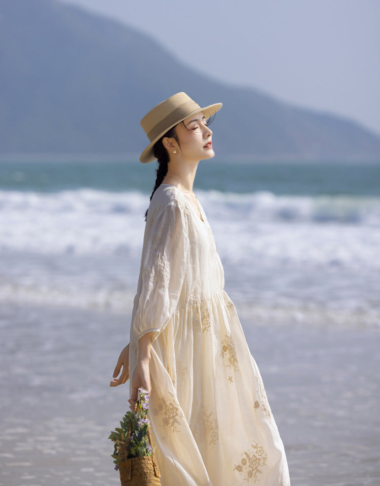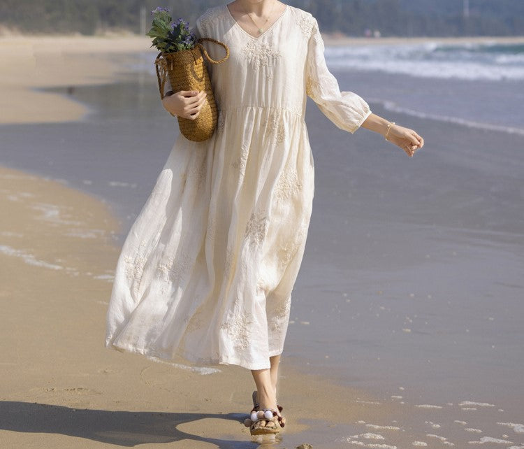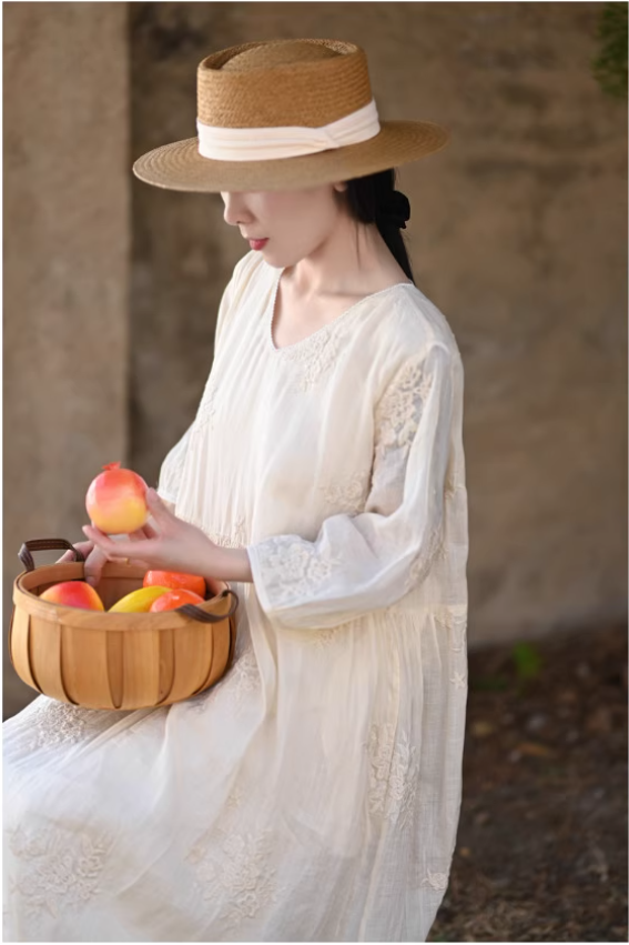 ◇ウエストギャザー 花柄刺繍 ラミーワンピース◇