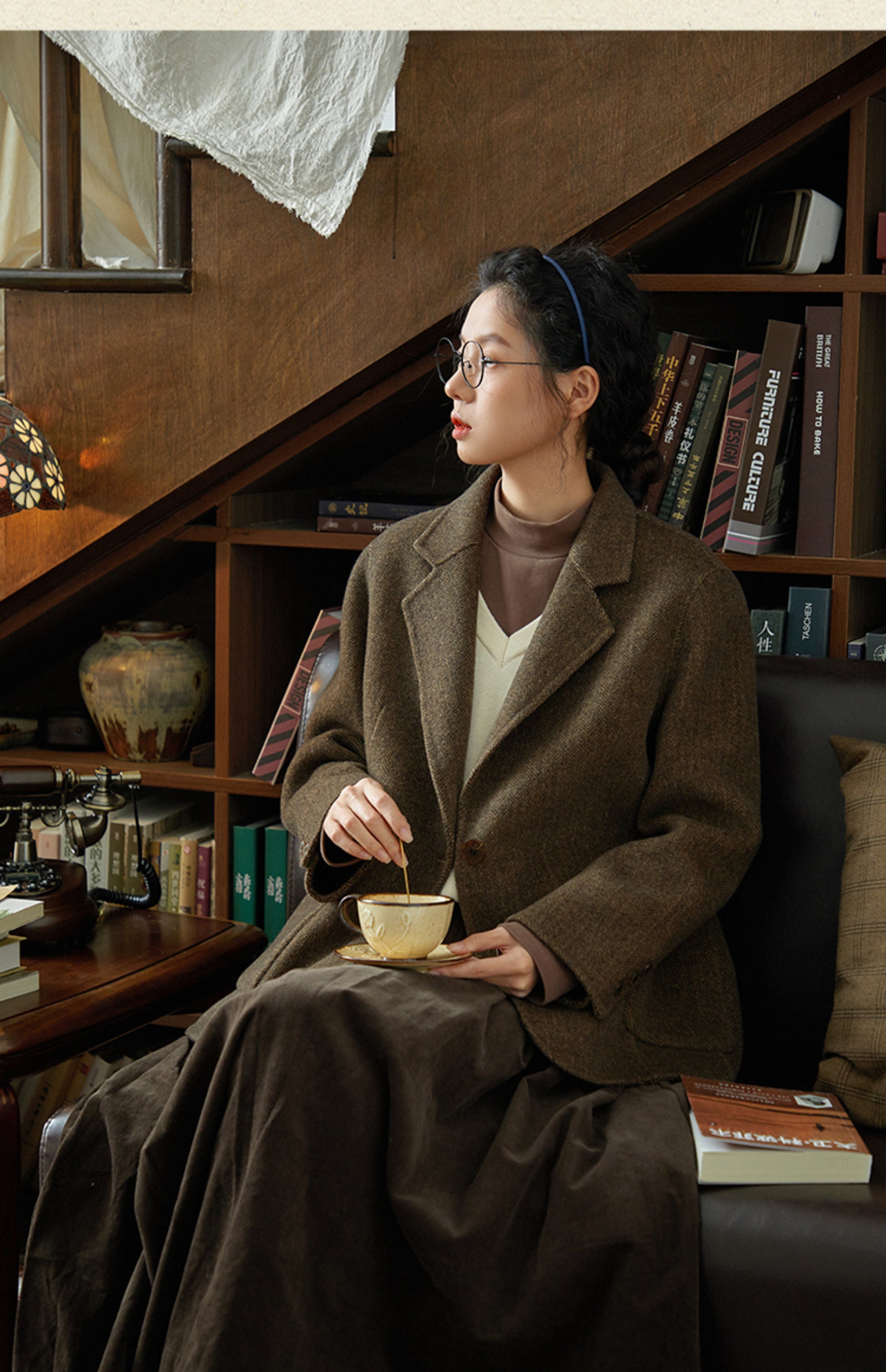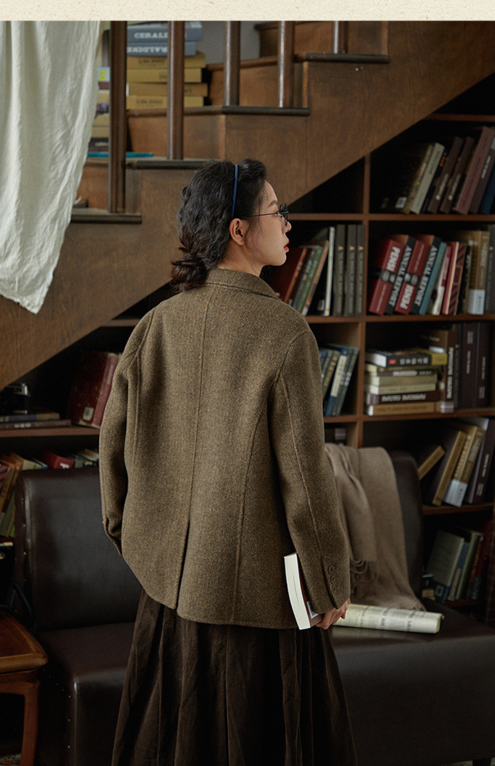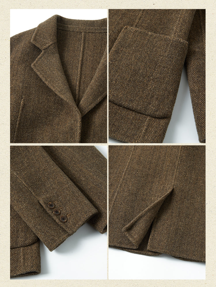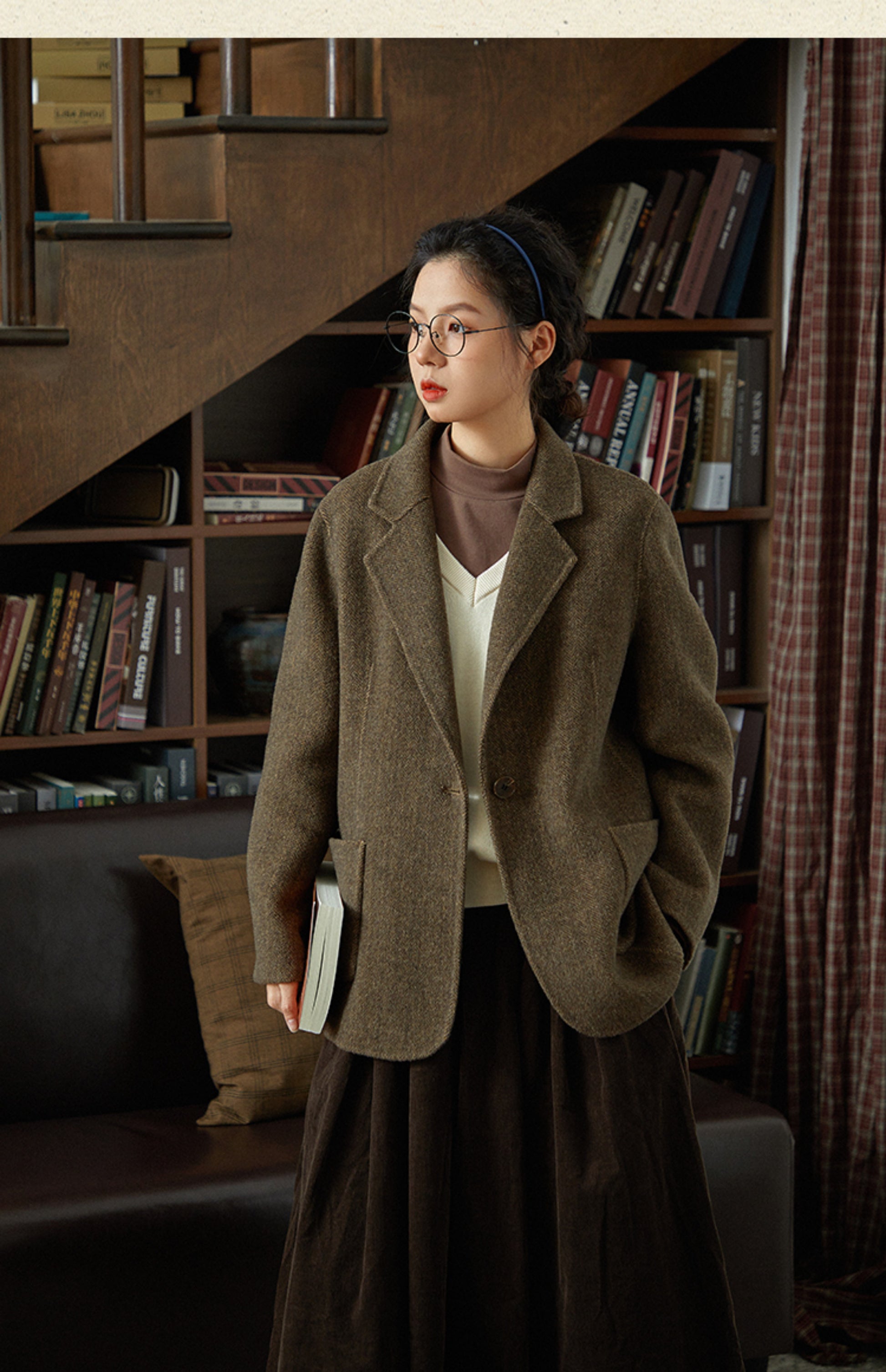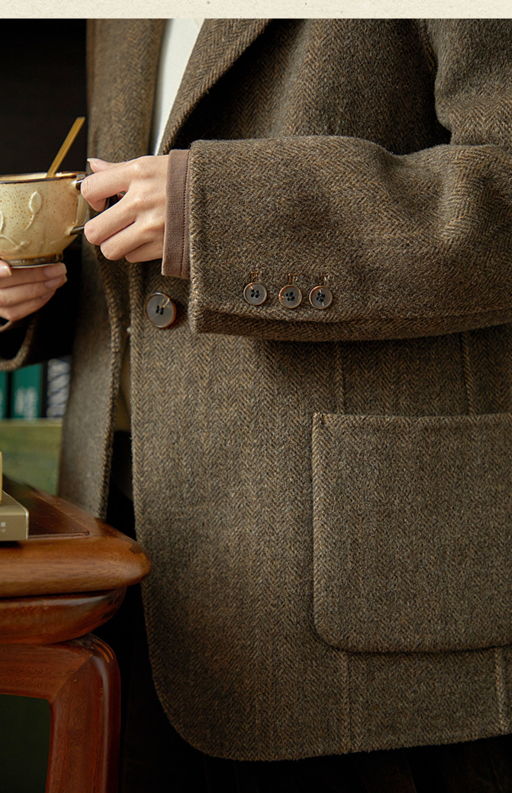 ジャストサイズで着て綺麗なシルエット△渋い色味のヘリンボーンウール100% 1つボタン テーラード ジャケット△