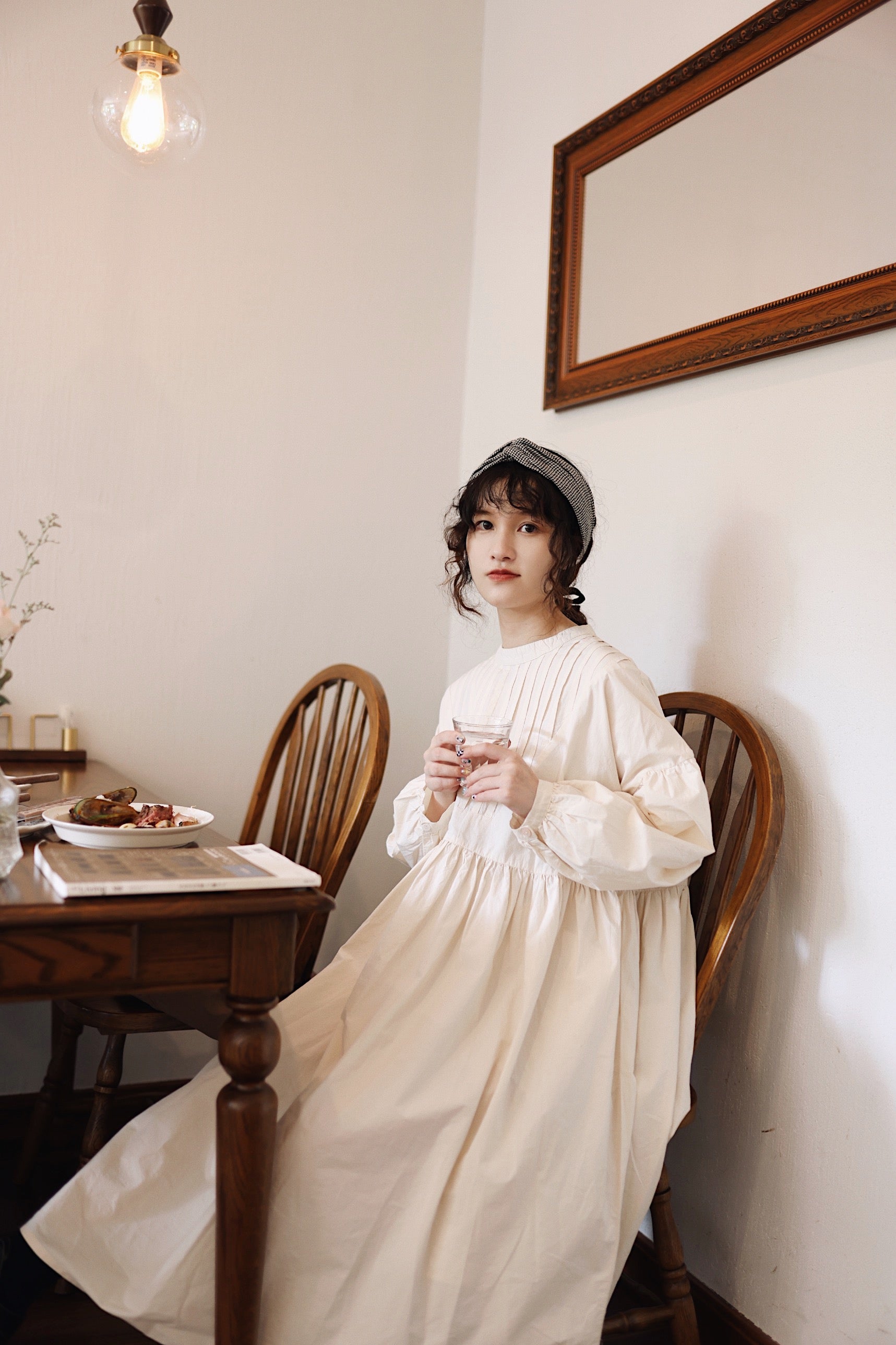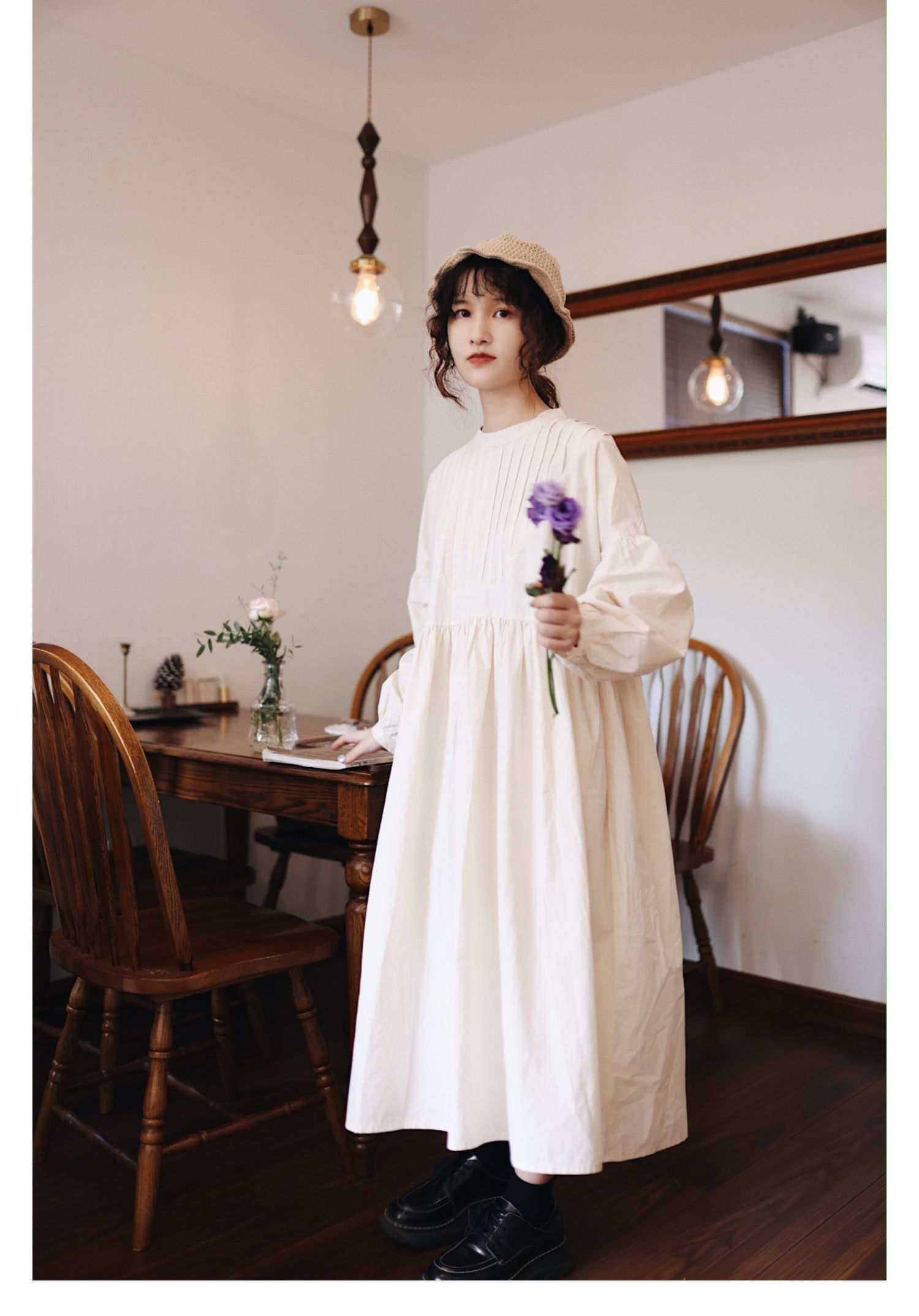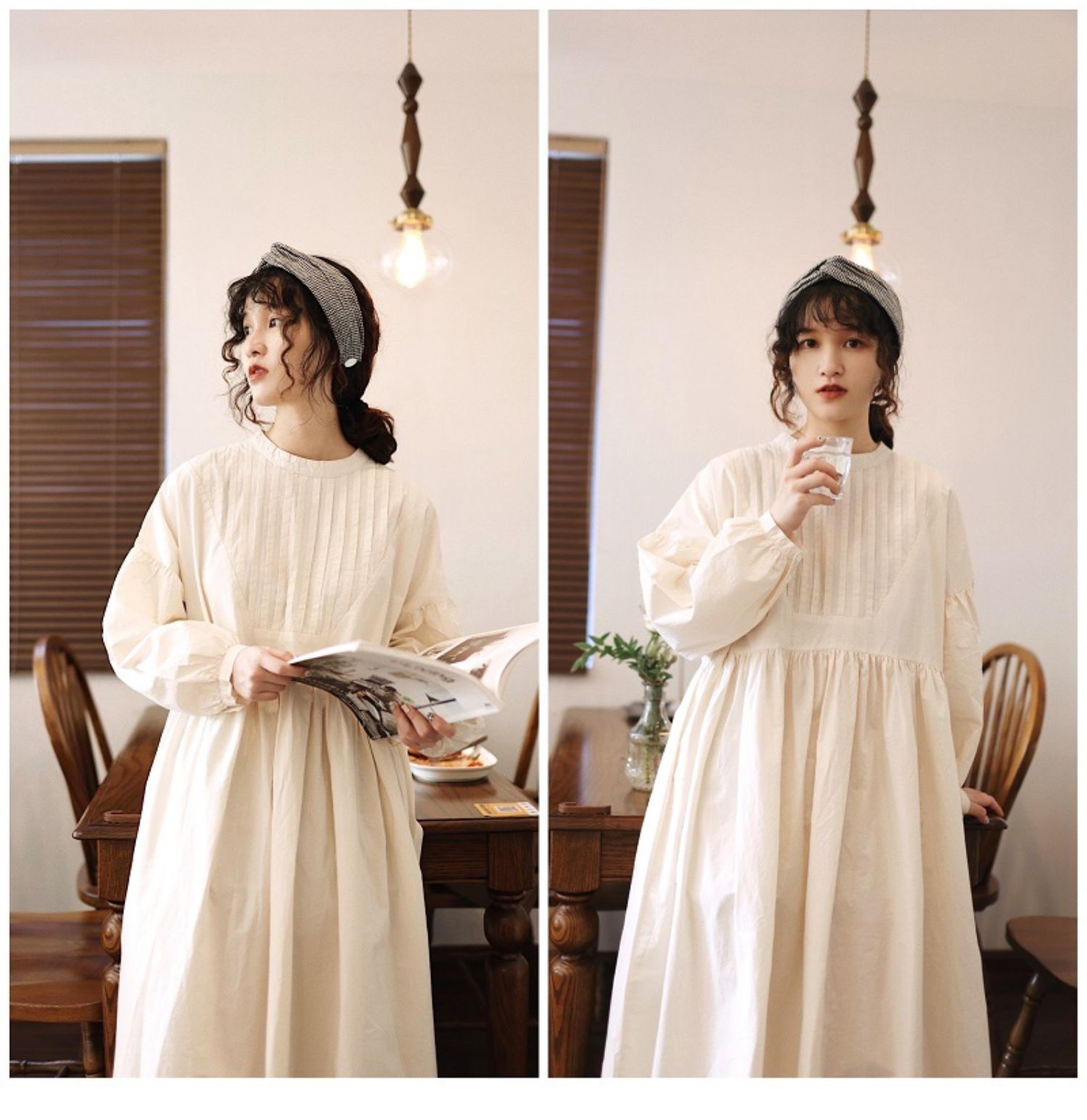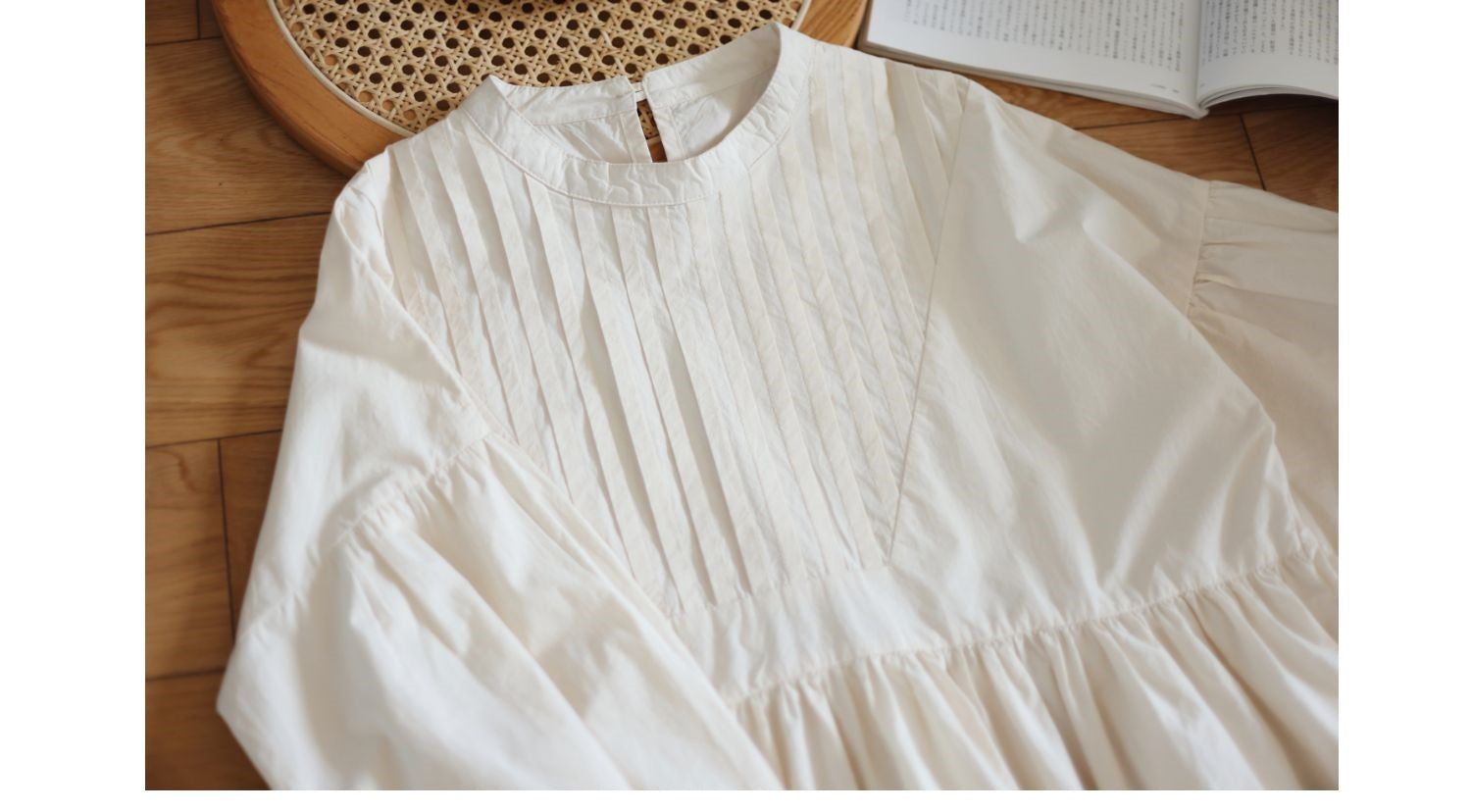 ピンタックとギャザー装飾が美しい△タイプライターコットン ロングワンピース△
