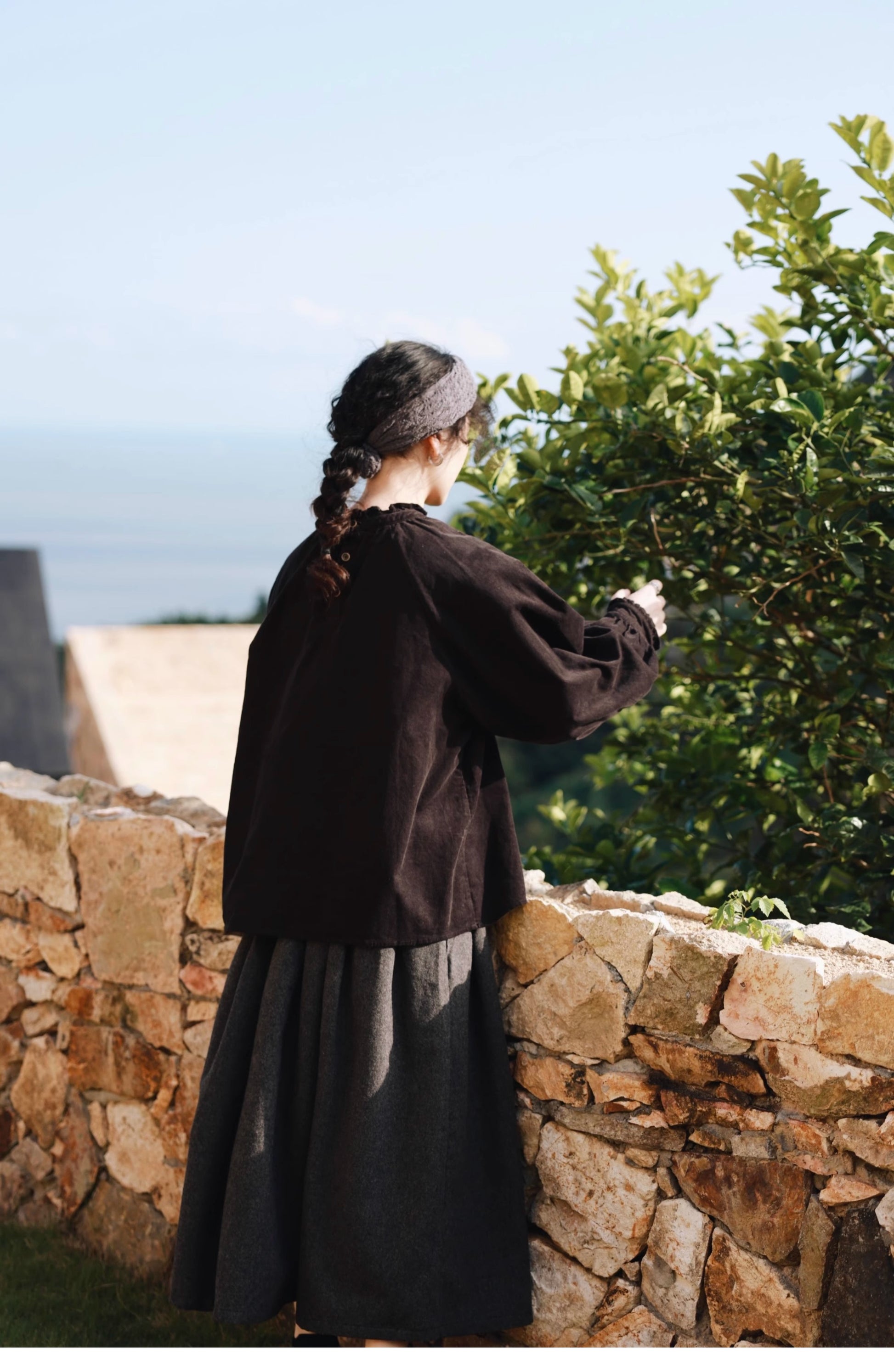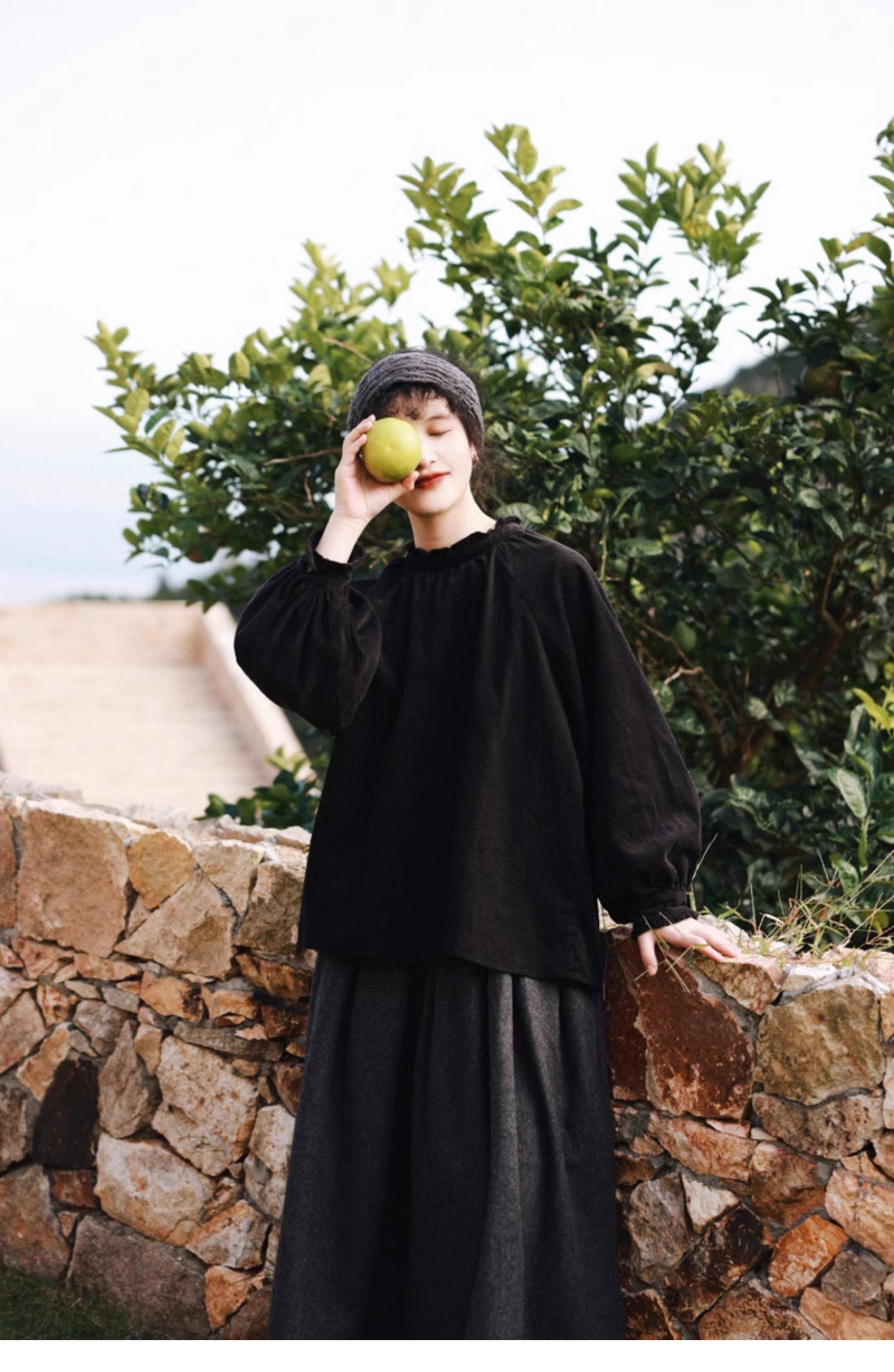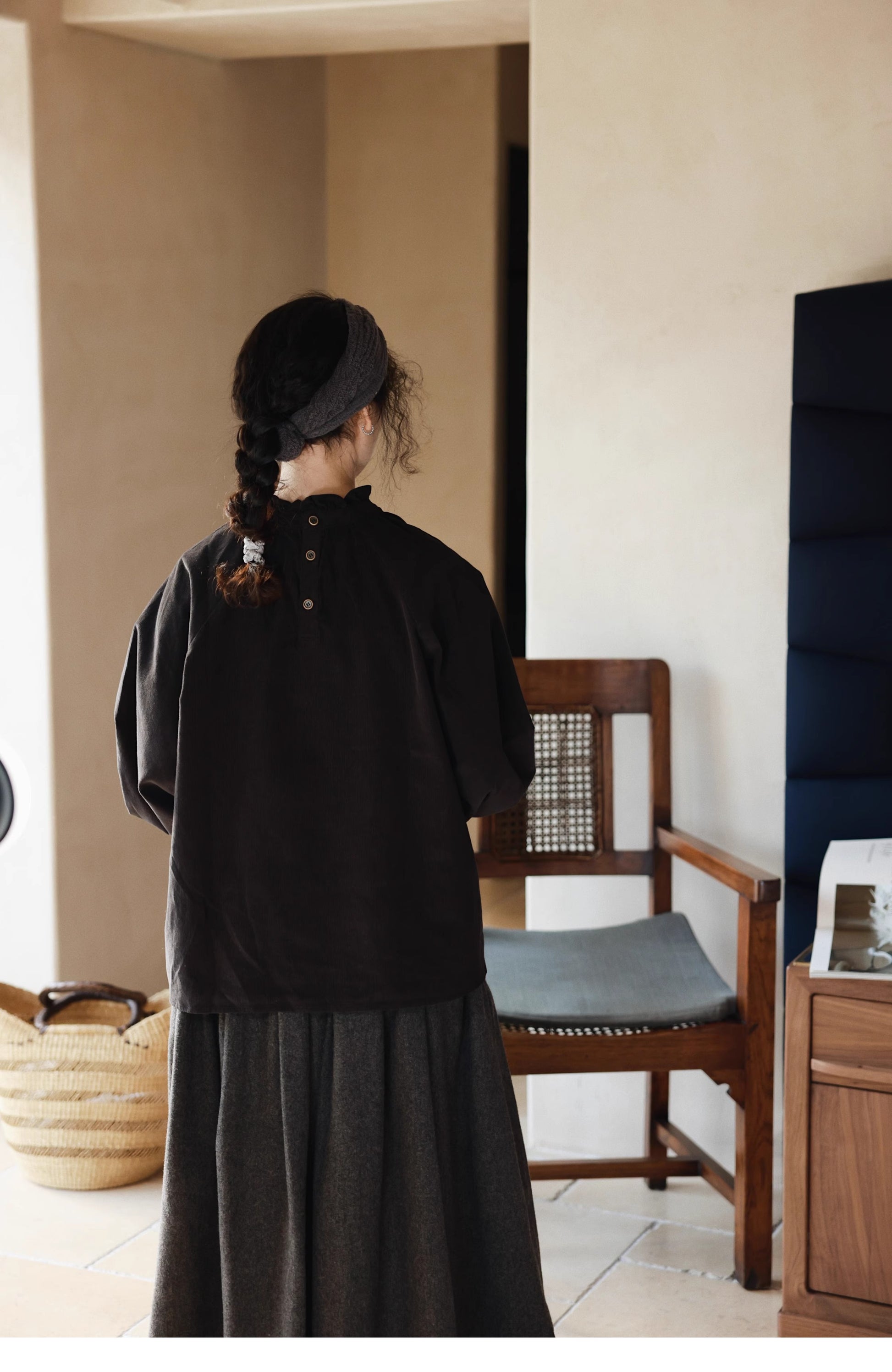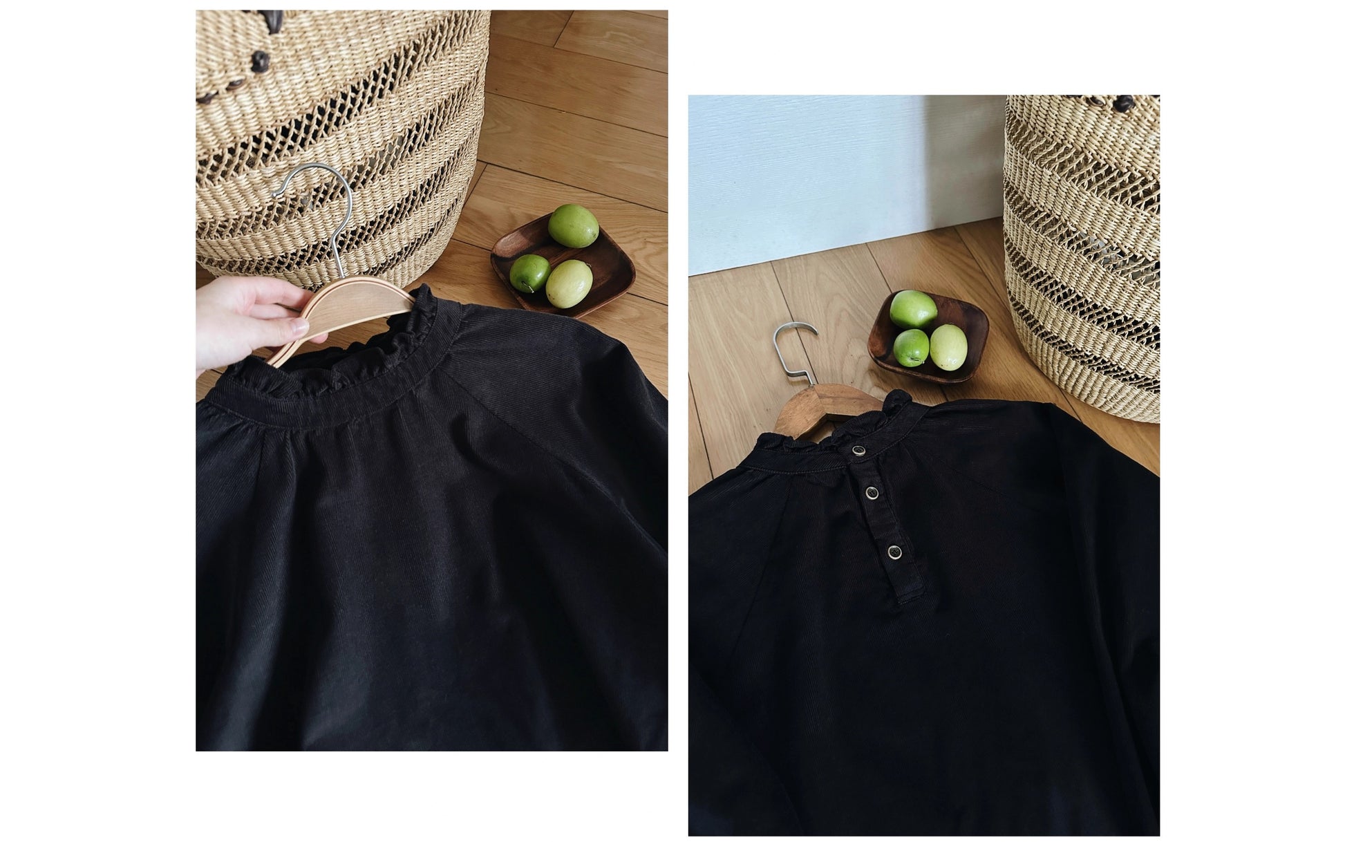 ◆ドロップショルダー フリルネックリネン バックボタン ブラウス◆