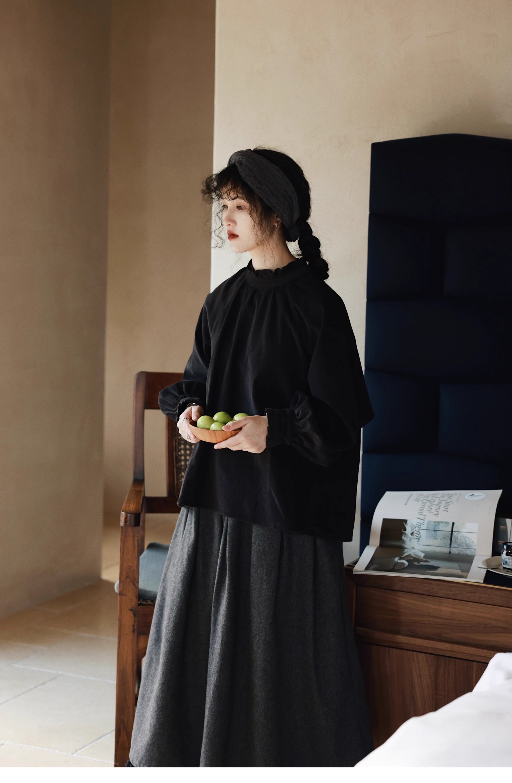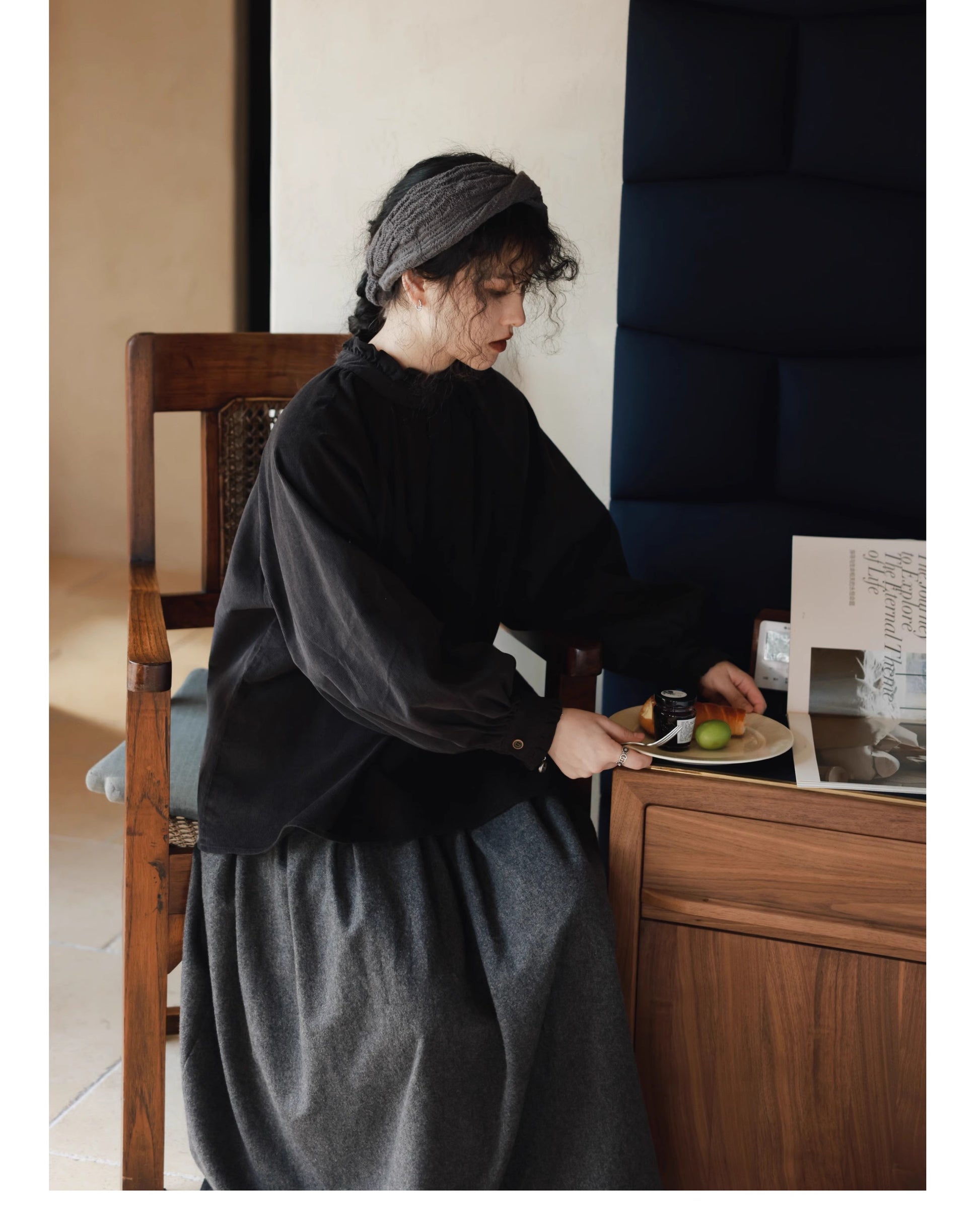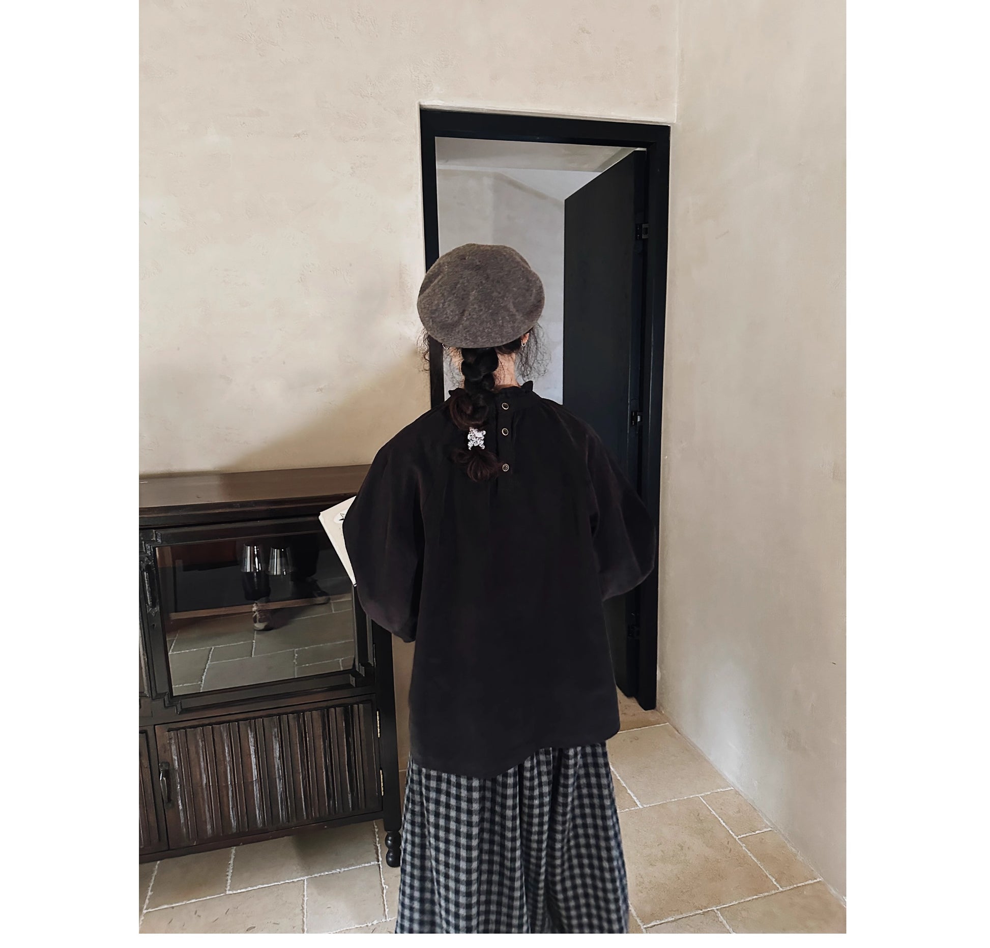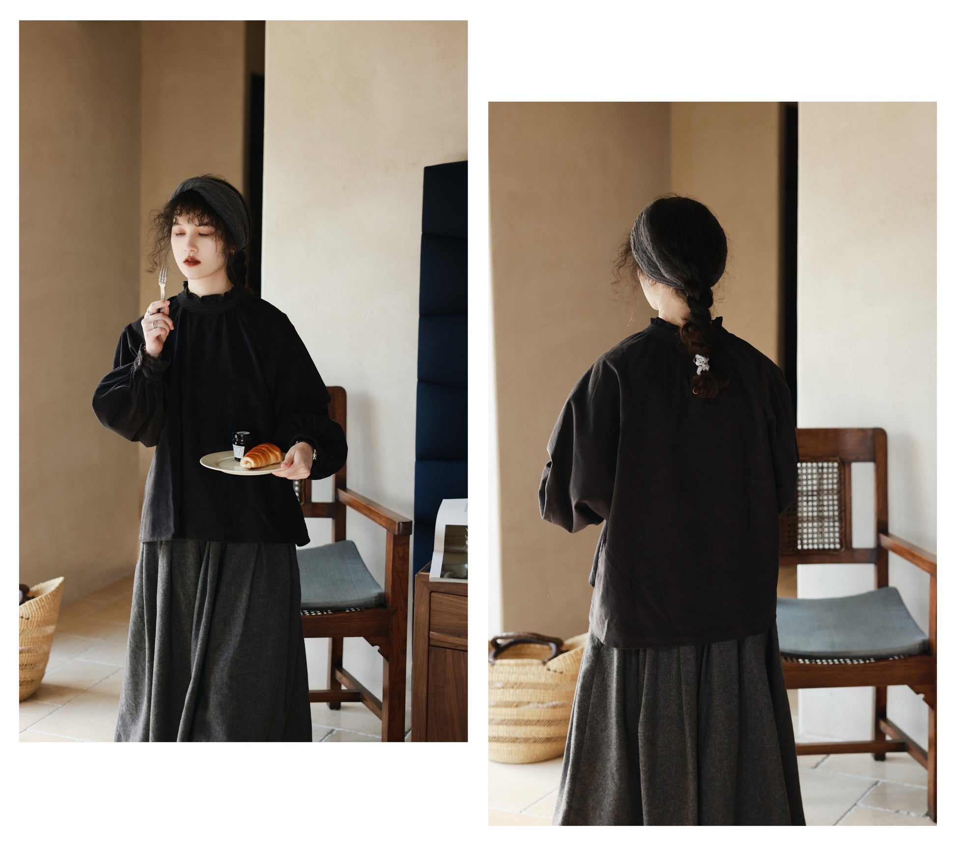 ◆ドロップショルダー フリルネックリネン バックボタン ブラウス◆