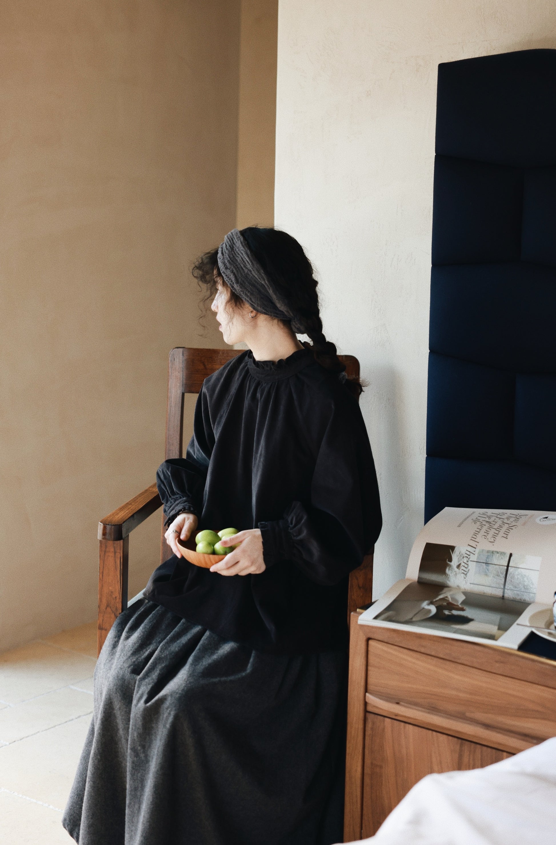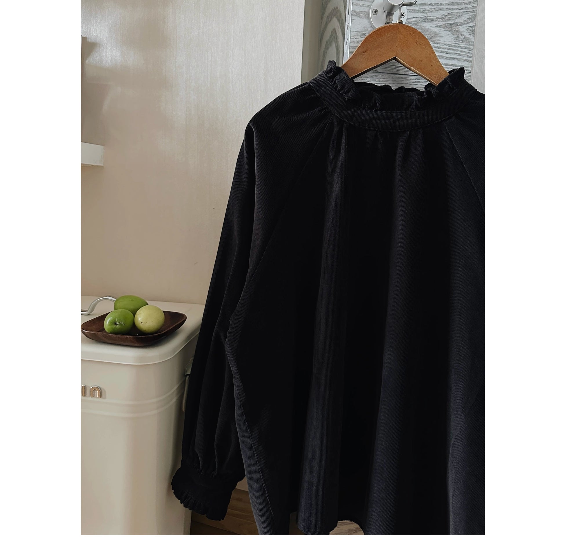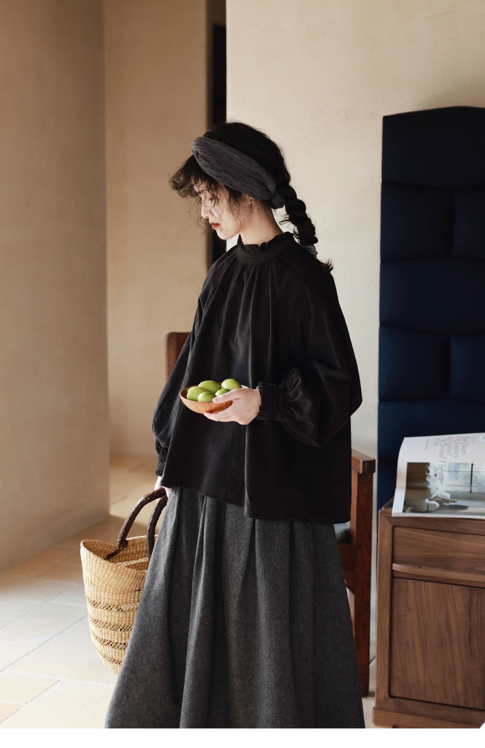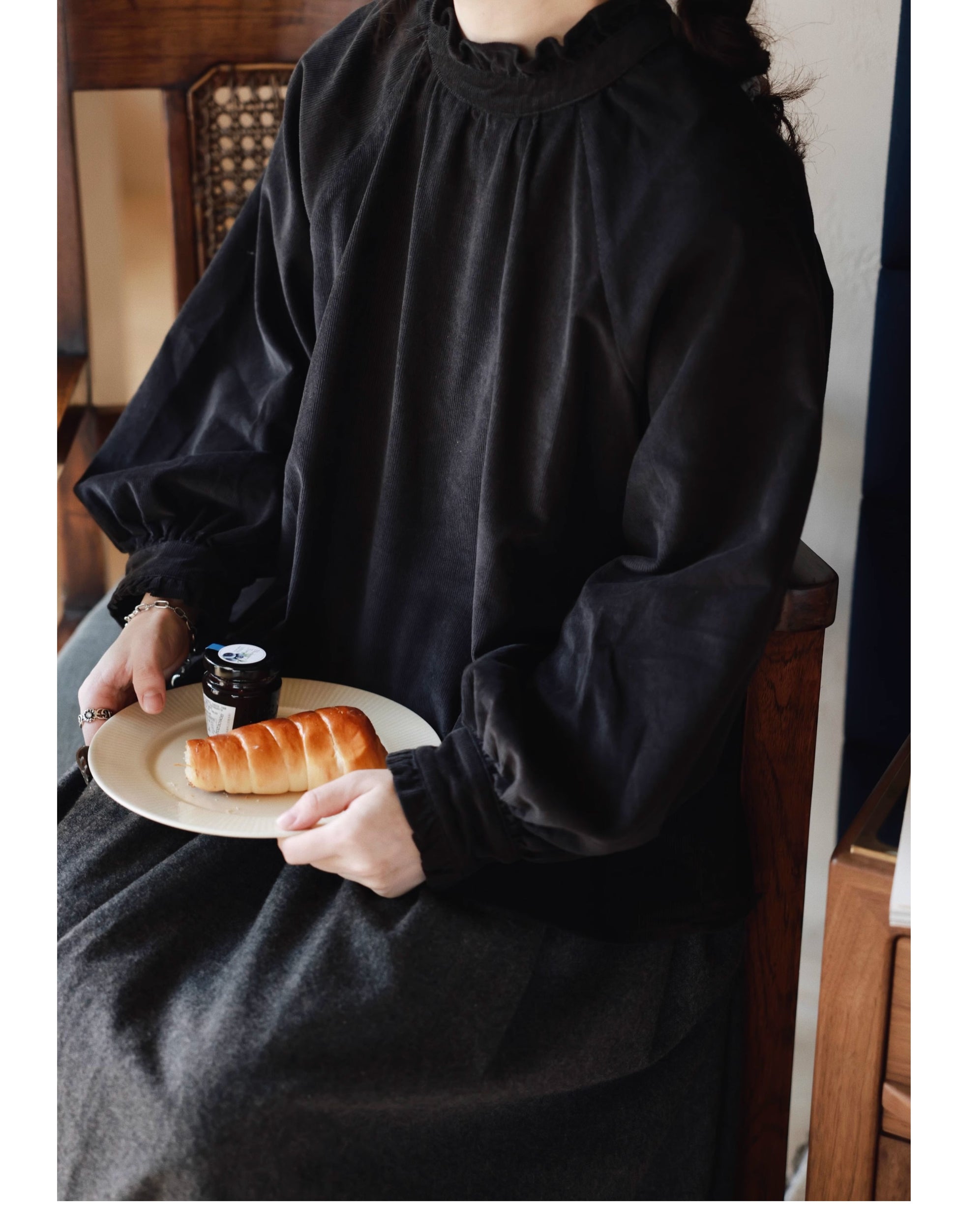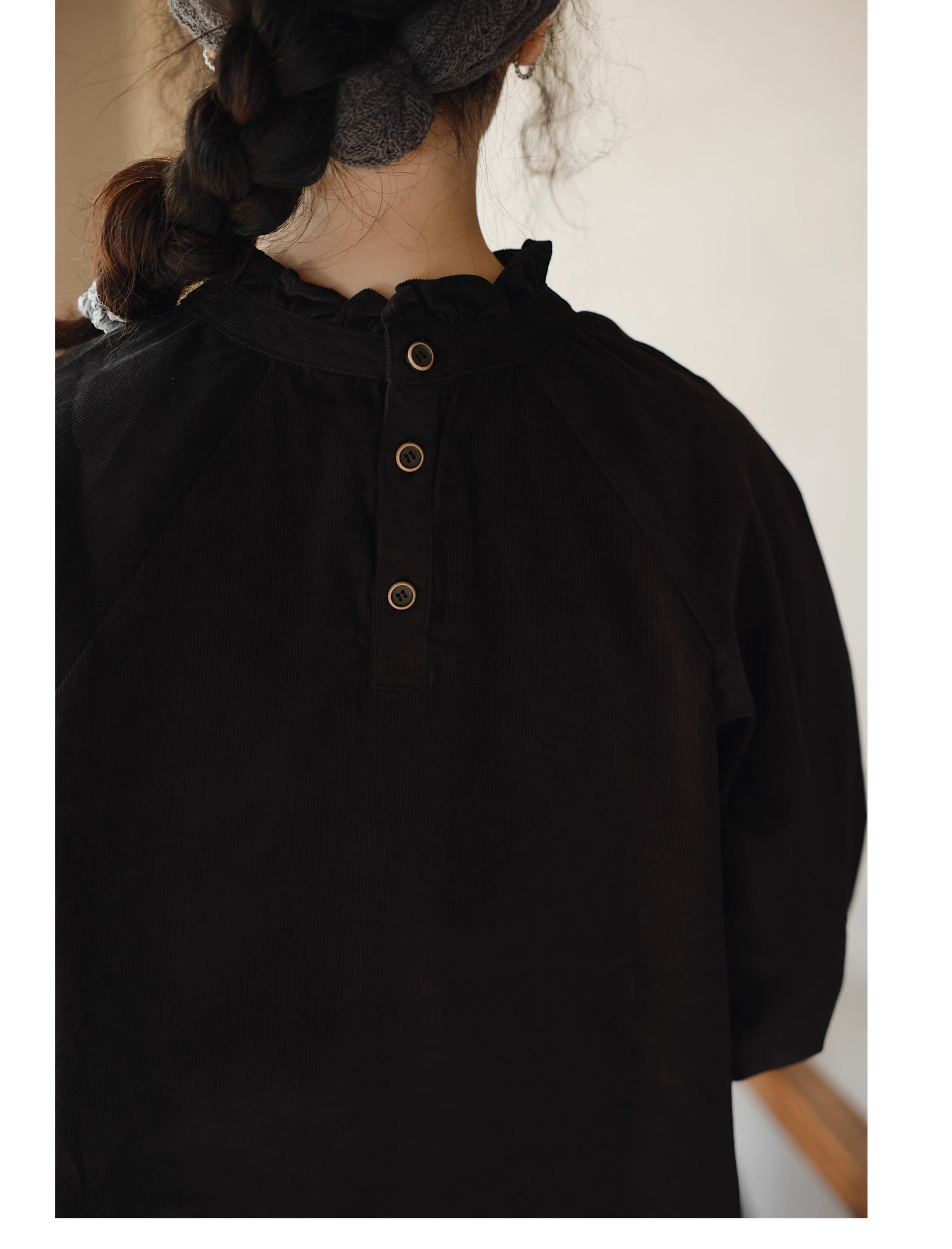 ◆ドロップショルダー フリルネックリネン バックボタン ブラウス◆