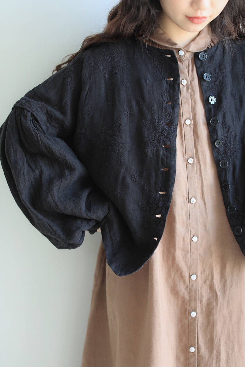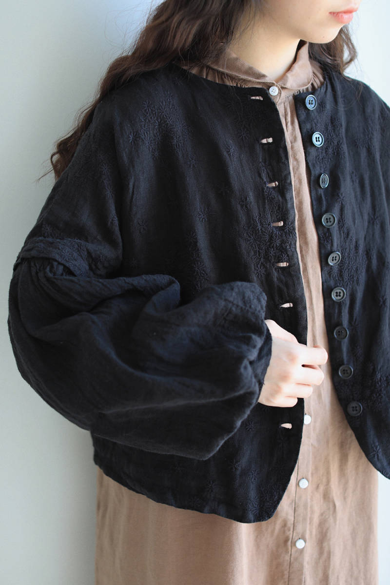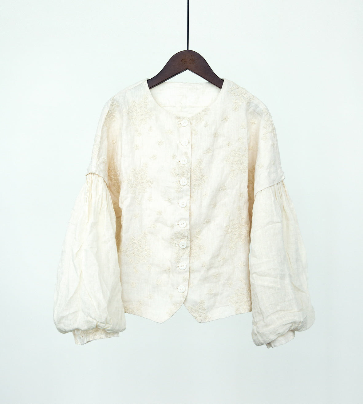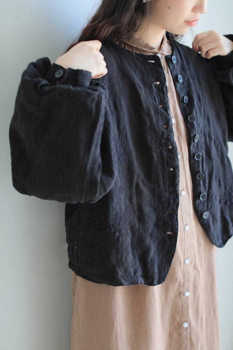 3色展開△ボタニック同色刺繍がエレガント▽リネンノーカラードロップショルダージャケット△裏地付き