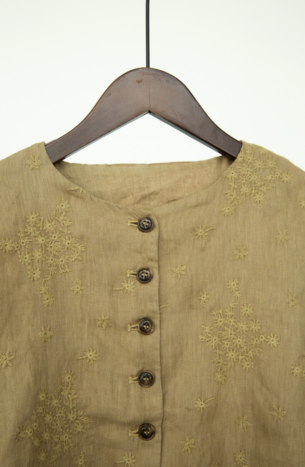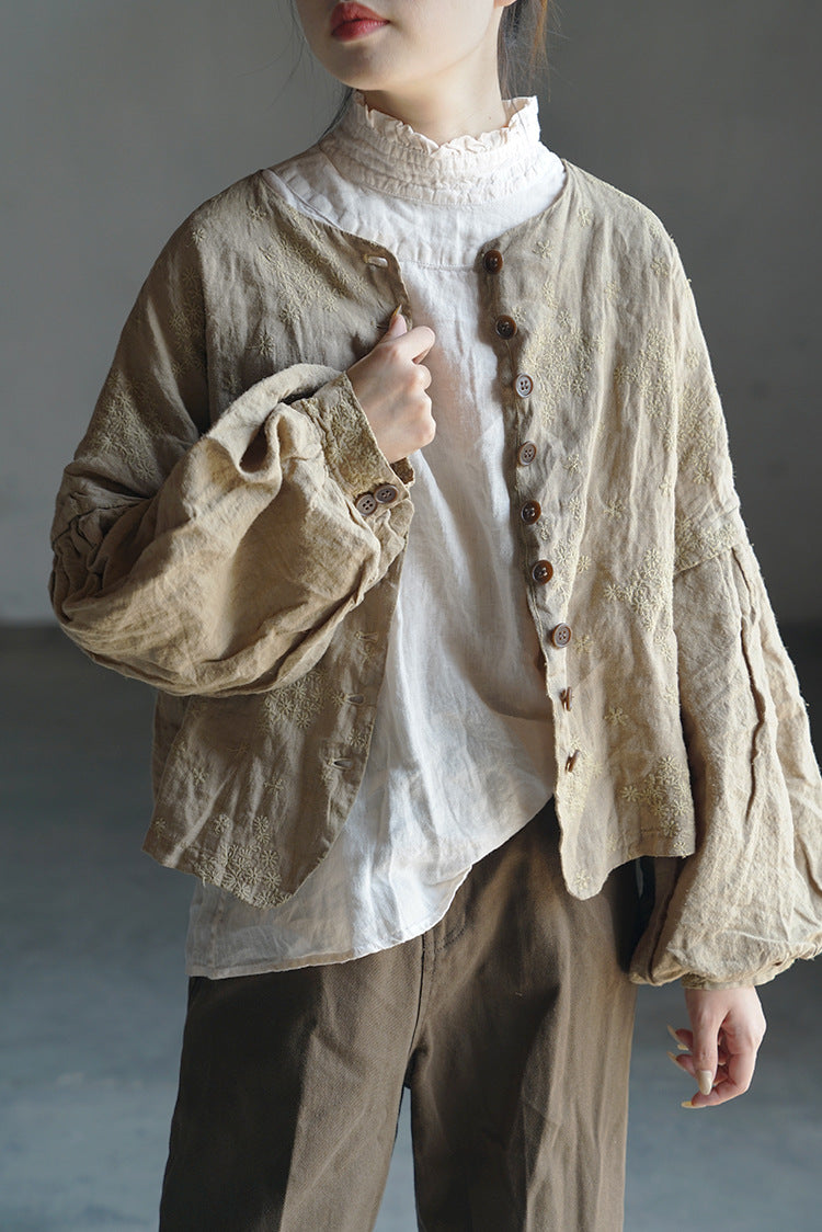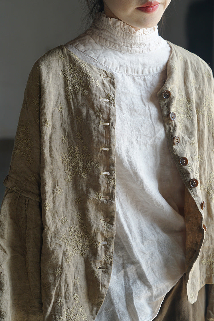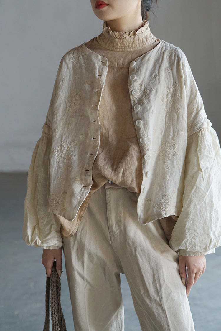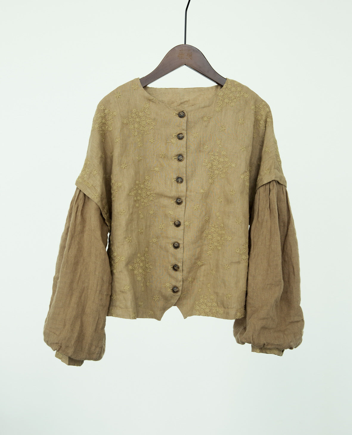 3色展開△ボタニック同色刺繍がエレガント▽リネンノーカラードロップショルダージャケット△裏地付き