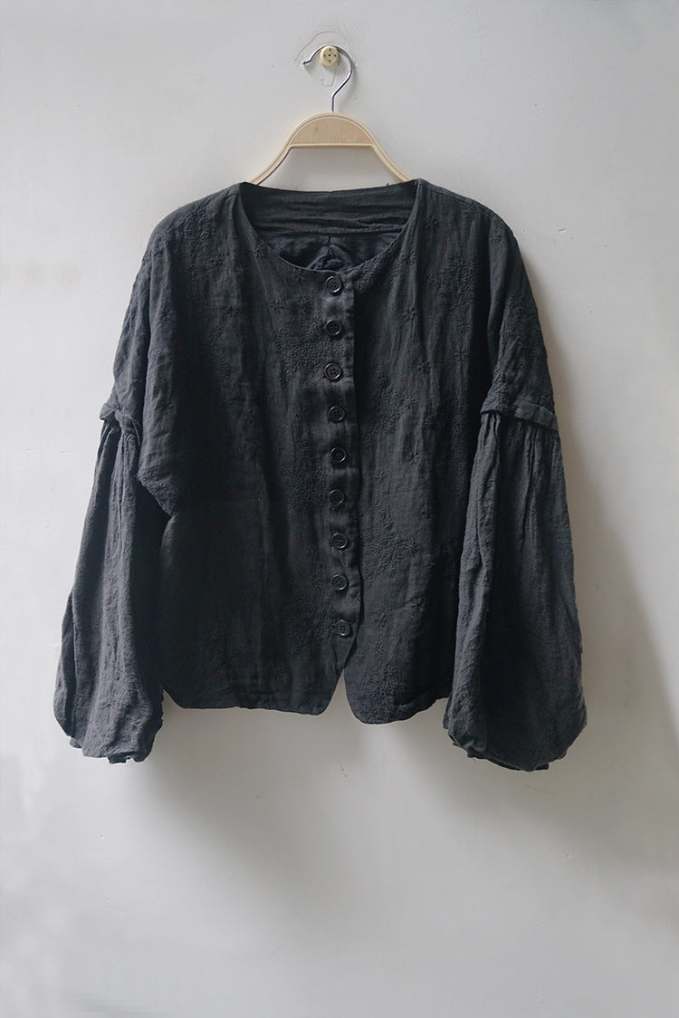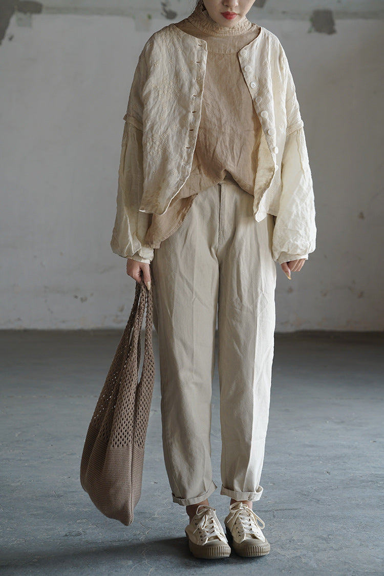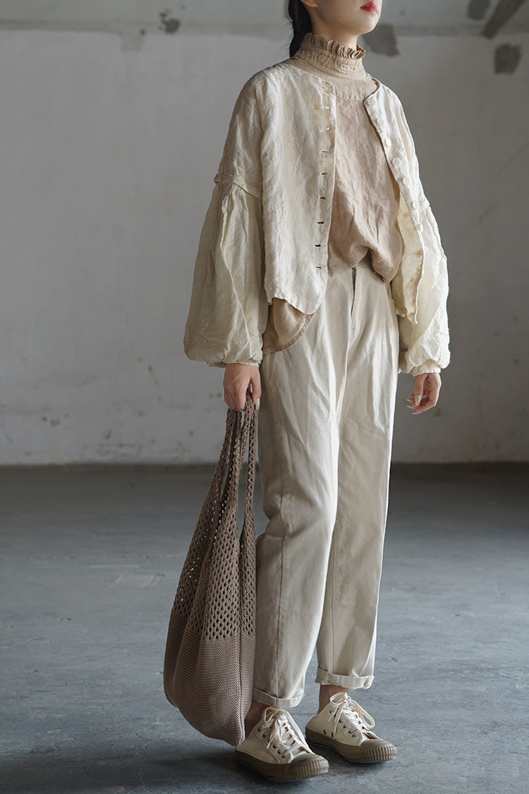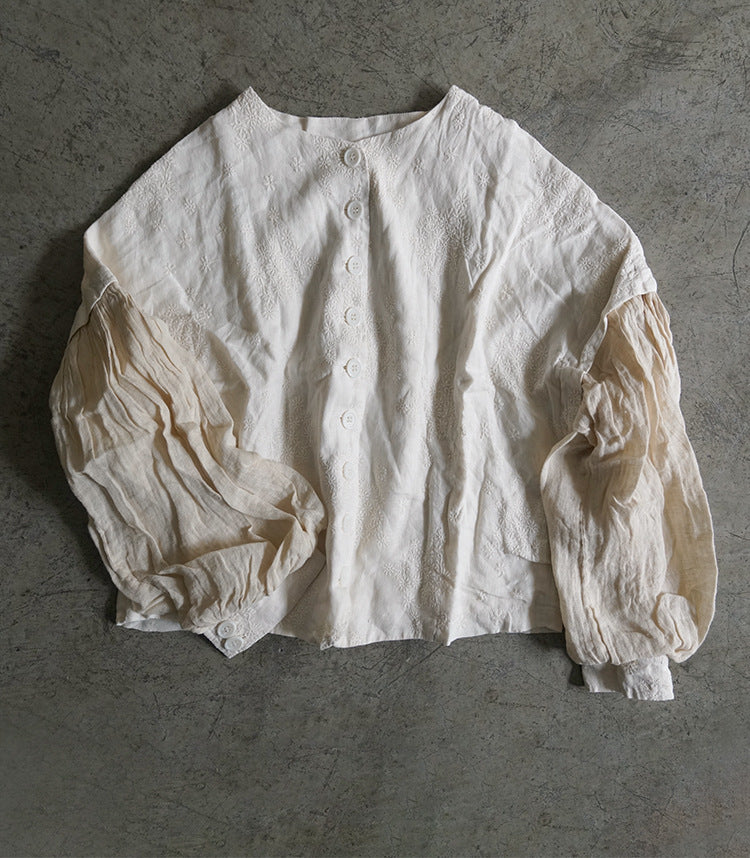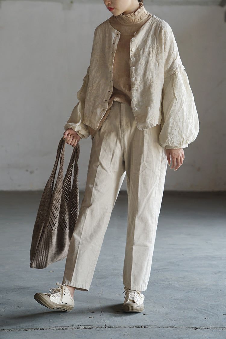 3色展開△ボタニック同色刺繍がエレガント▽リネンノーカラードロップショルダージャケット△裏地付き