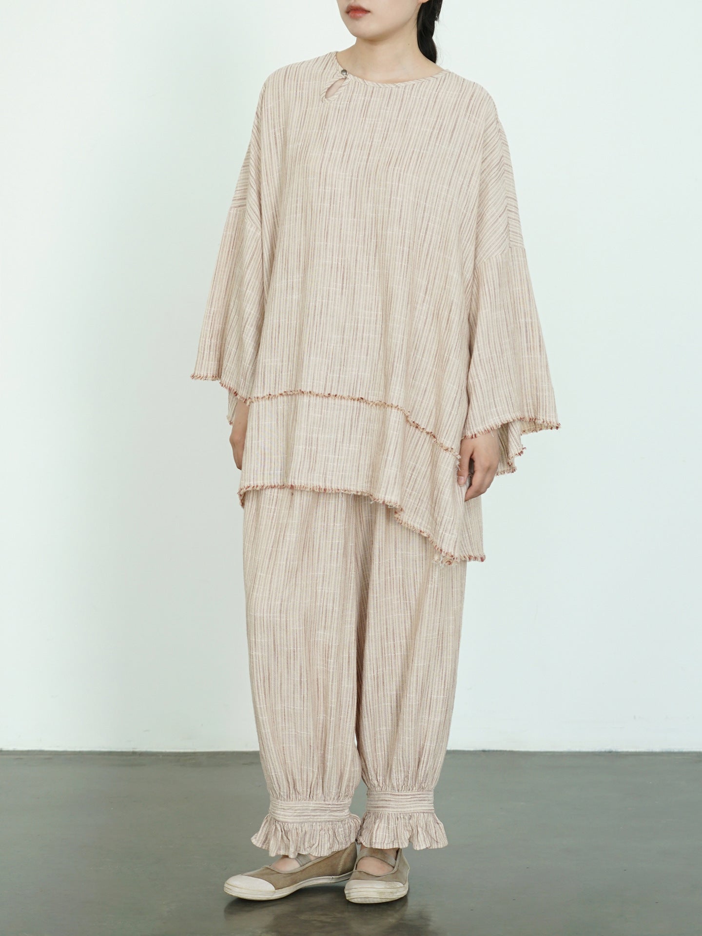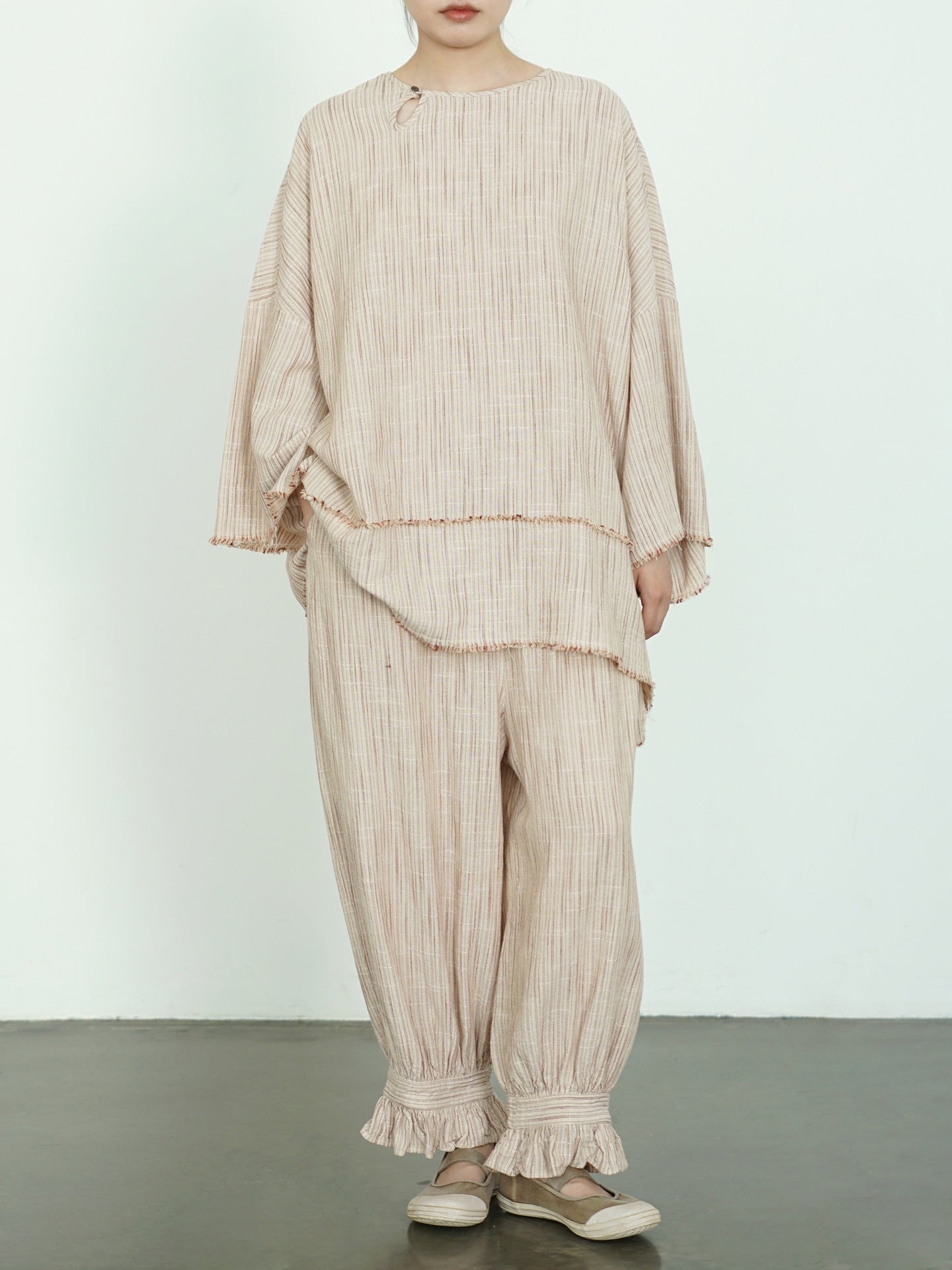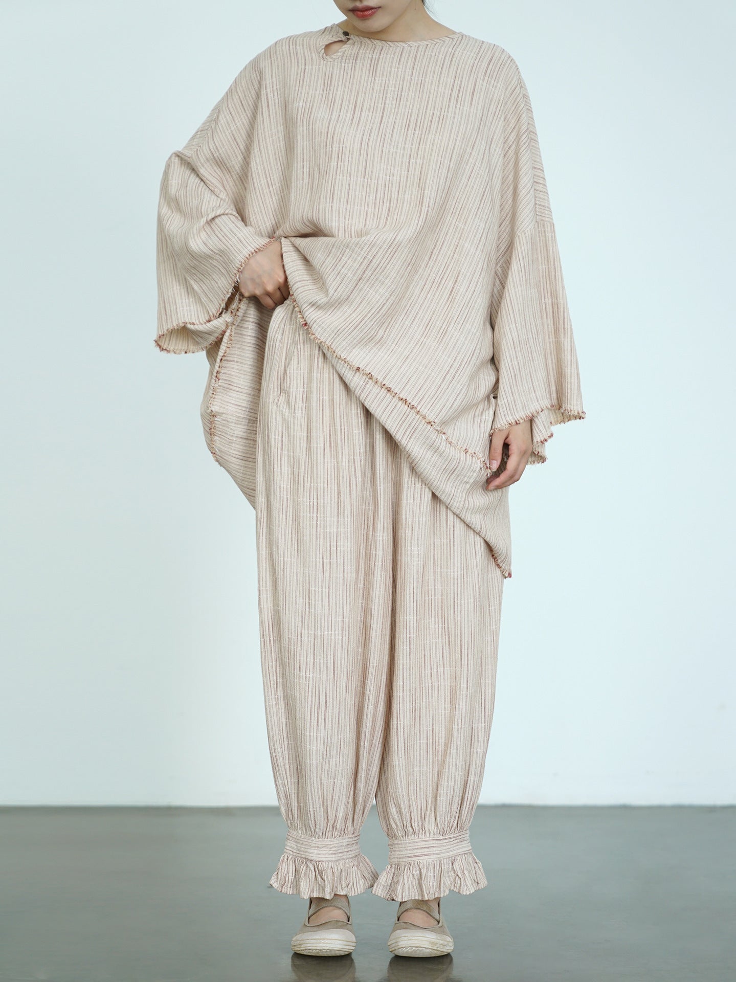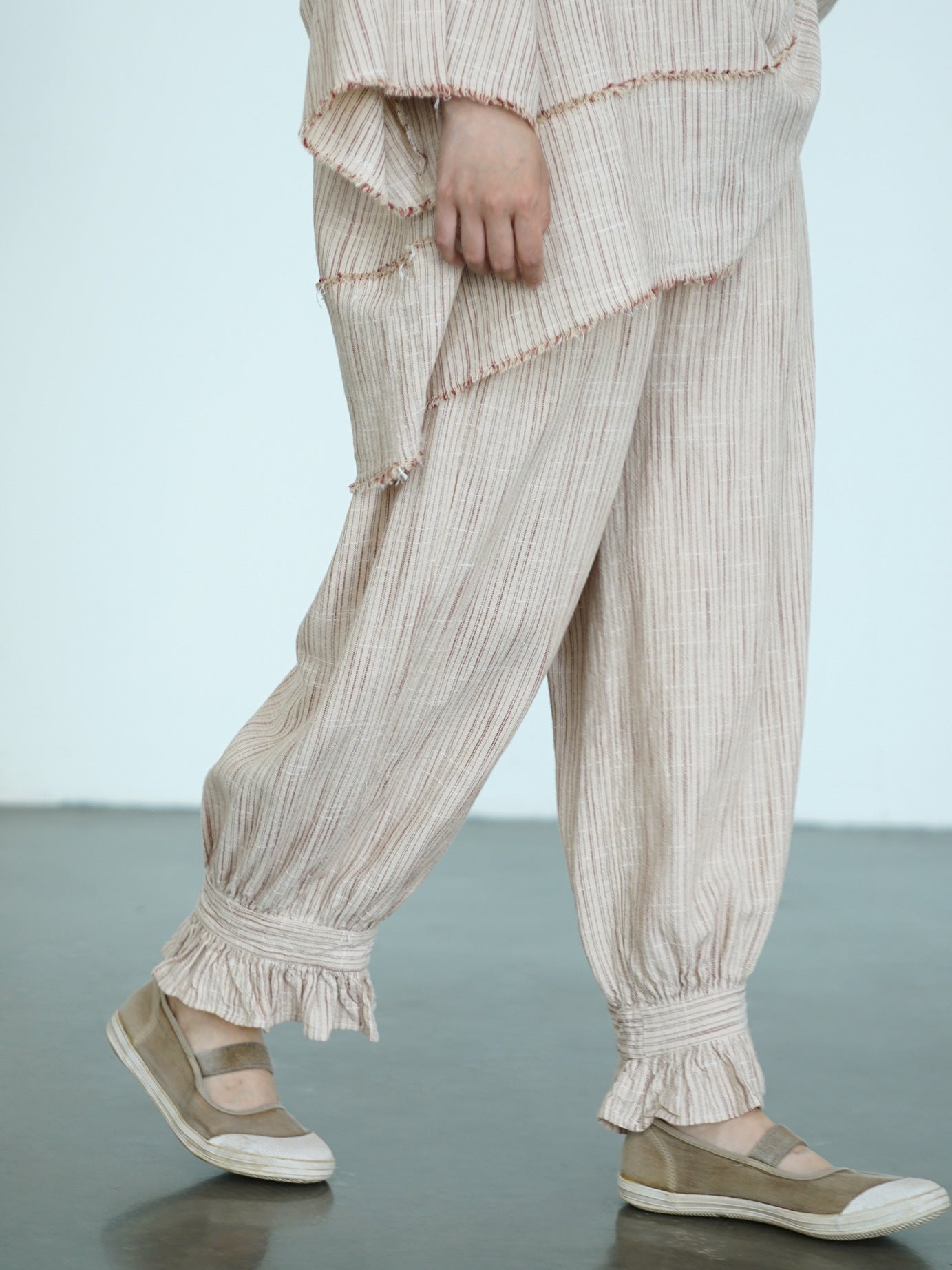 ☆太すぎない 細すぎないシルエット 裾フリル リネンストライプ イージーギャザーパンツ☆