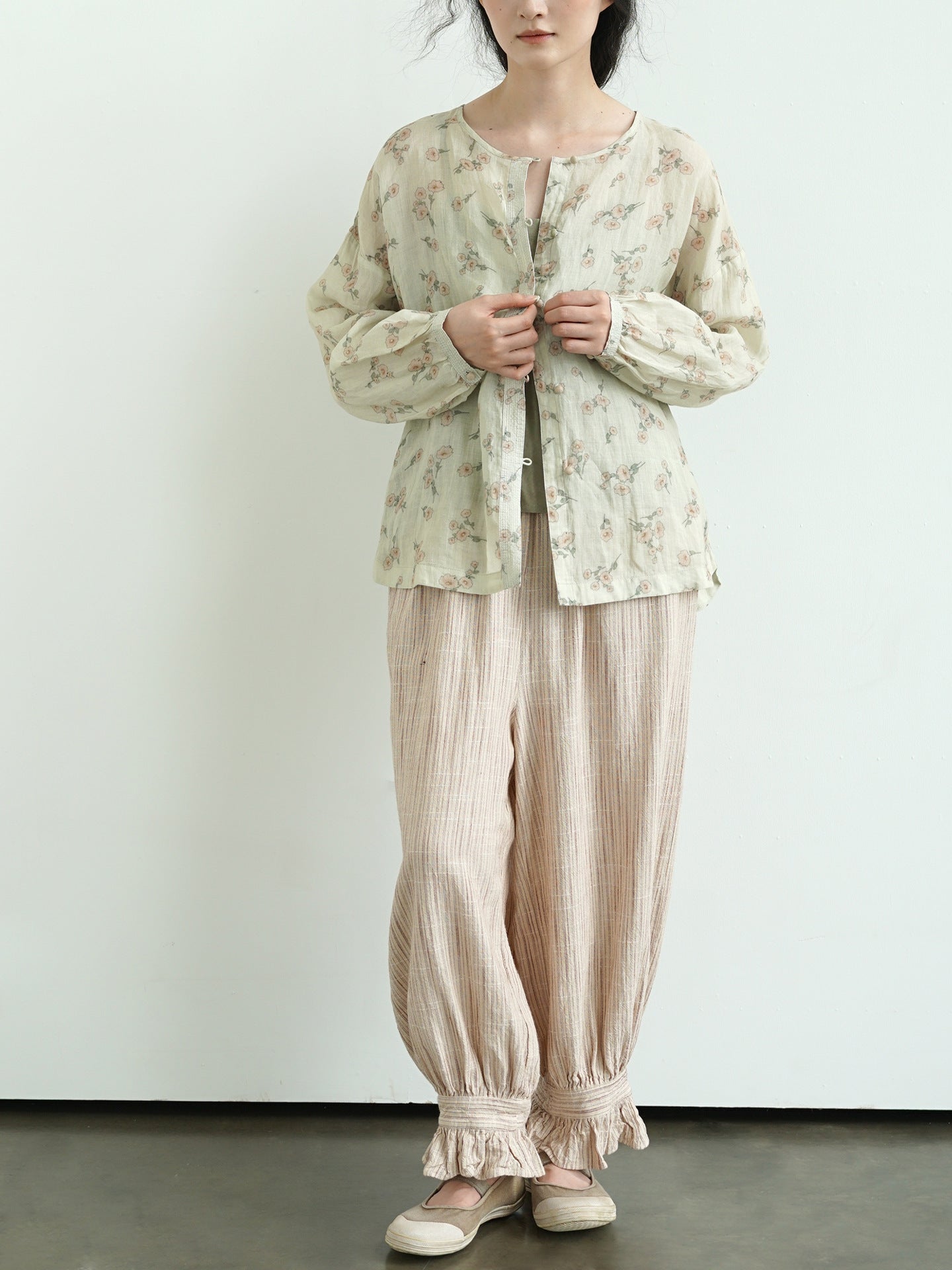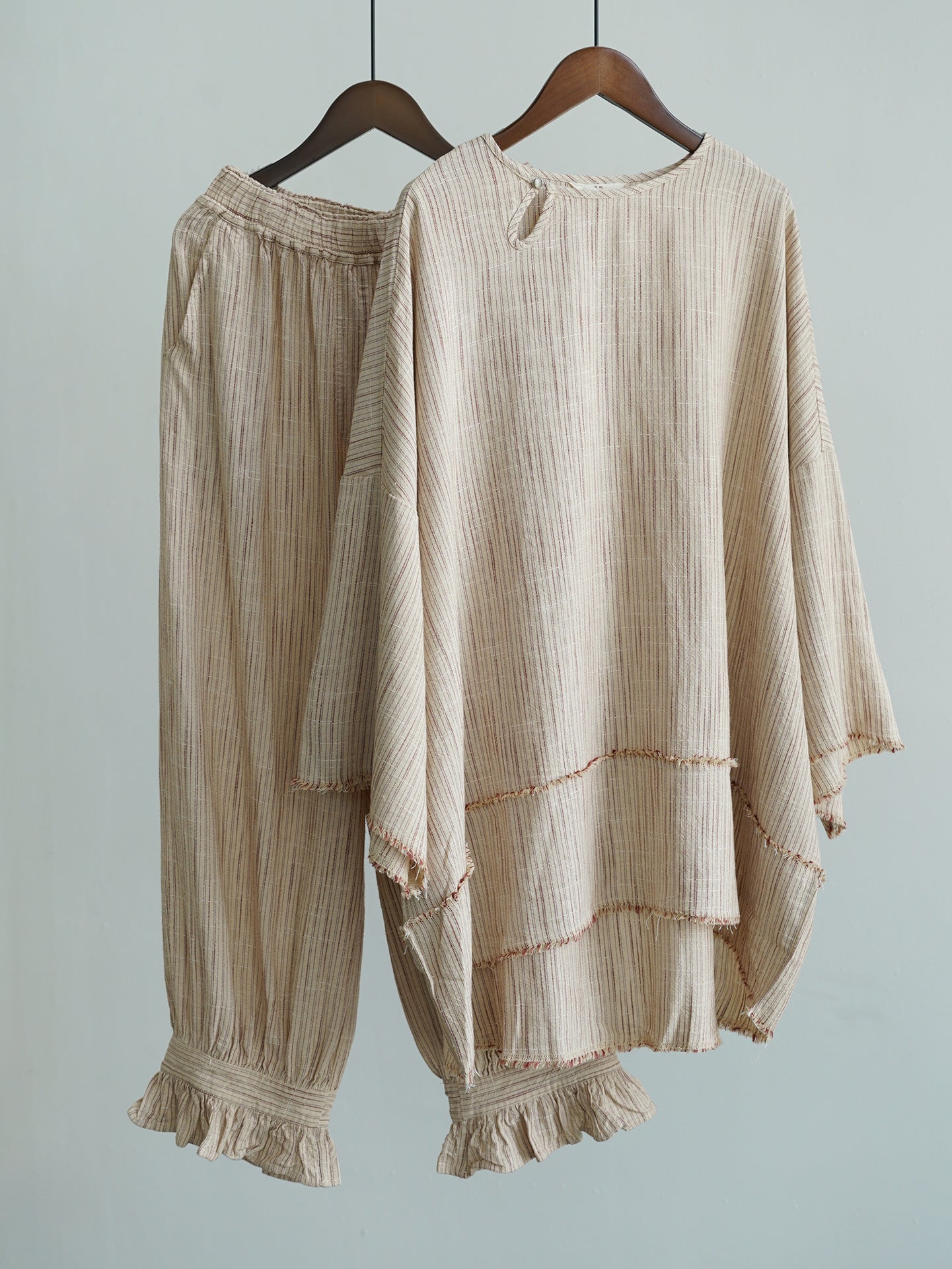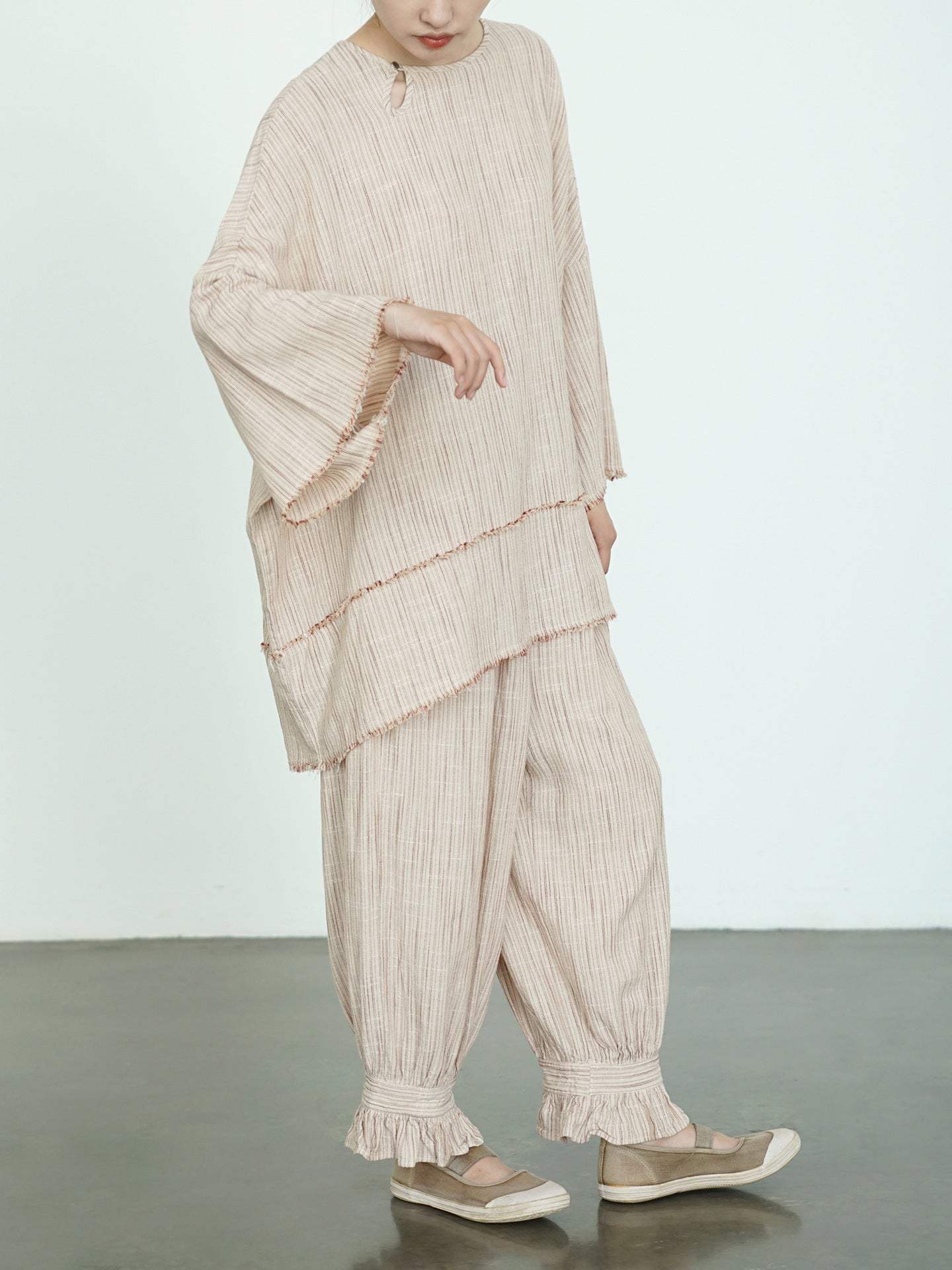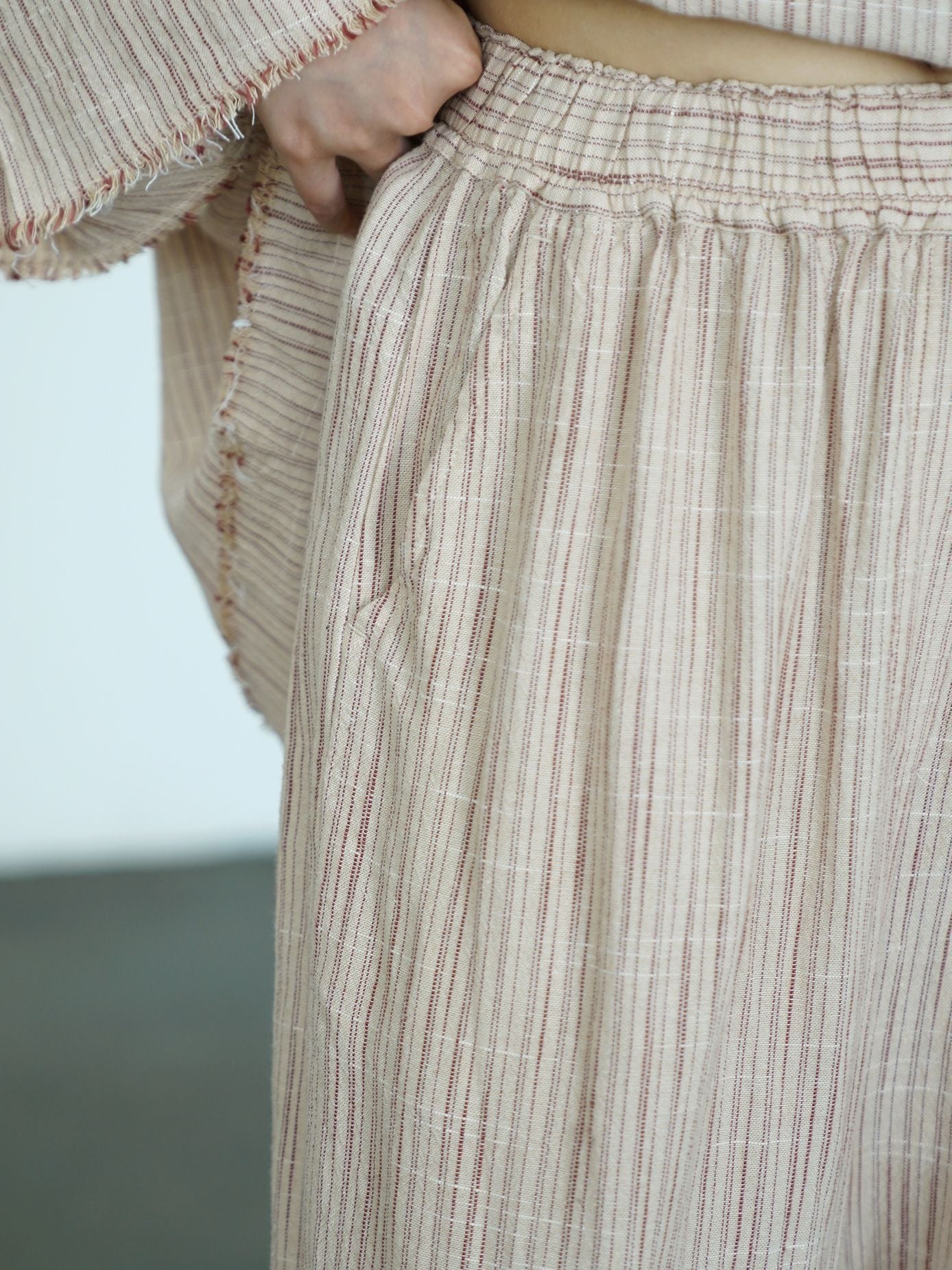 ☆太すぎない 細すぎないシルエット 裾フリル リネンストライプ イージーギャザーパンツ☆