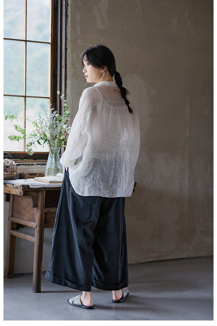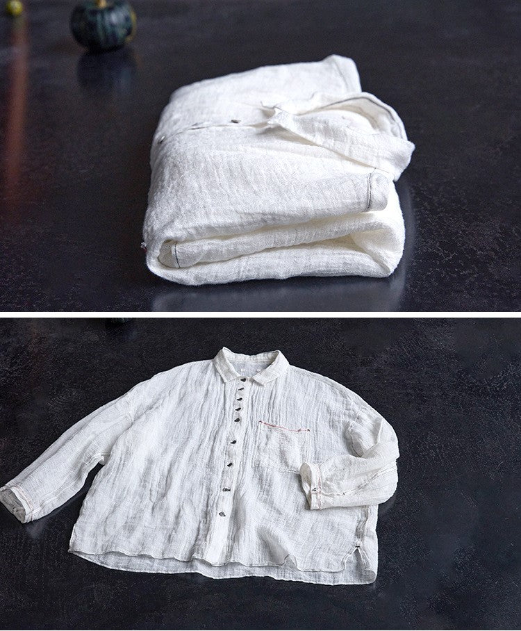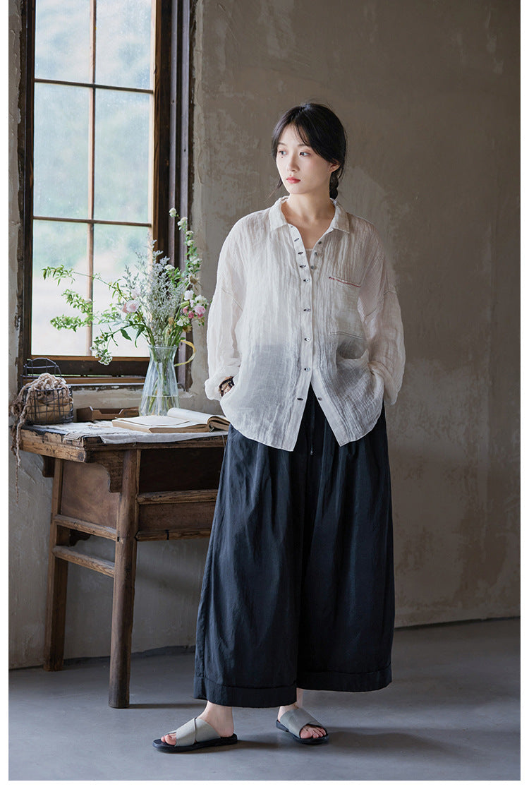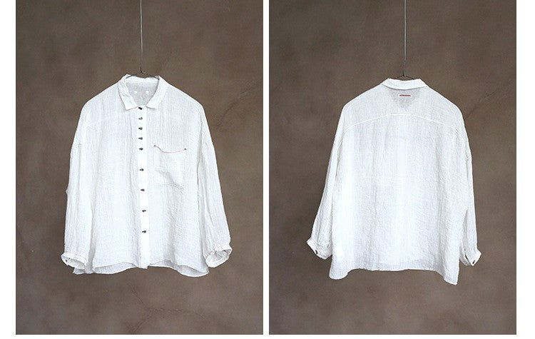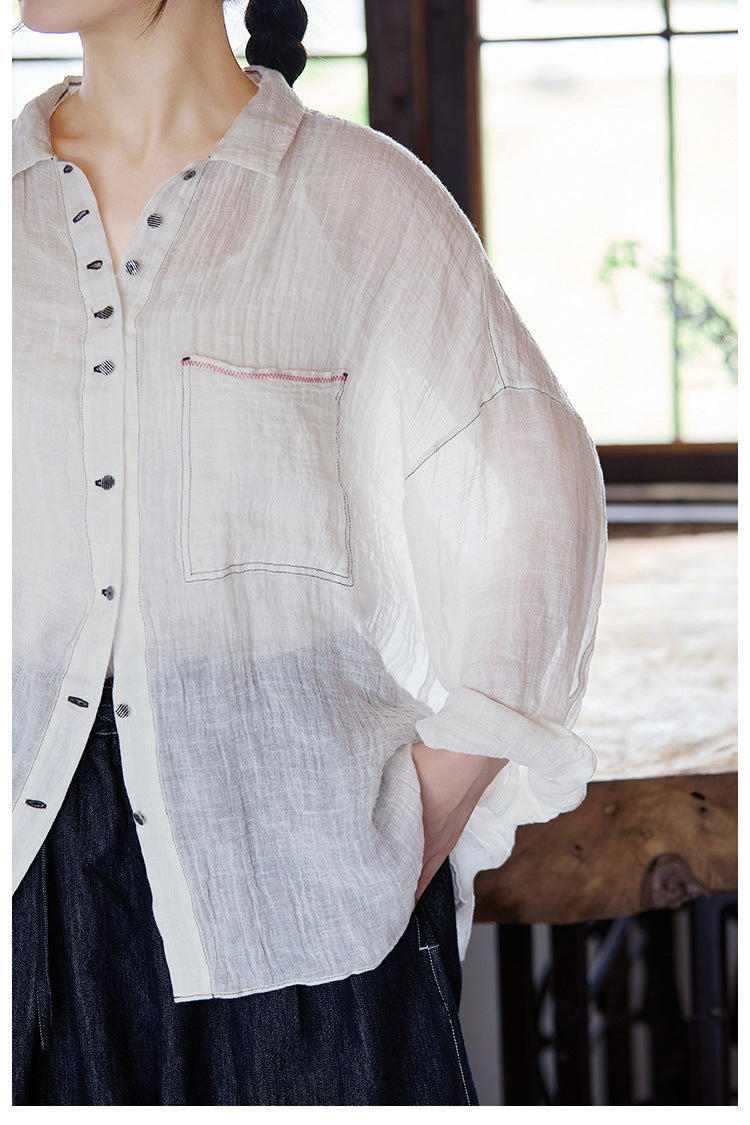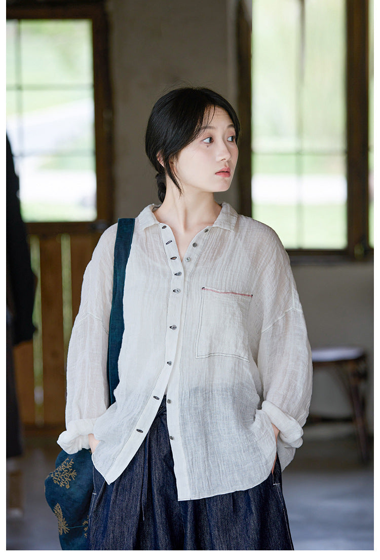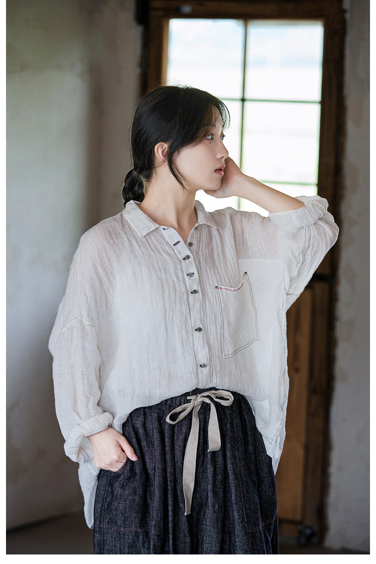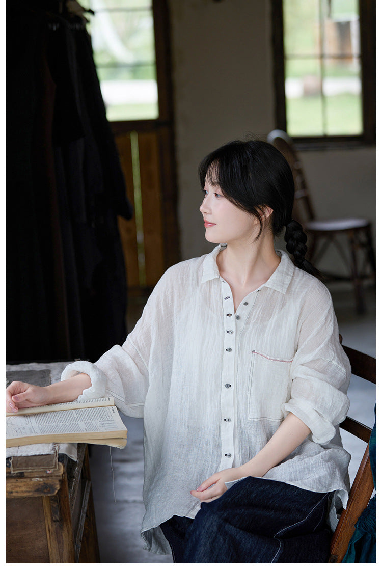 極薄リネンガーゼで清涼感✩ステッチング&ボタンがポイントに✩ドロップショルダー リネン長袖 シャツ☆M/Lサイズ