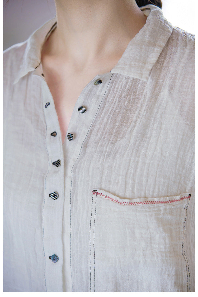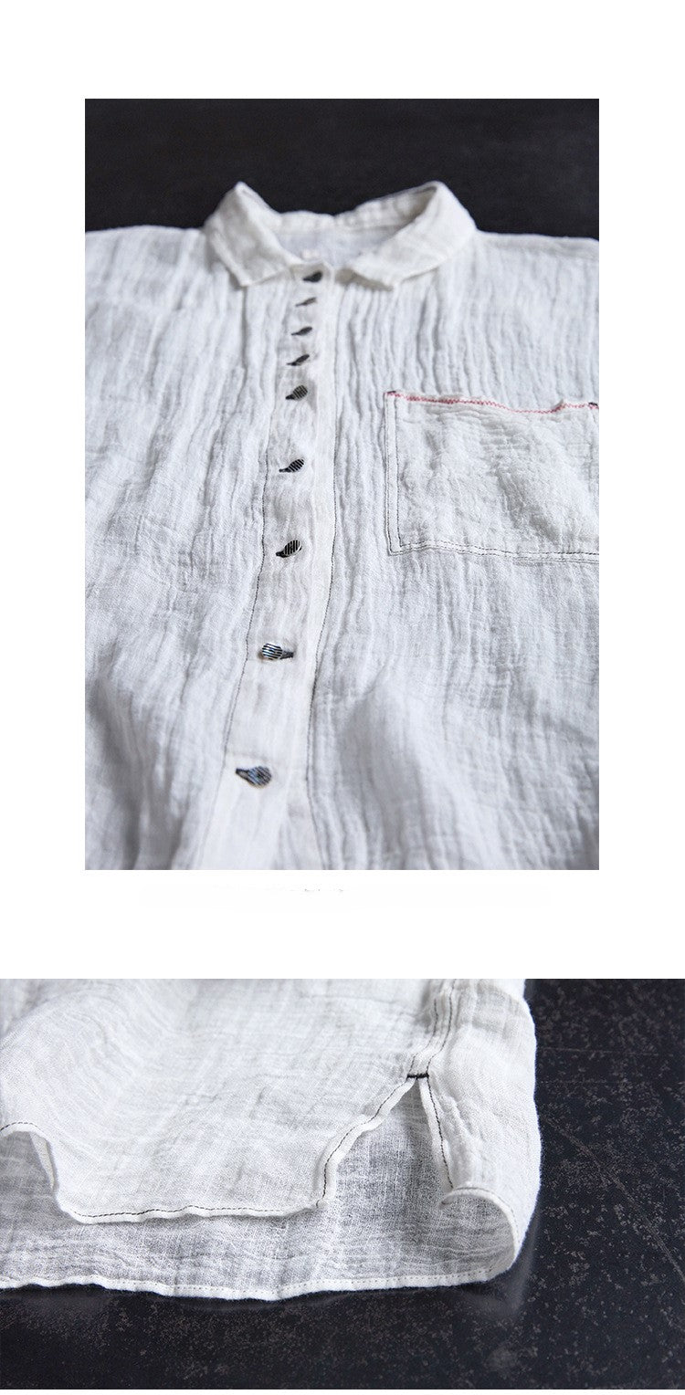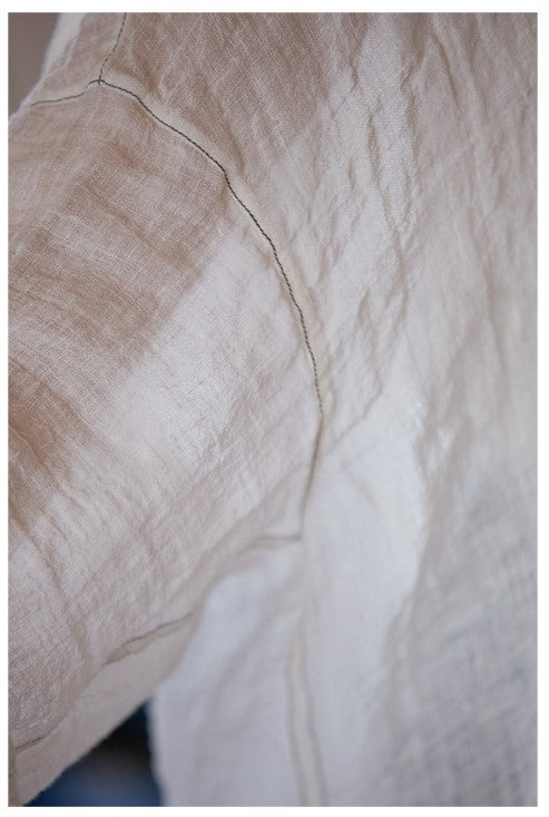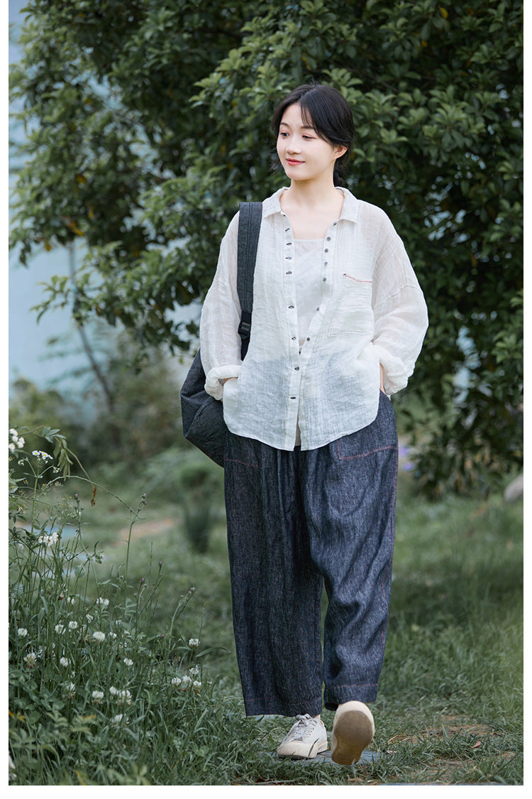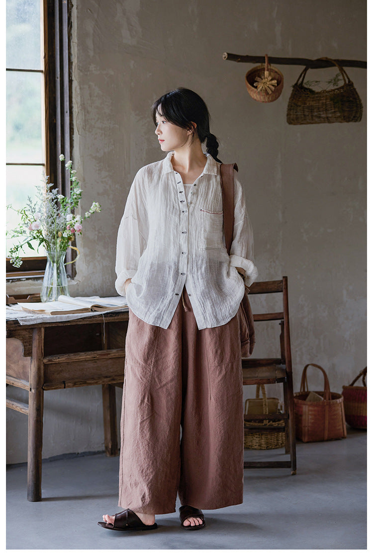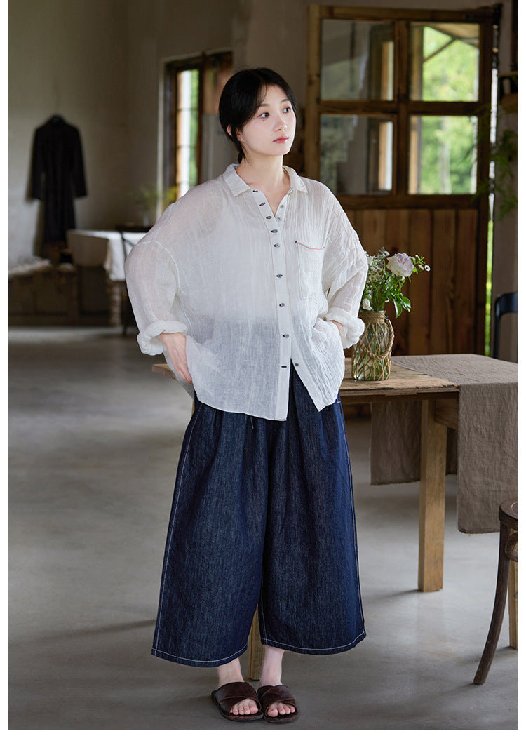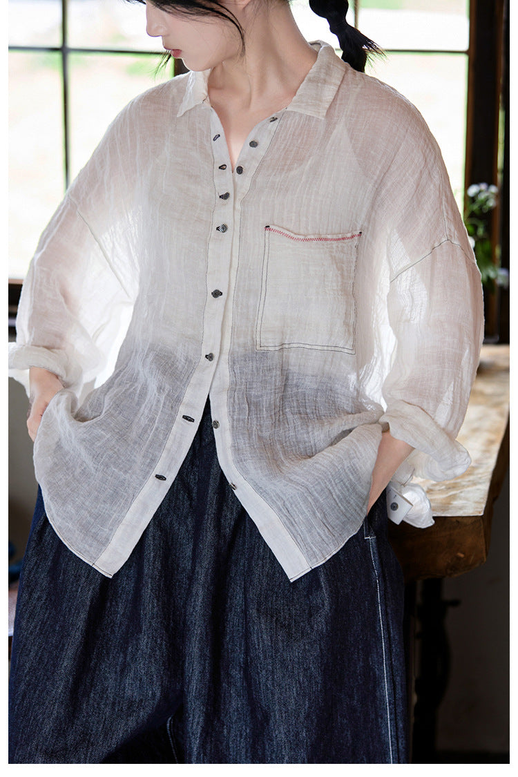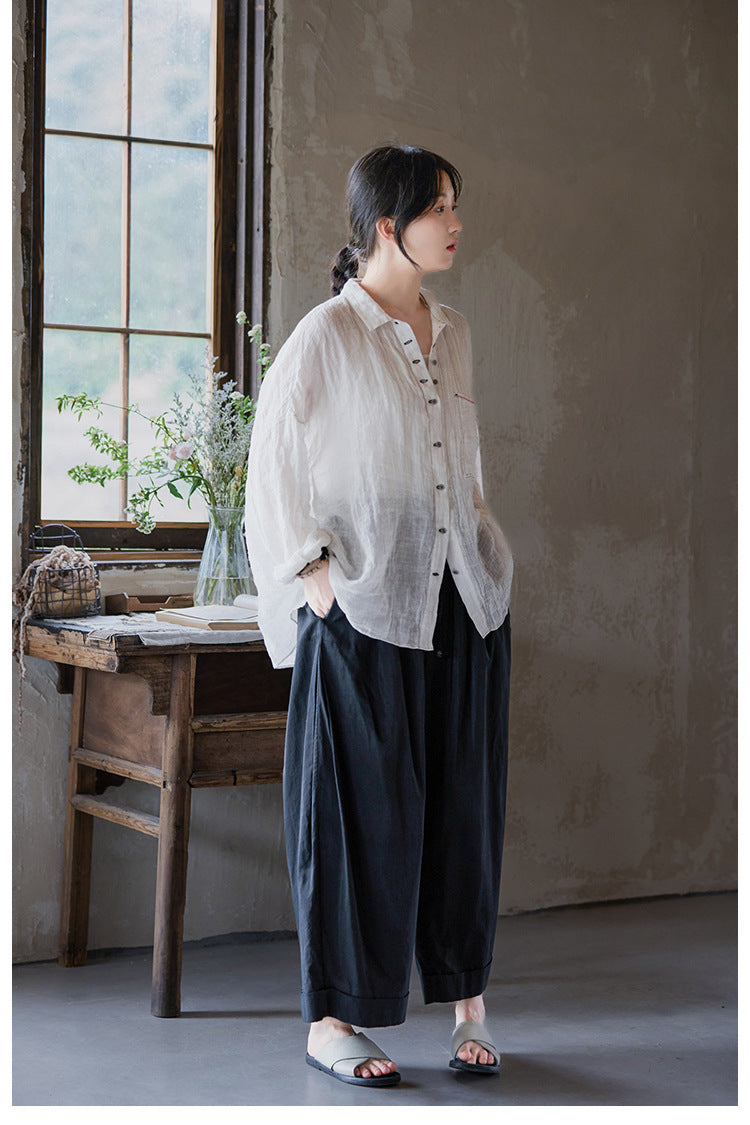 極薄リネンガーゼで清涼感✩ステッチング&ボタンがポイントに✩ドロップショルダー リネン長袖 シャツ☆M/Lサイズ