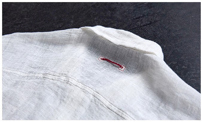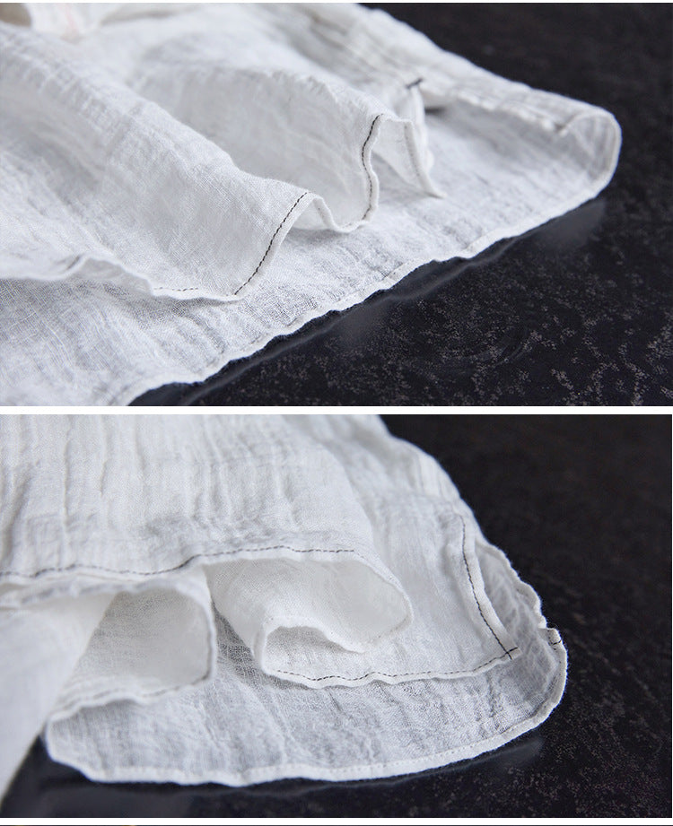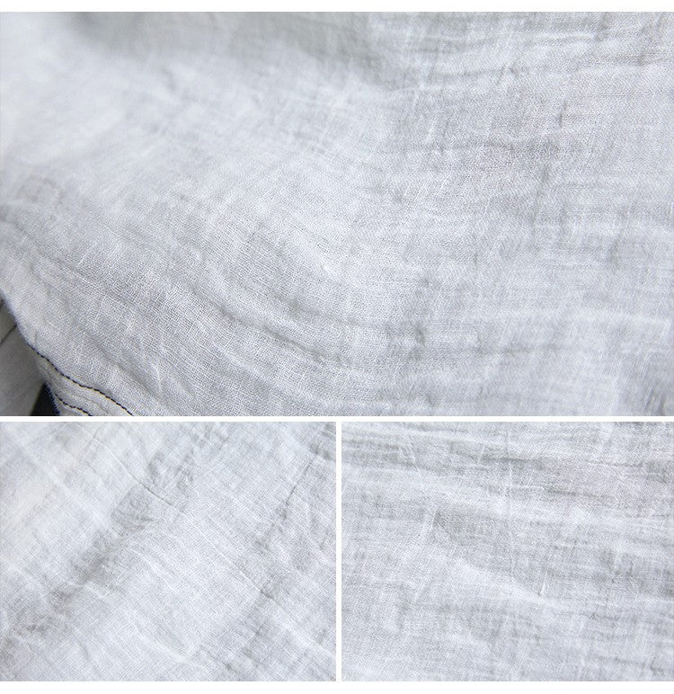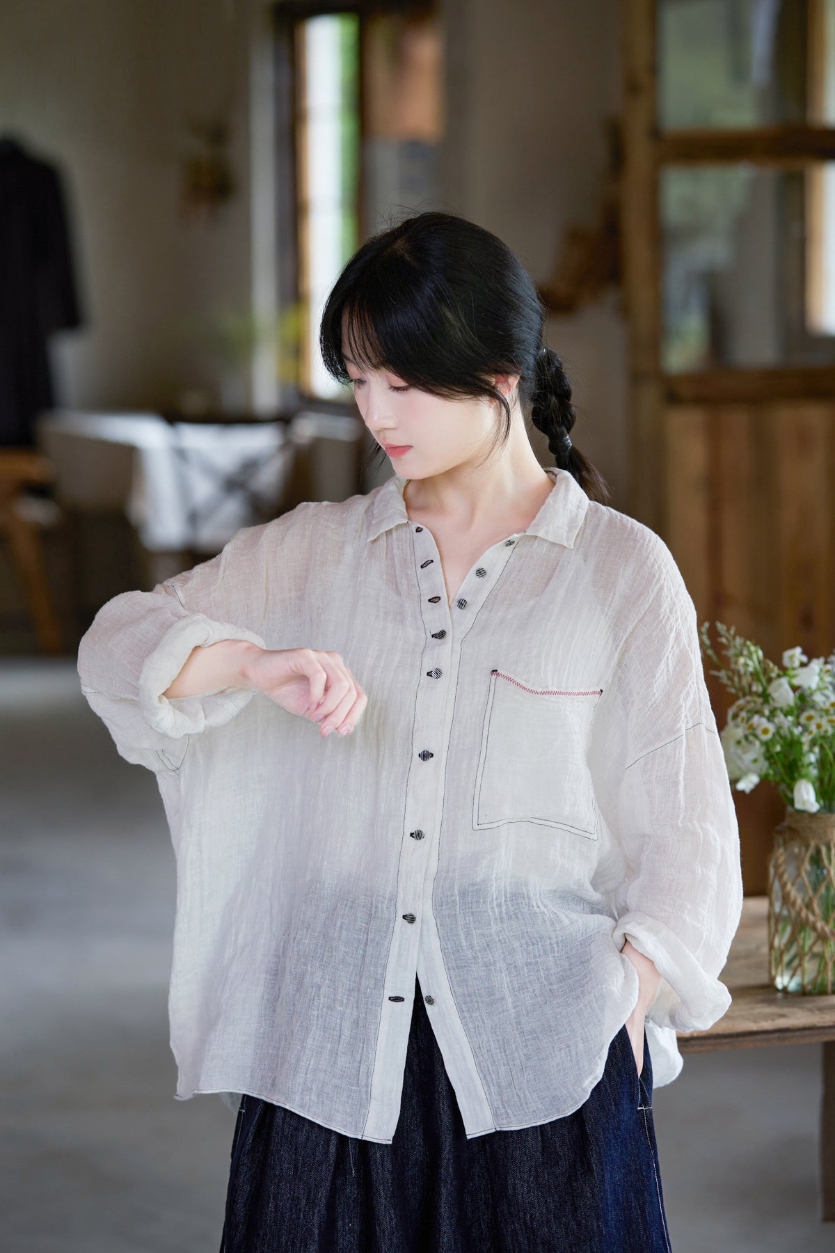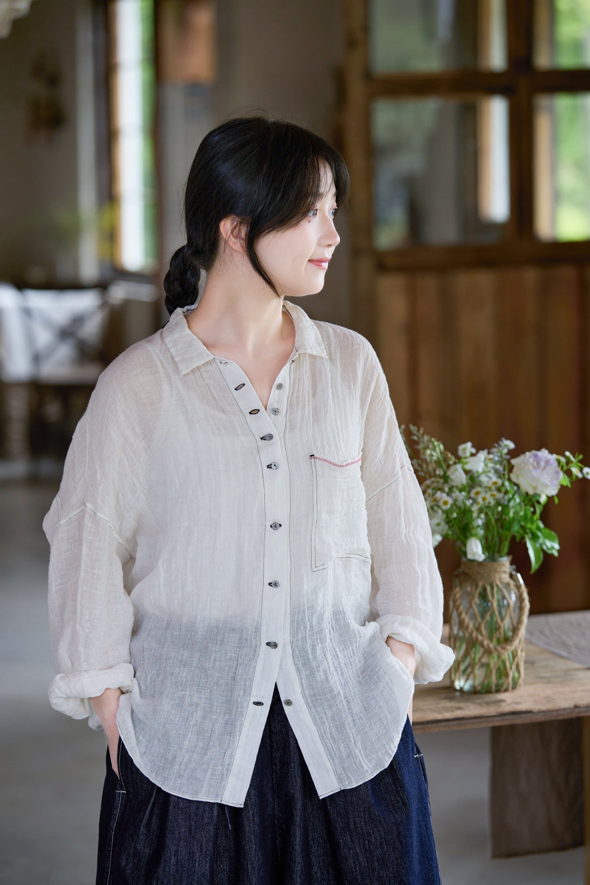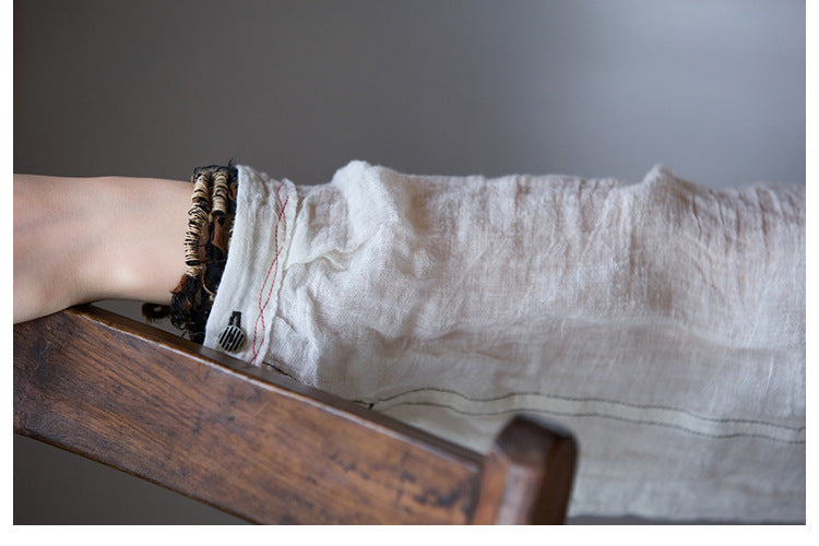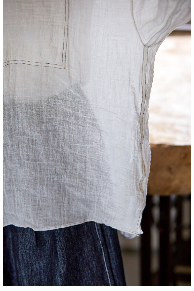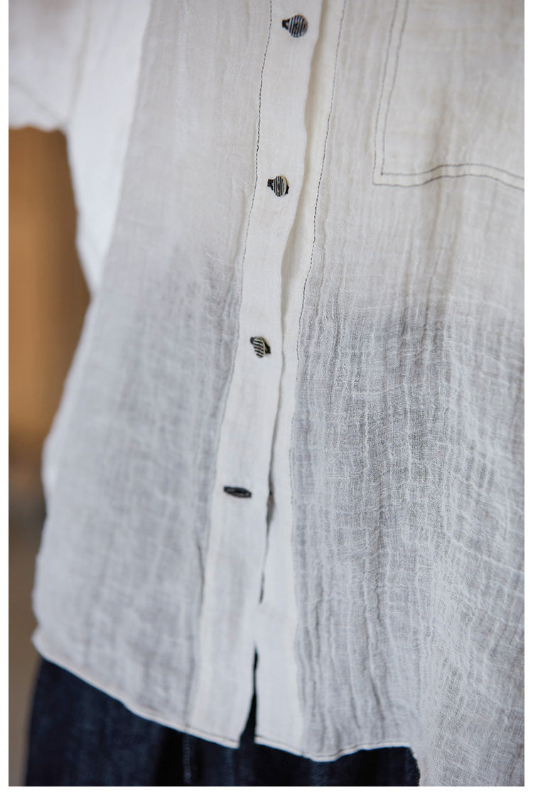 極薄リネンガーゼで清涼感✩ステッチング&ボタンがポイントに✩ドロップショルダー リネン長袖 シャツ☆M/Lサイズ