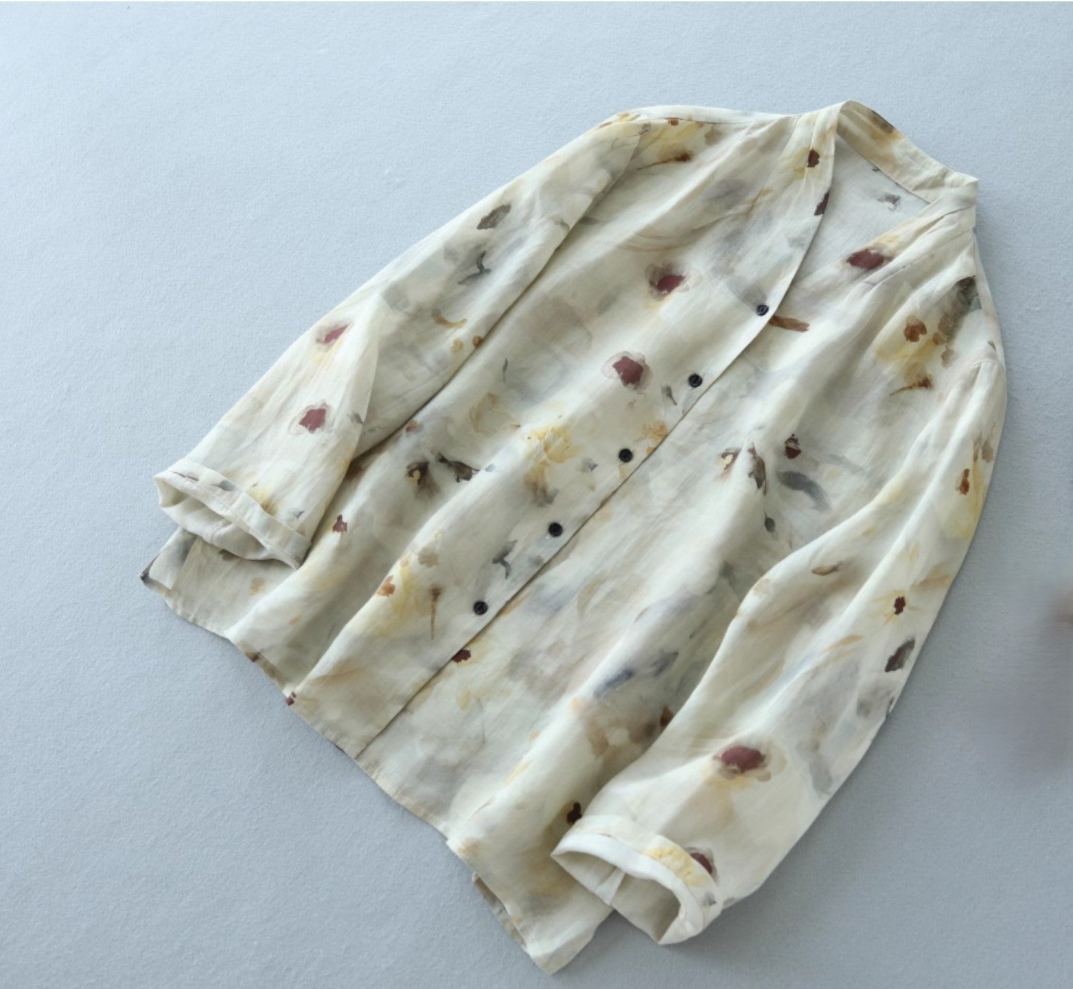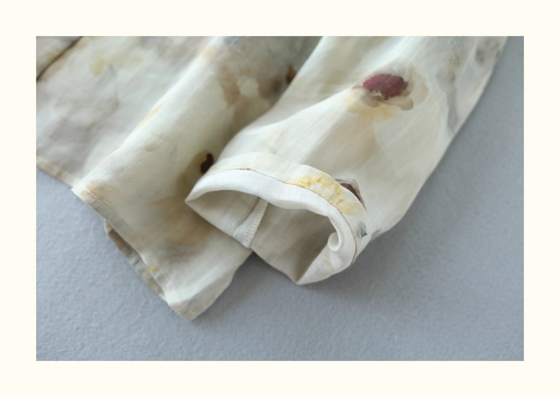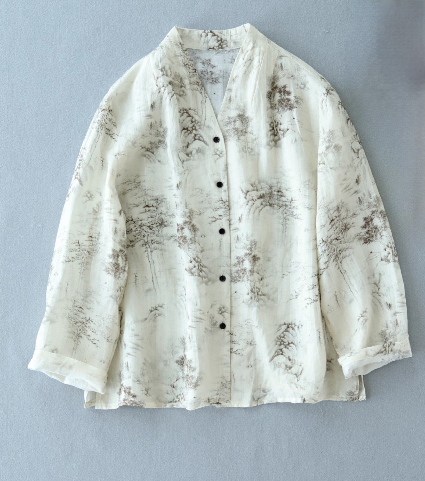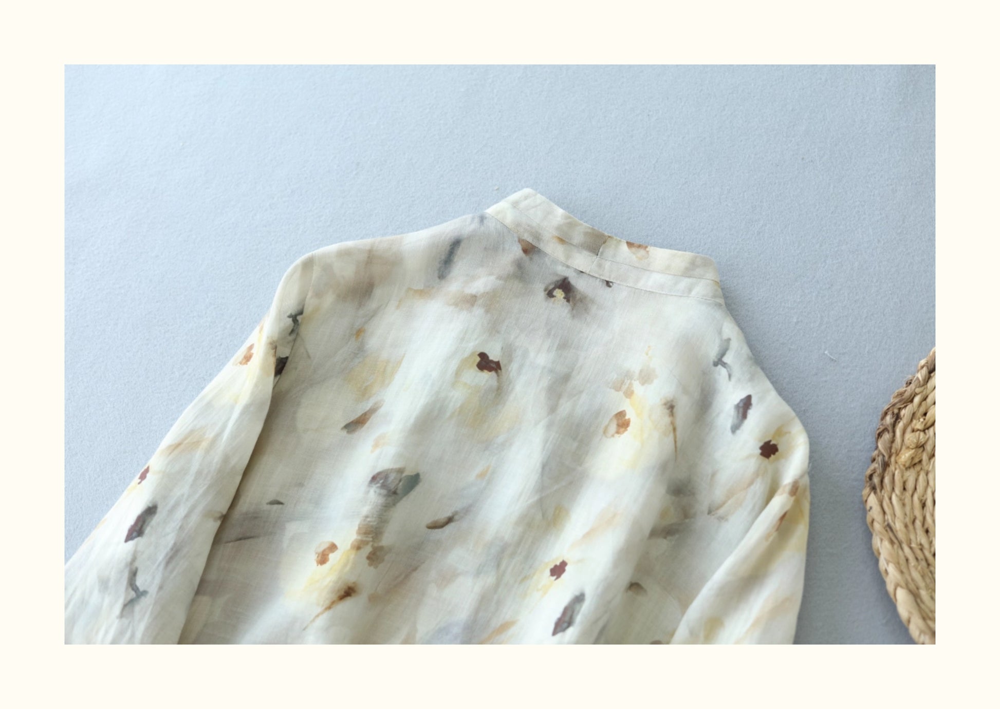◇水彩プリントが美しい◇ラミー苧麻100% ノーカラーシャツ◇