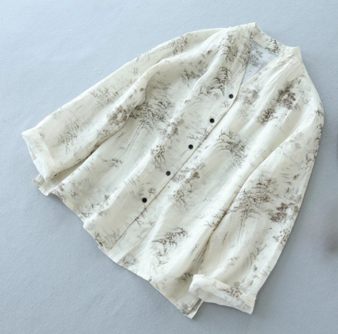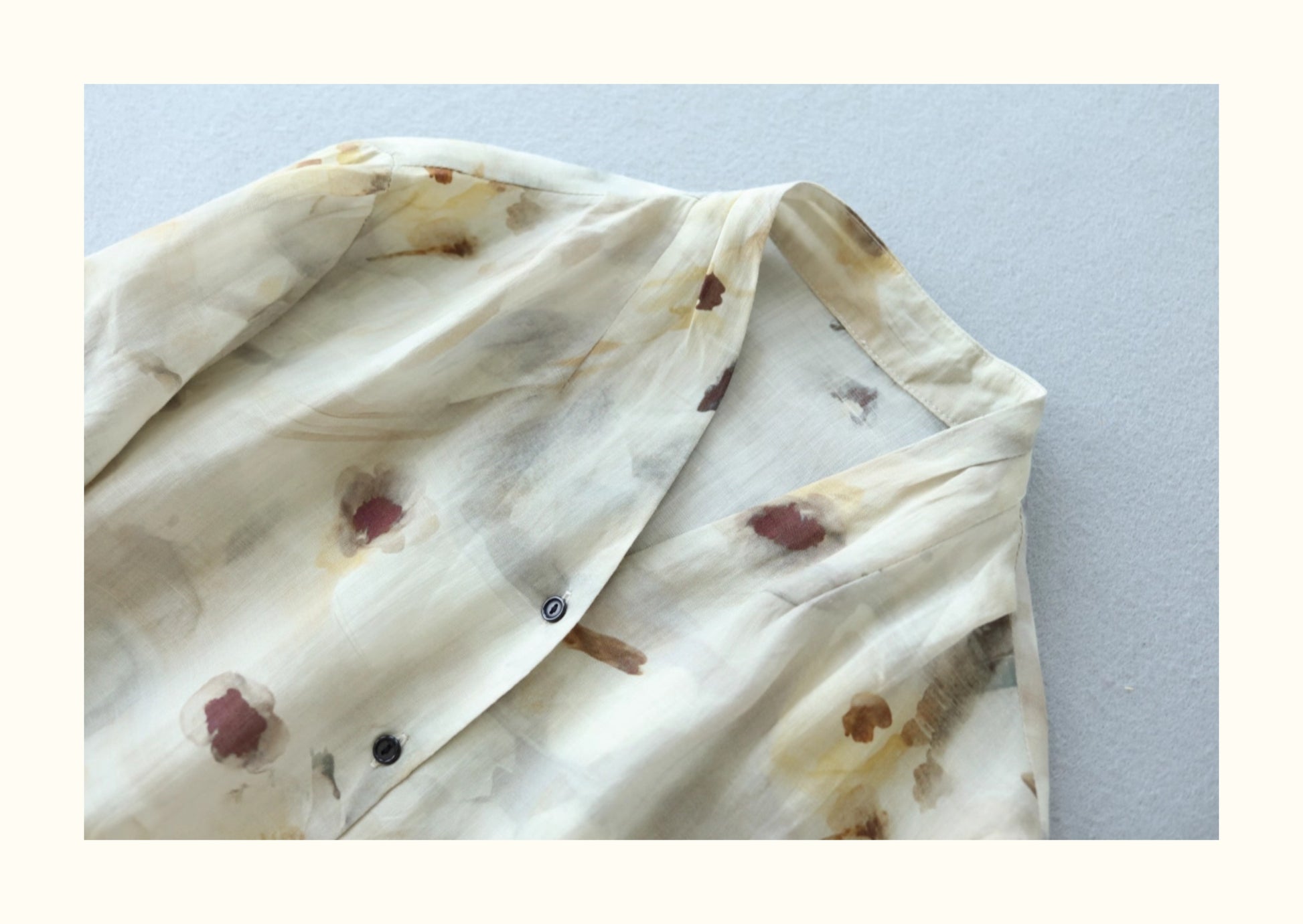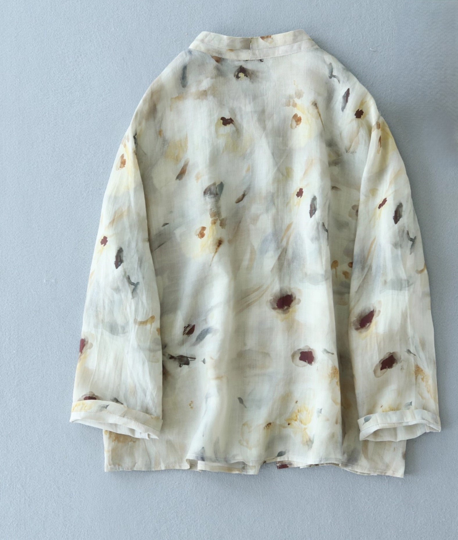 ◇水彩プリントが美しい◇ラミー苧麻100% ノーカラーシャツ◇