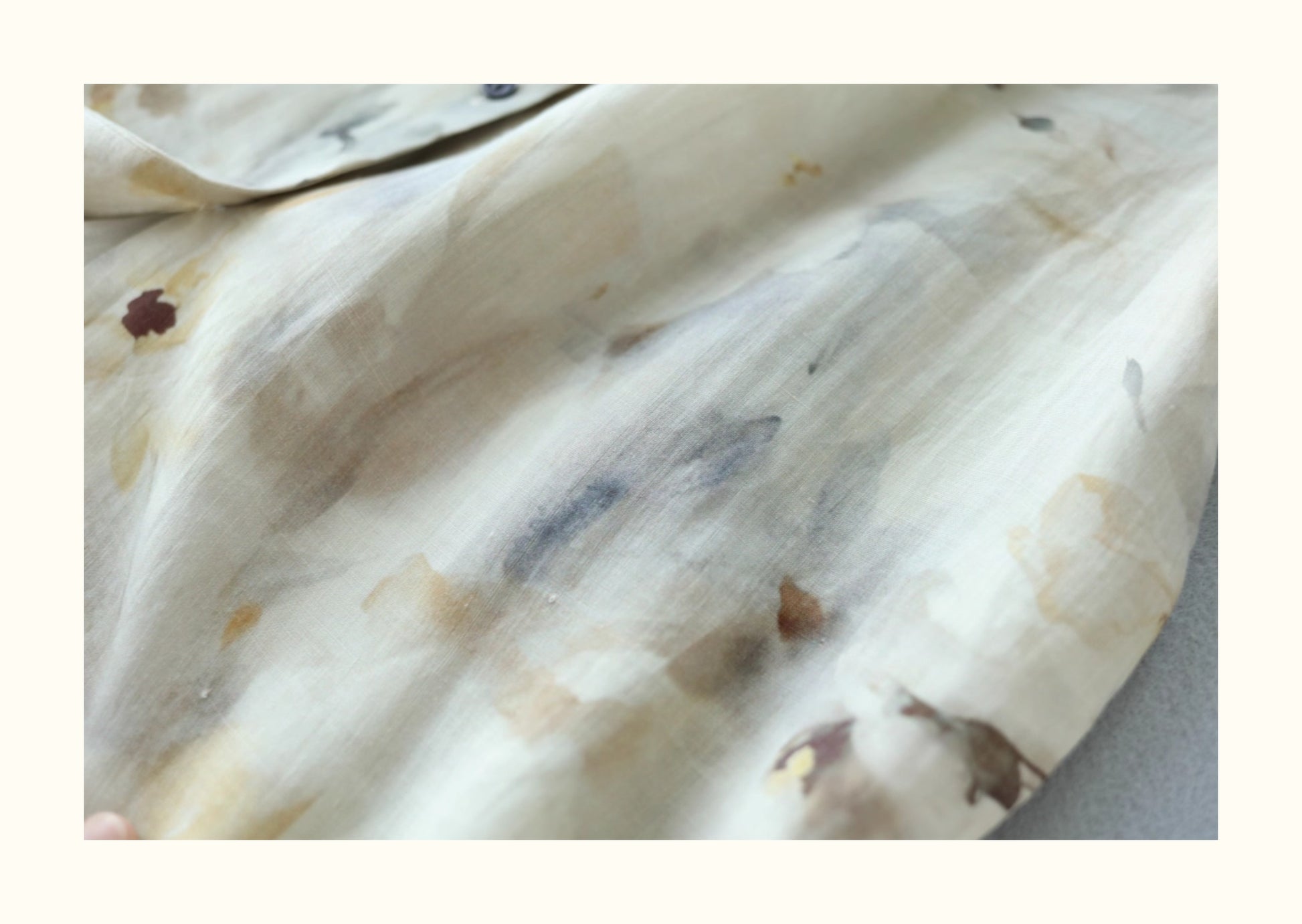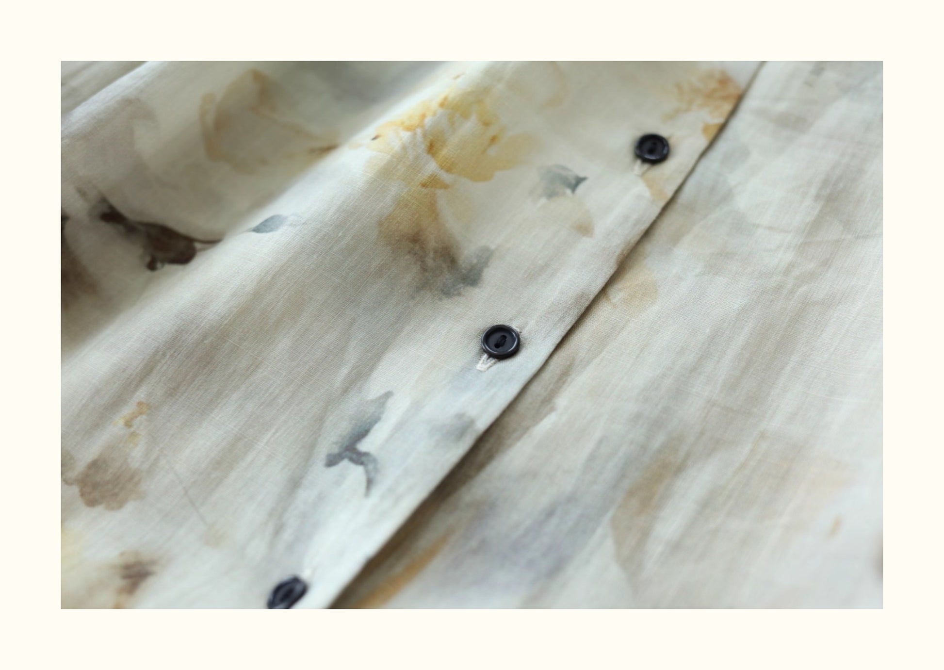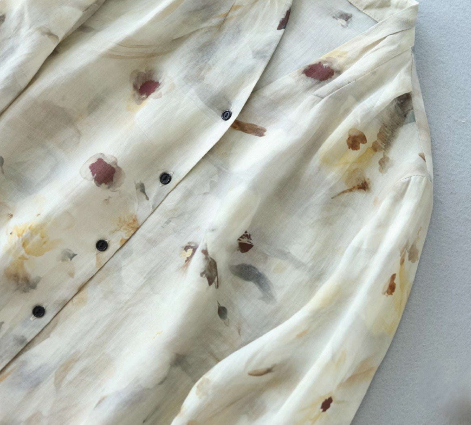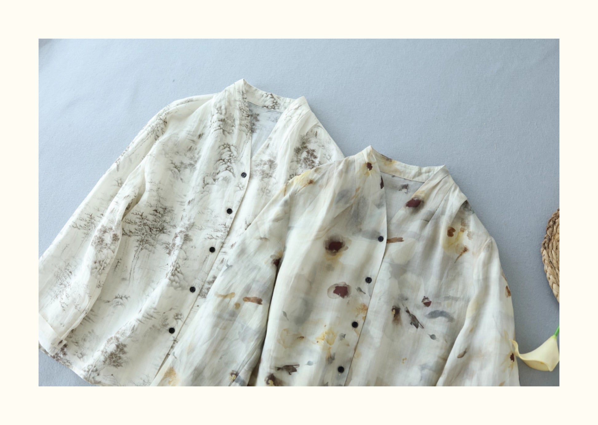 ◇水彩プリントが美しい◇ラミー苧麻100% ノーカラーシャツ◇
