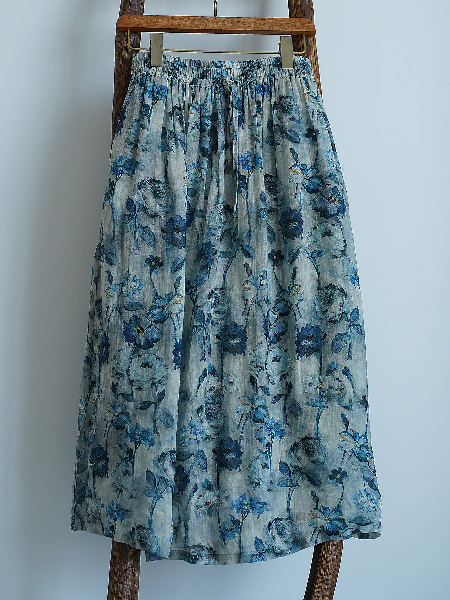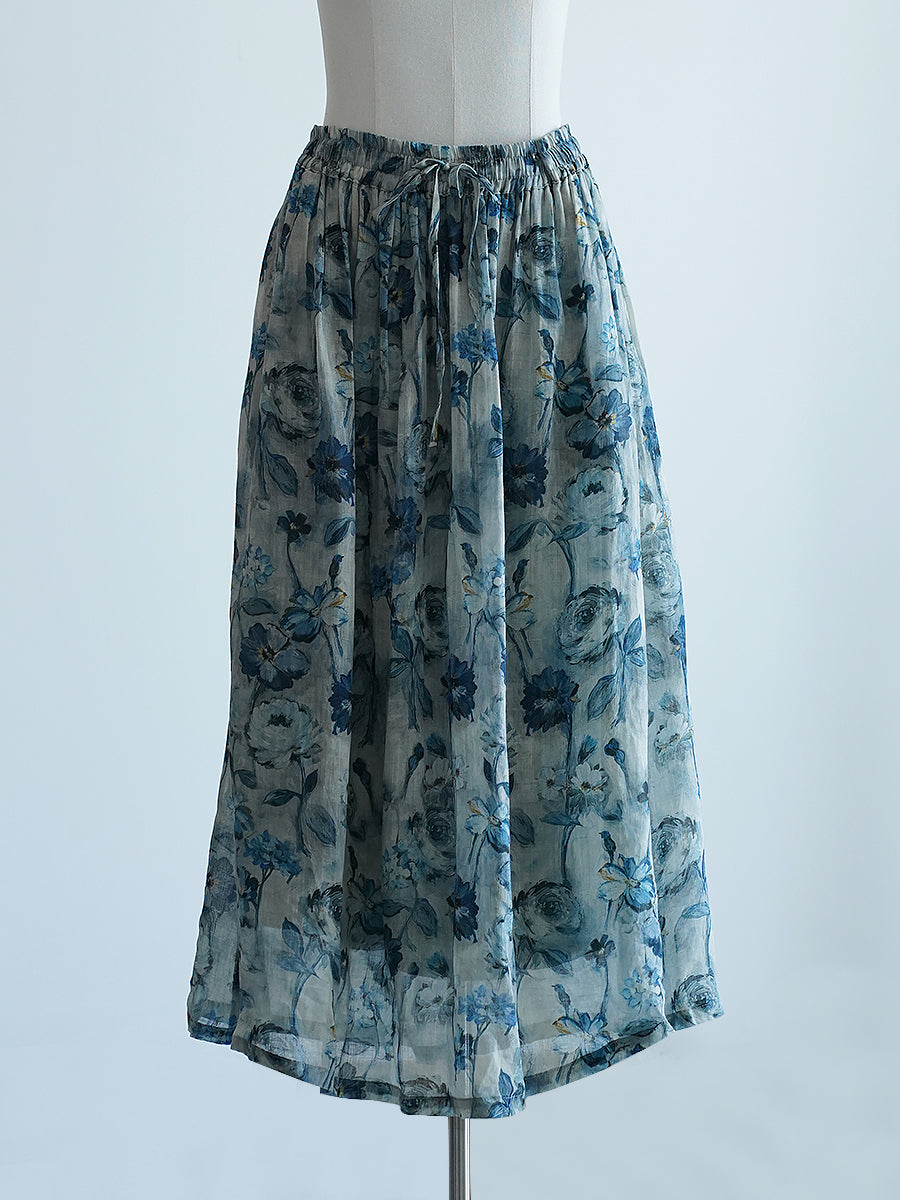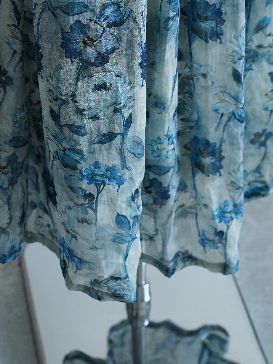 ◇油絵タッチの花柄プリントがエレガント◇ハイカウントラミーが軽やか◇イージーギャザーフラワープリント スカート◇裏地付き