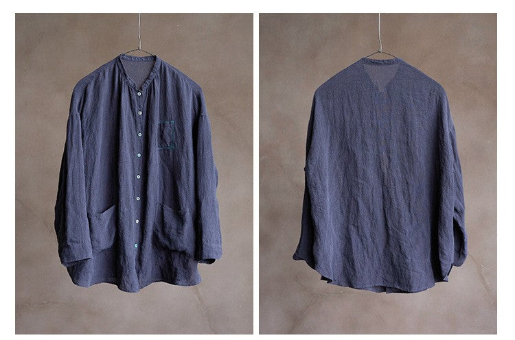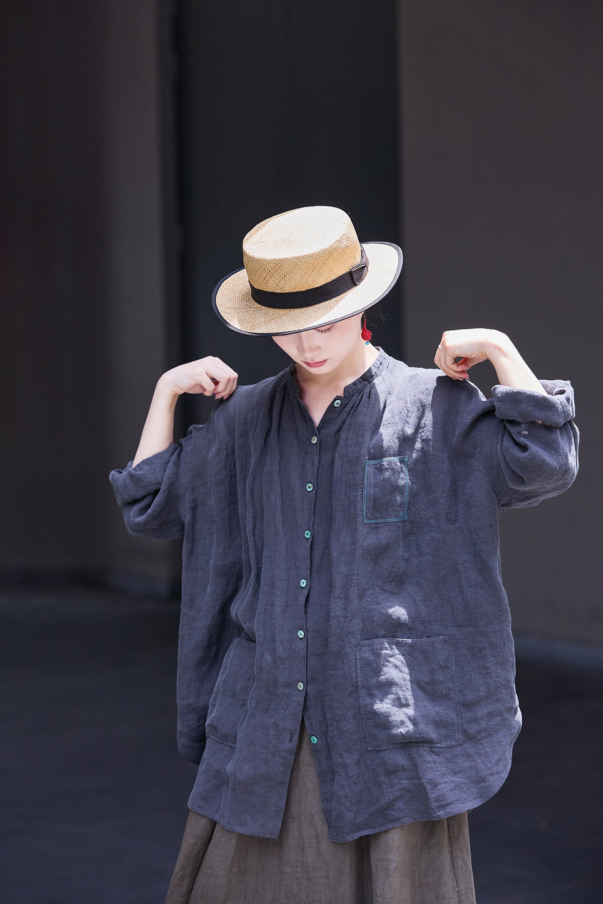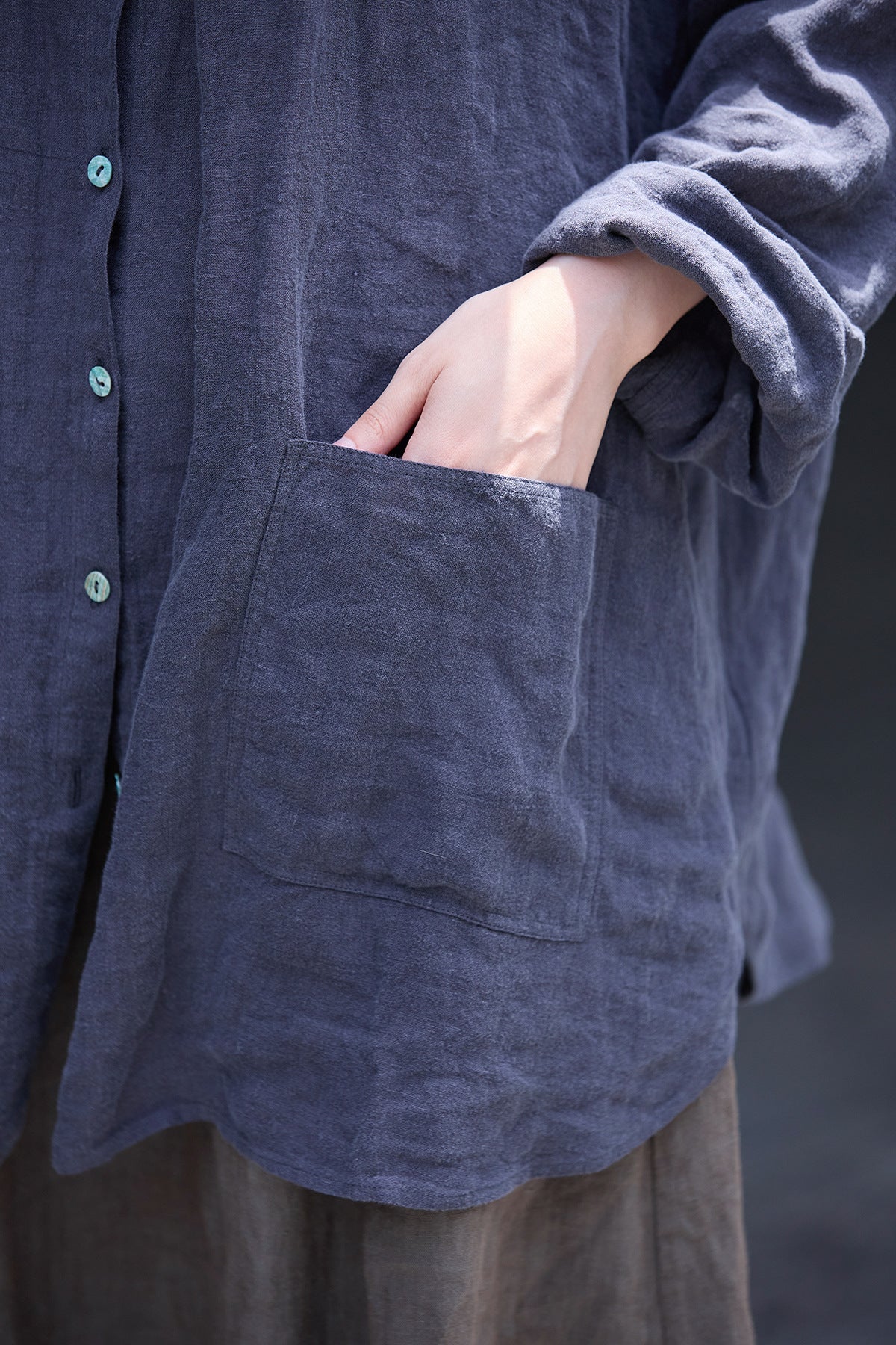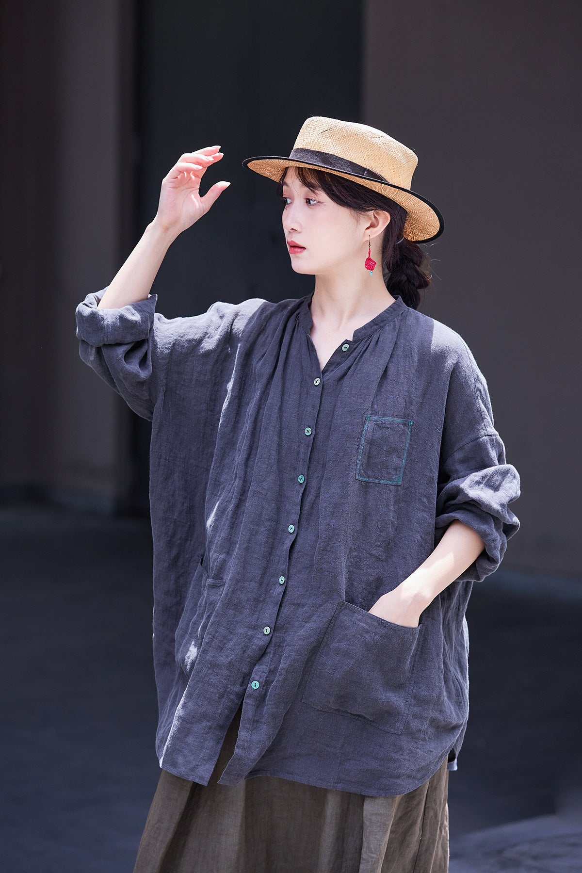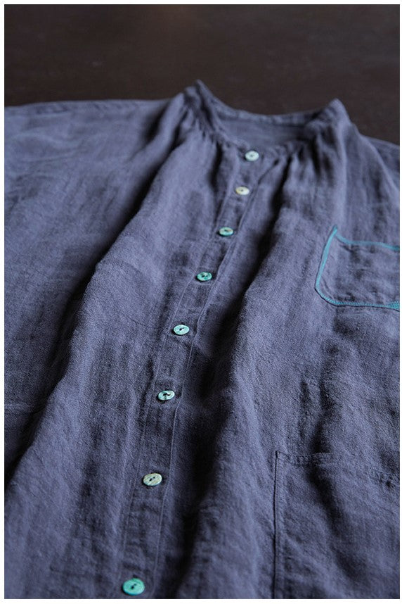 胸ポケステッチとボタンもポイントに✩リネン ゆったりシルエット バンドカラーポケットシャツ✩ Mサイズ