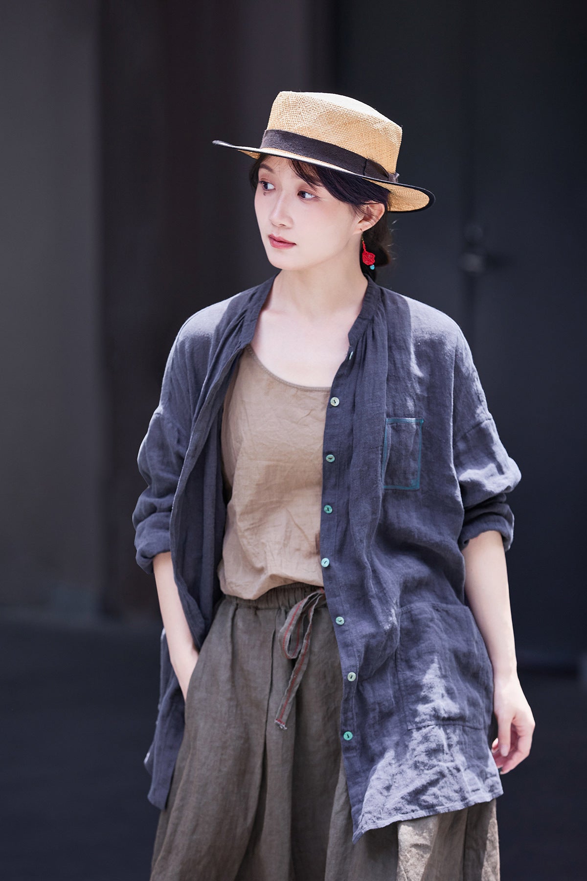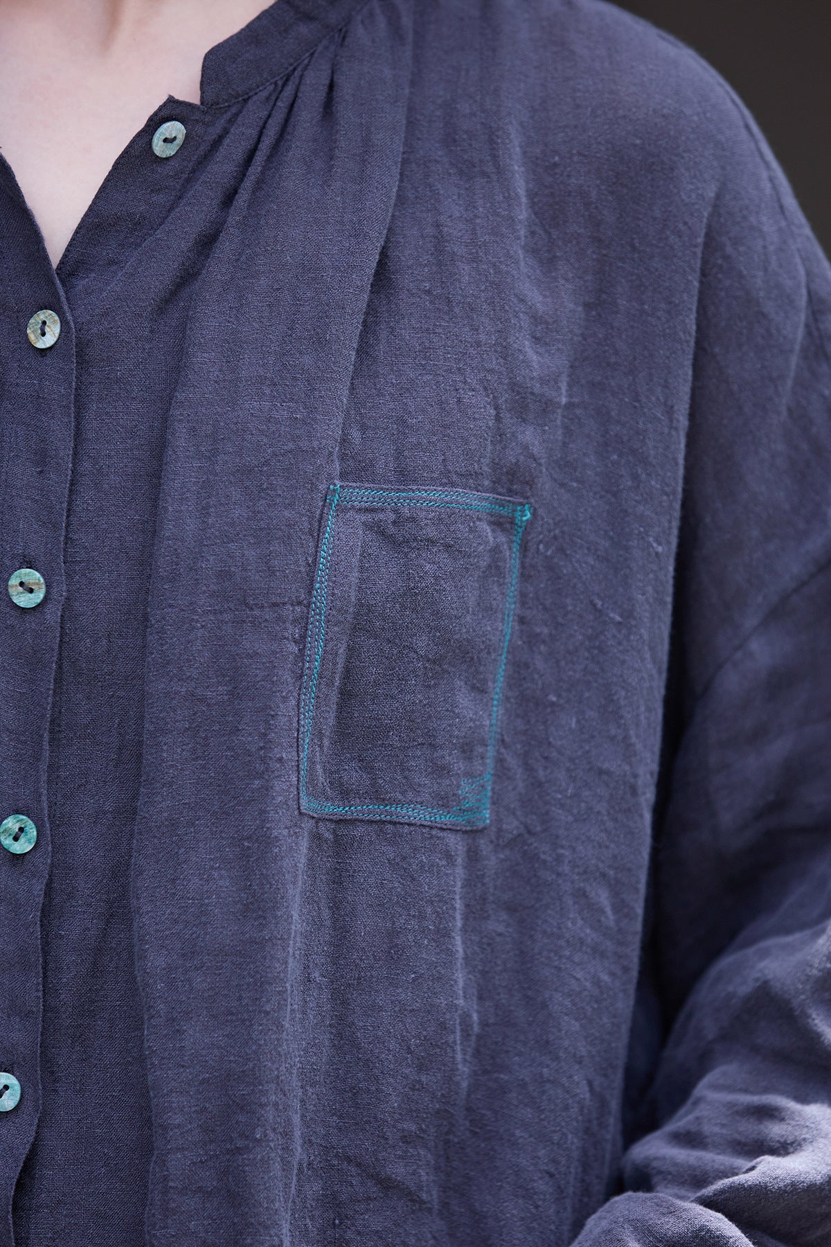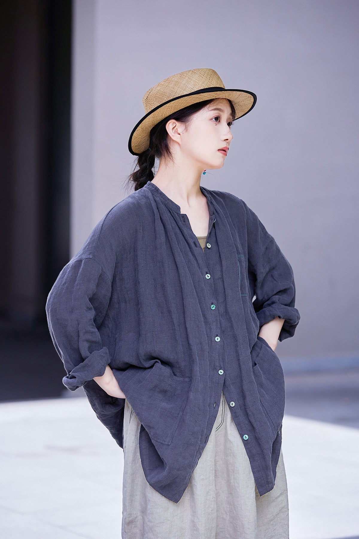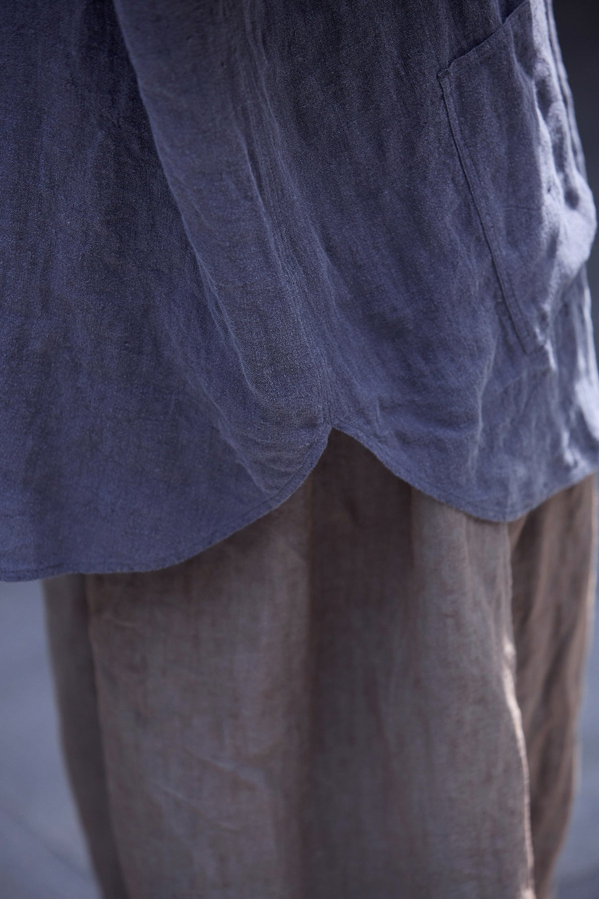 胸ポケステッチとボタンもポイントに✩リネン ゆったりシルエット バンドカラーポケットシャツ✩ Mサイズ