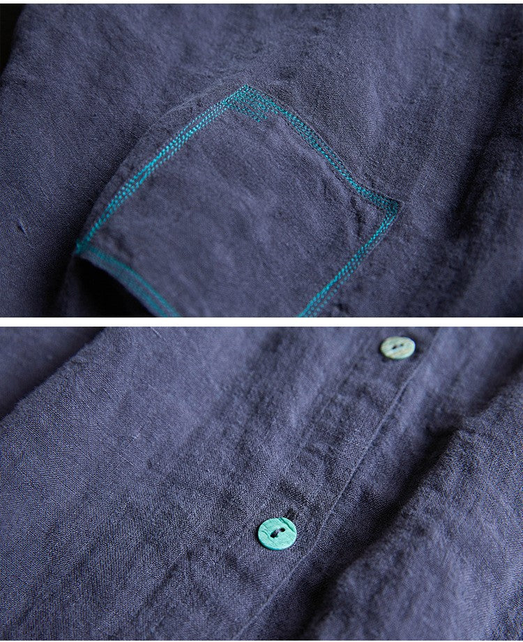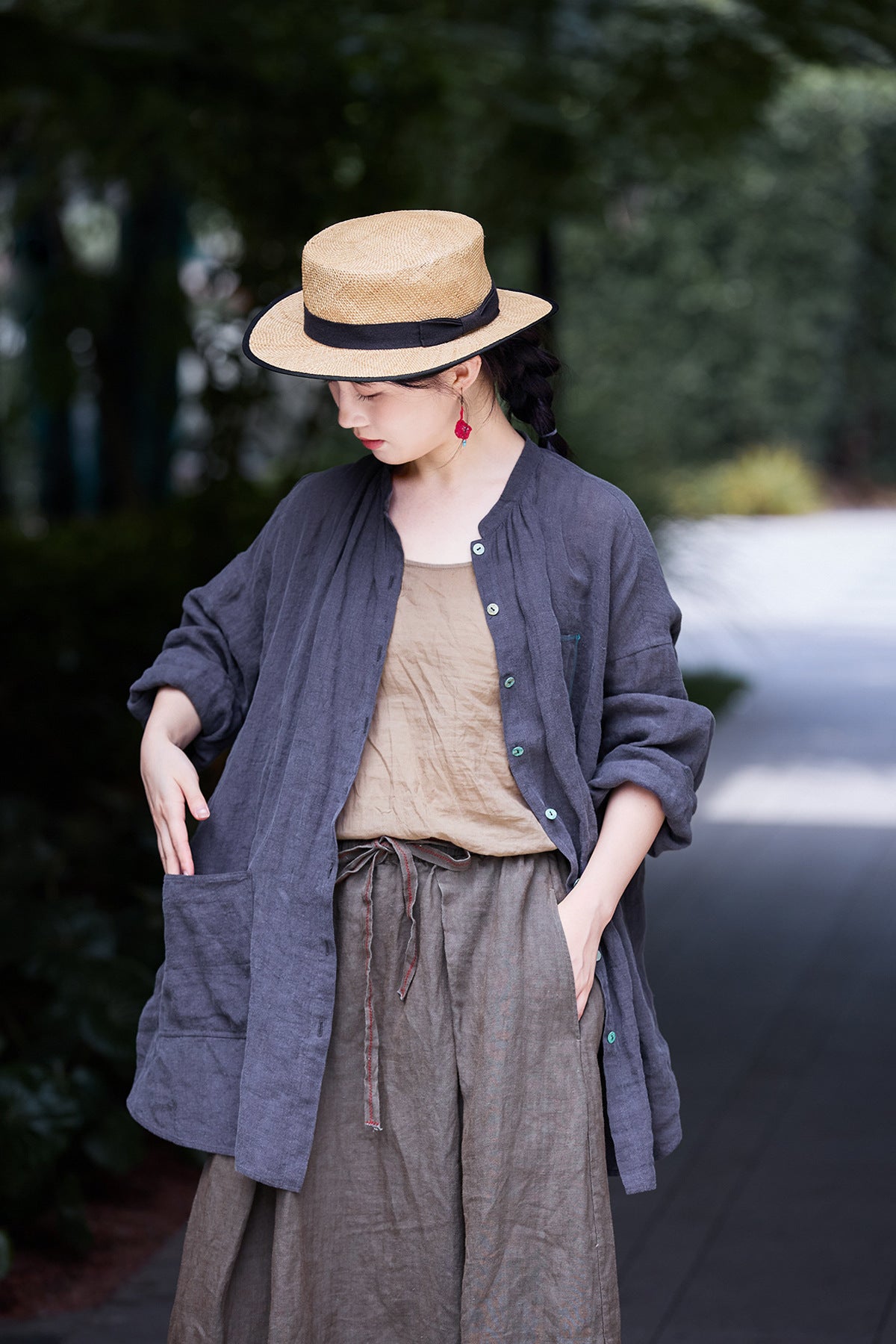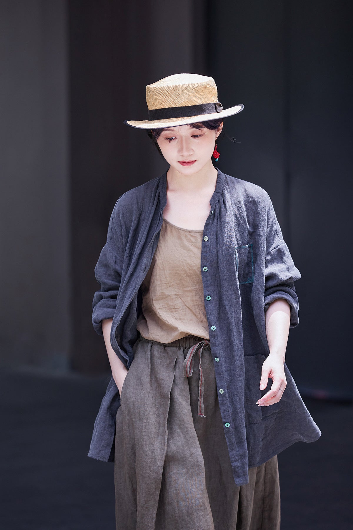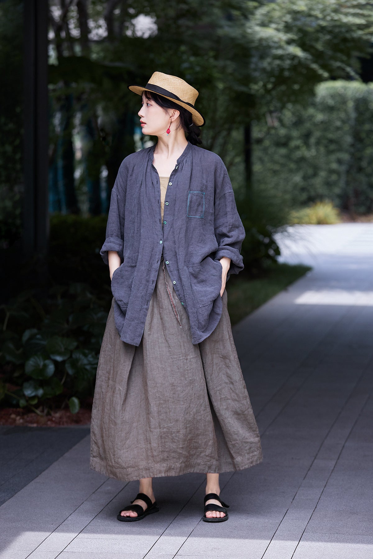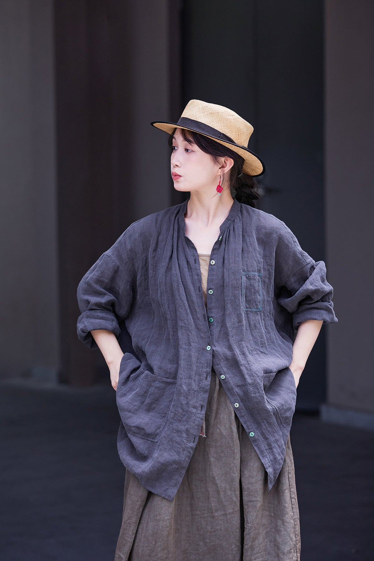 胸ポケステッチとボタンもポイントに✩リネン ゆったりシルエット バンドカラーポケットシャツ✩ Mサイズ