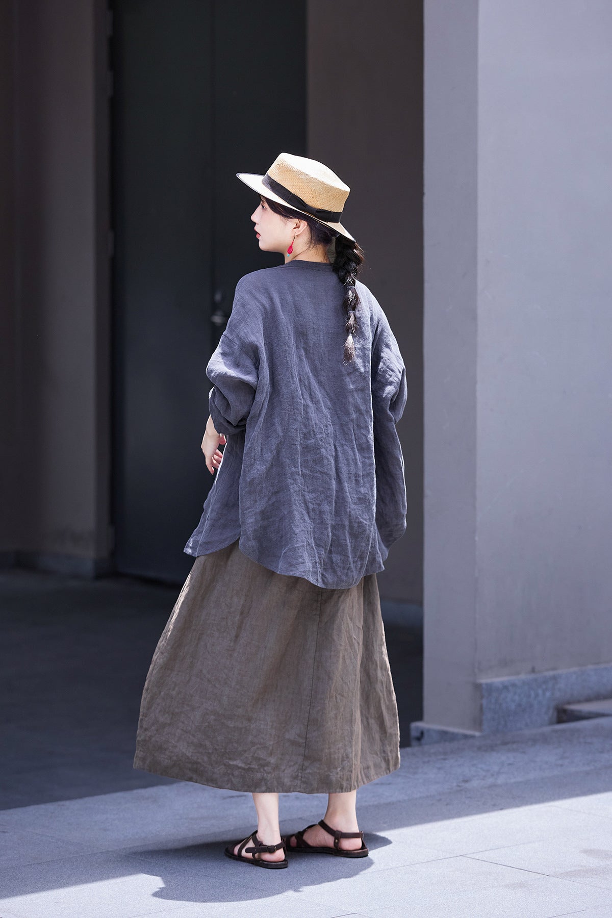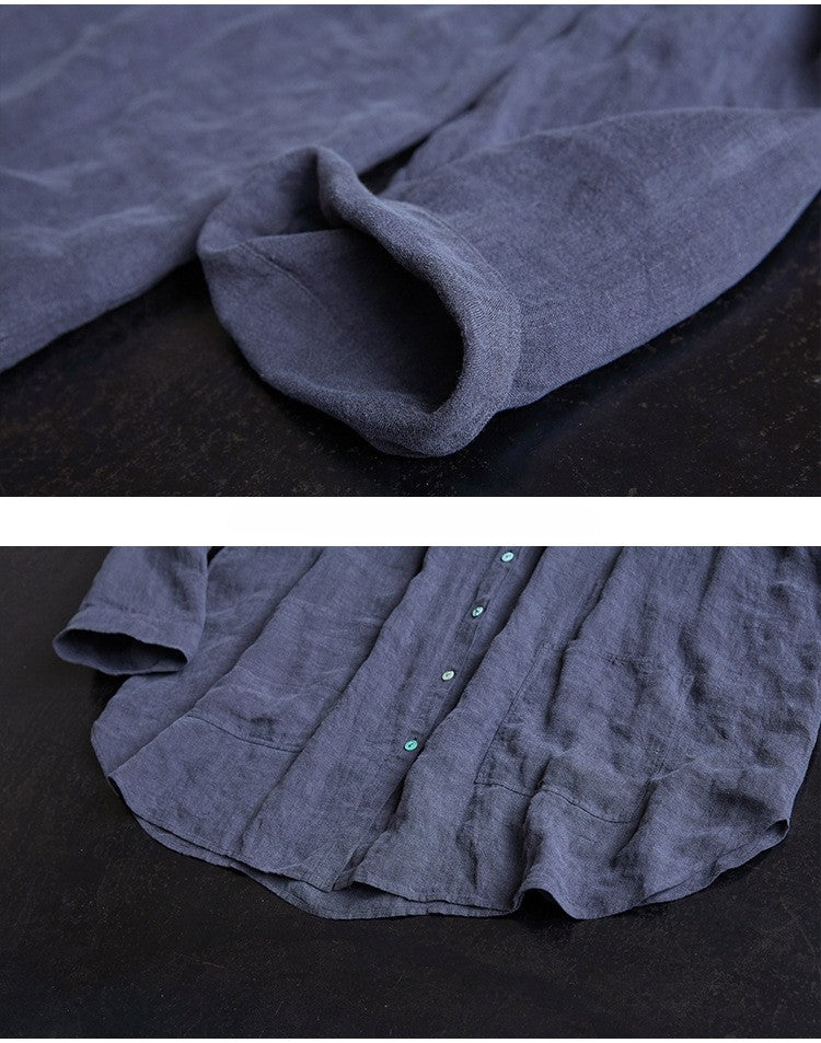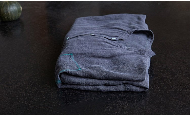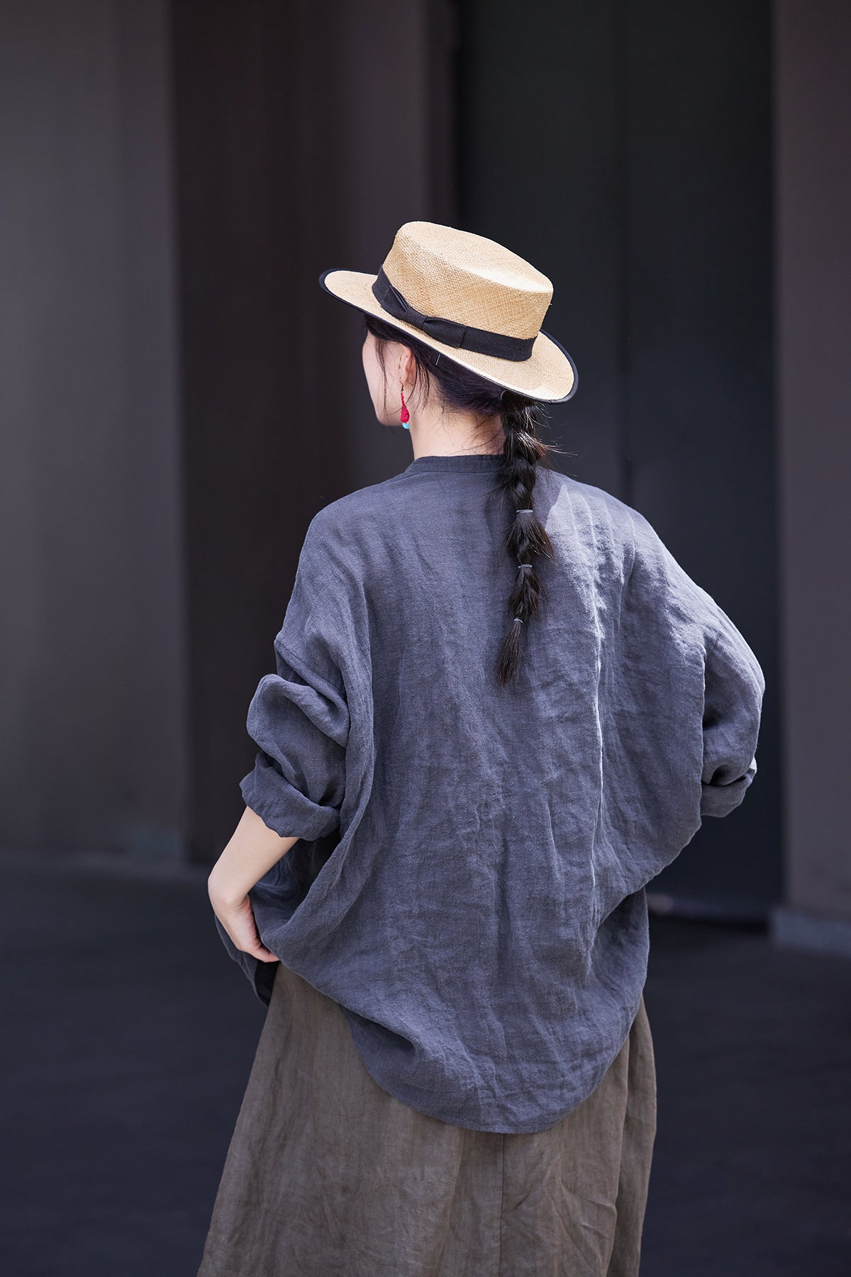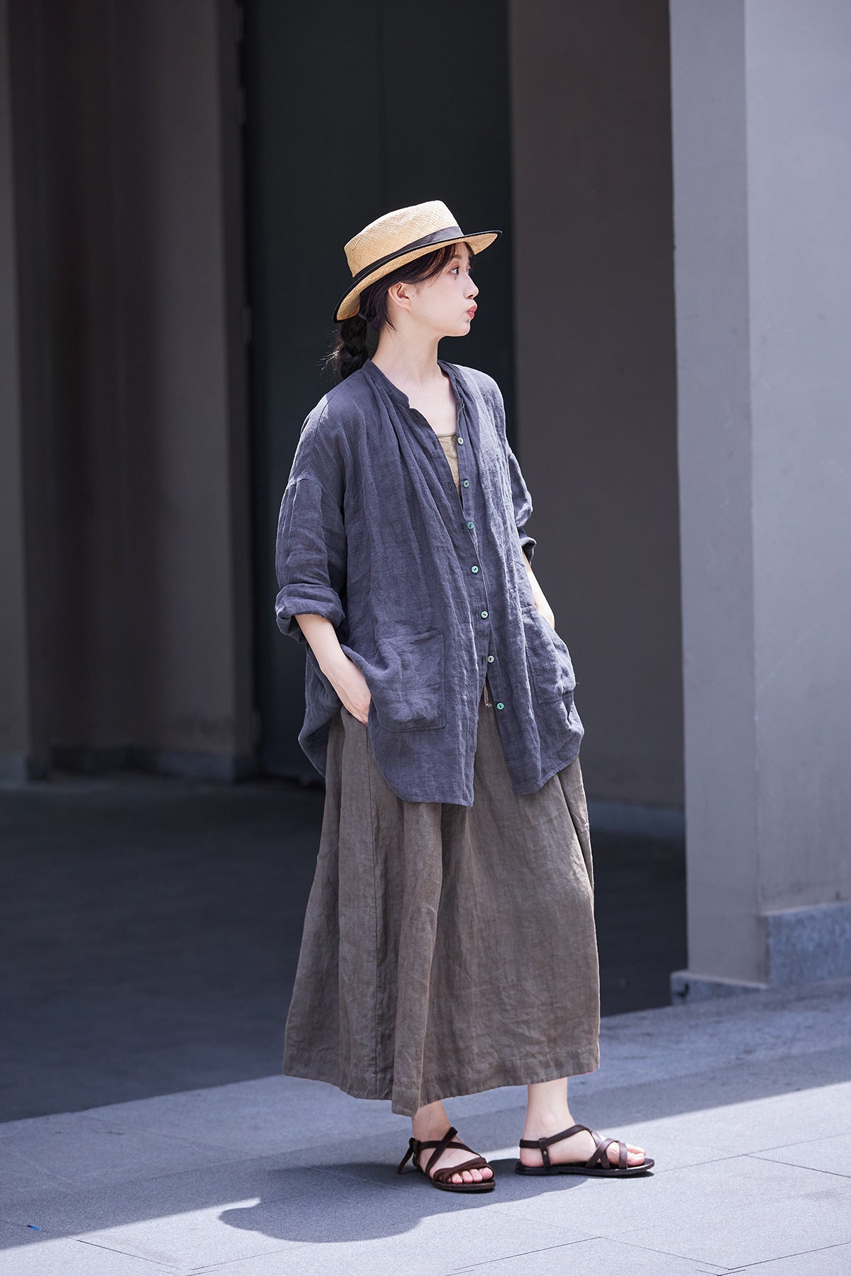 胸ポケステッチとボタンもポイントに✩リネン ゆったりシルエット バンドカラーポケットシャツ✩ Mサイズ