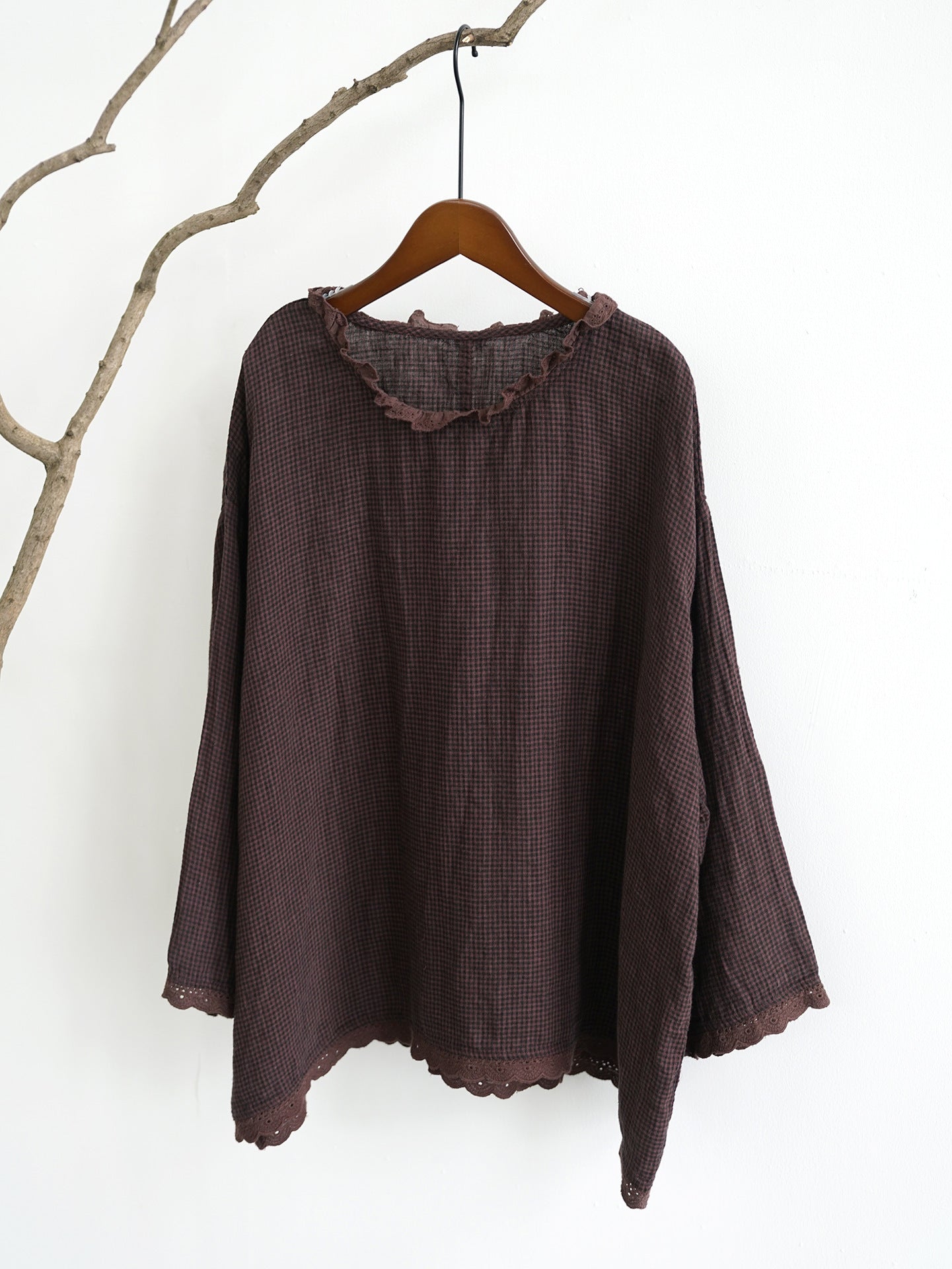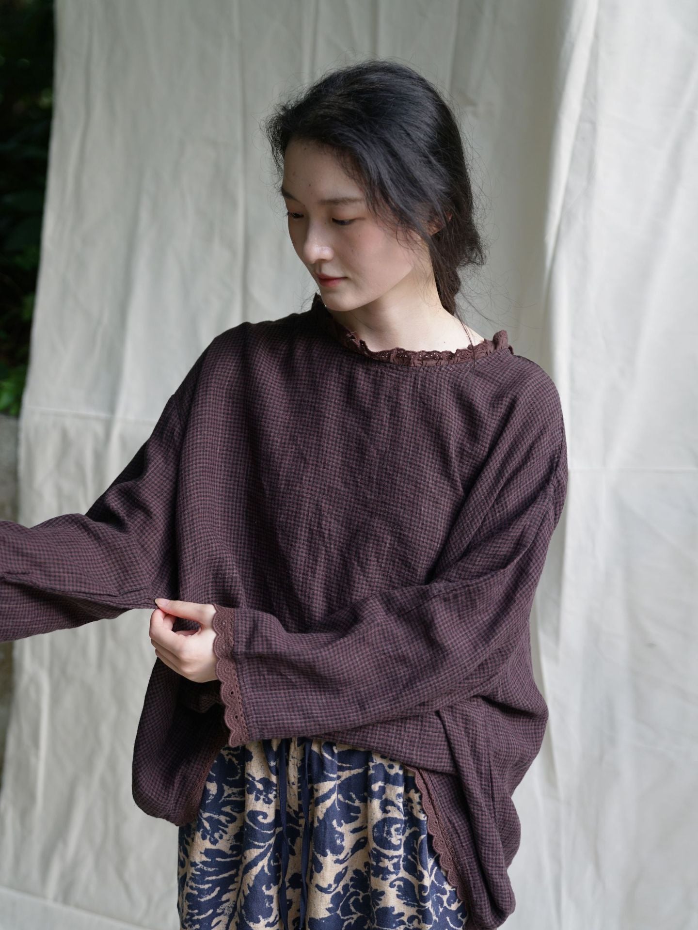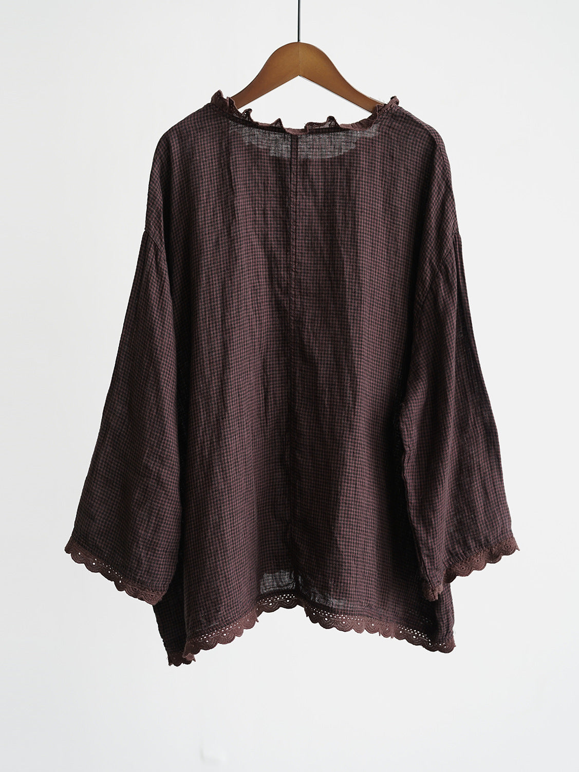 △薄手格子柄チェックリネン フリルネック ドロップショルダー ブラウス シャツ△
