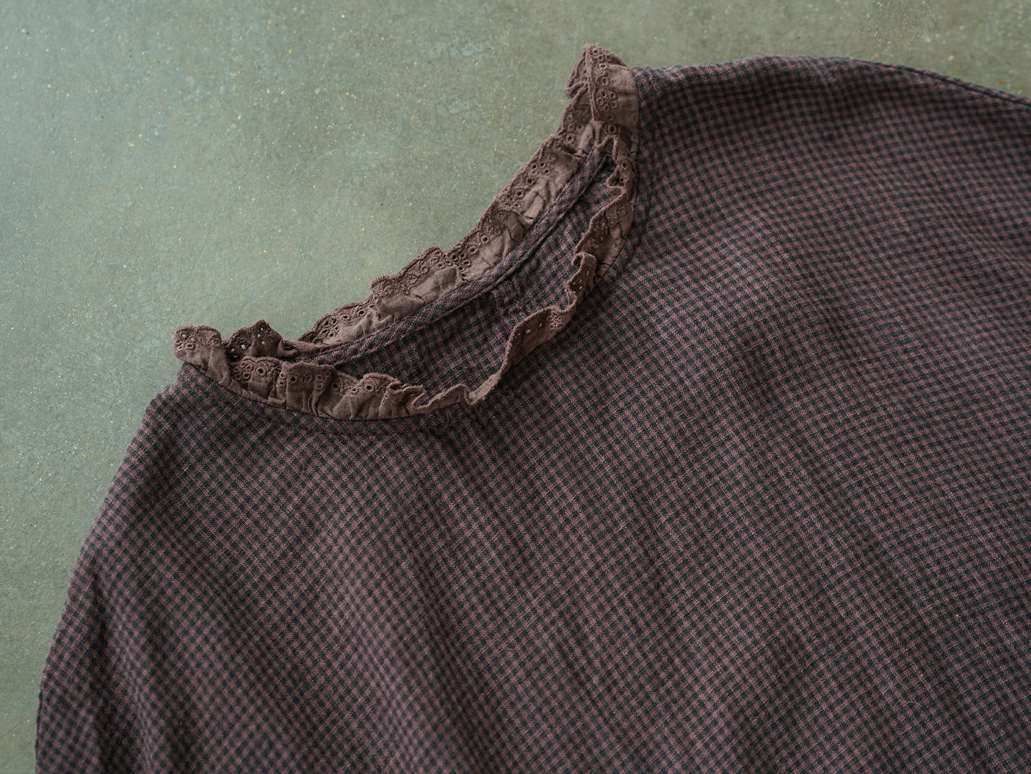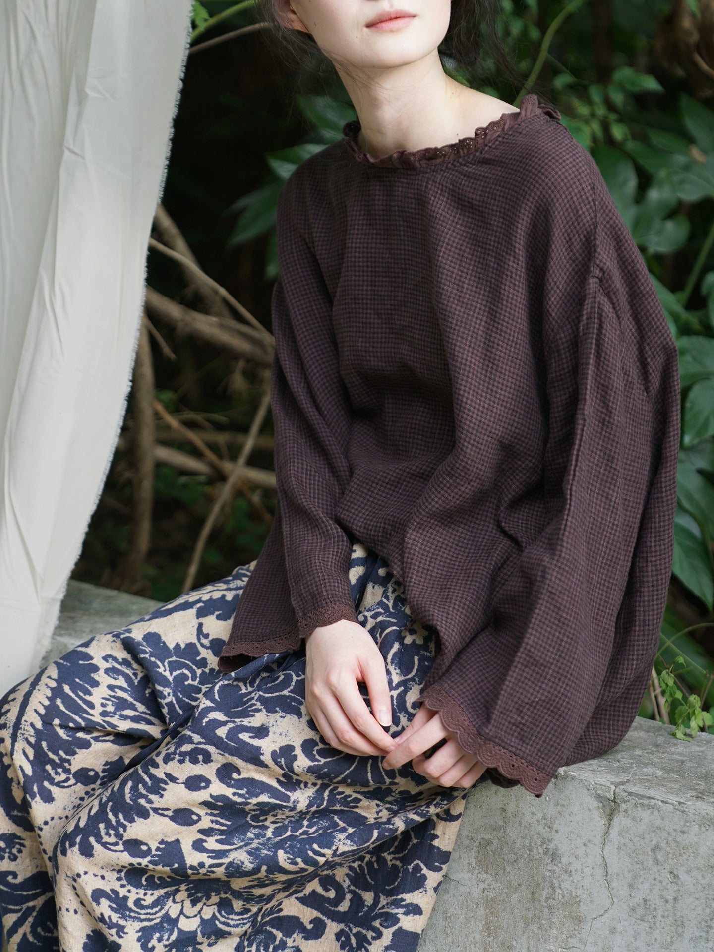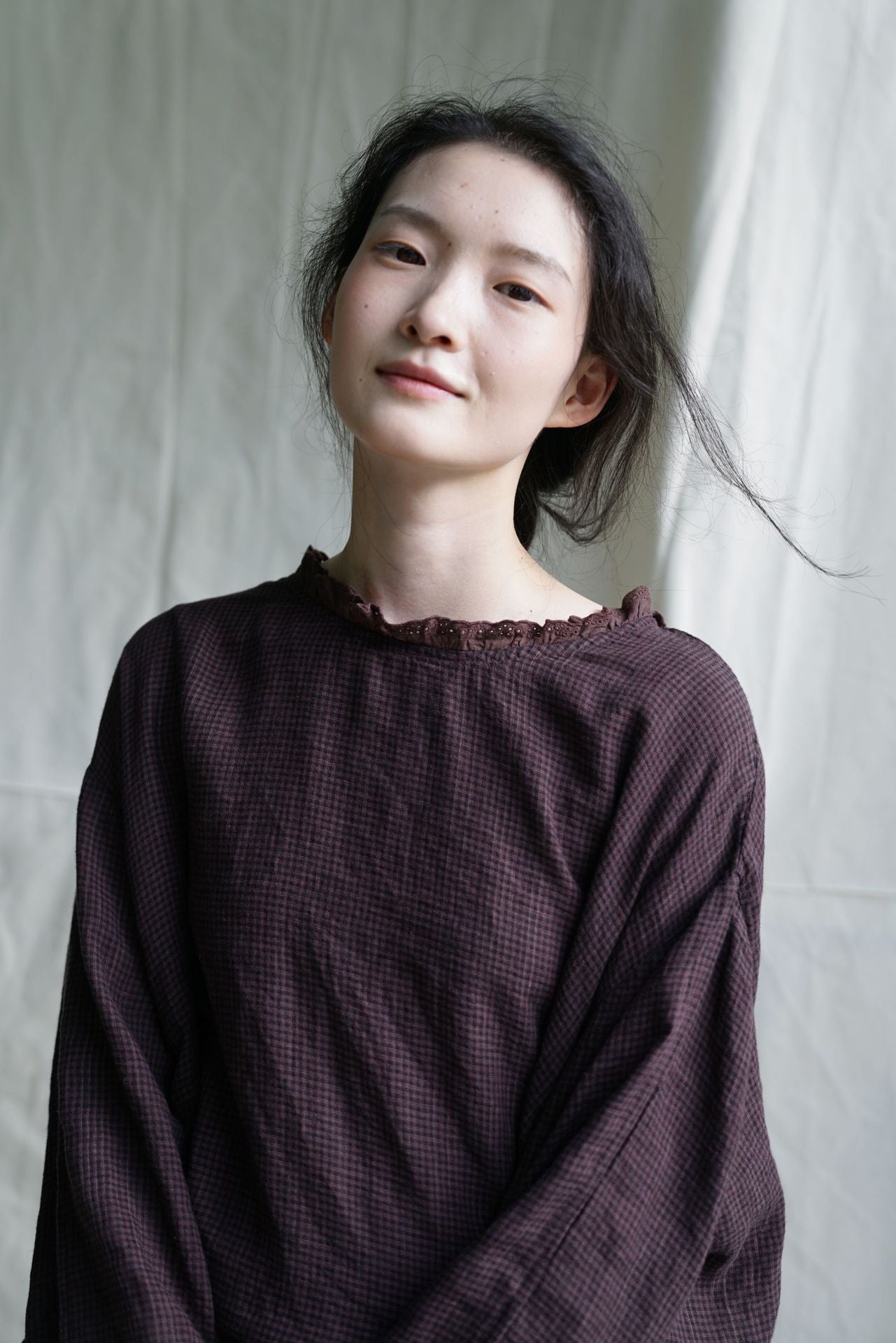 △薄手格子柄チェックリネン フリルネック ドロップショルダー ブラウス シャツ△
