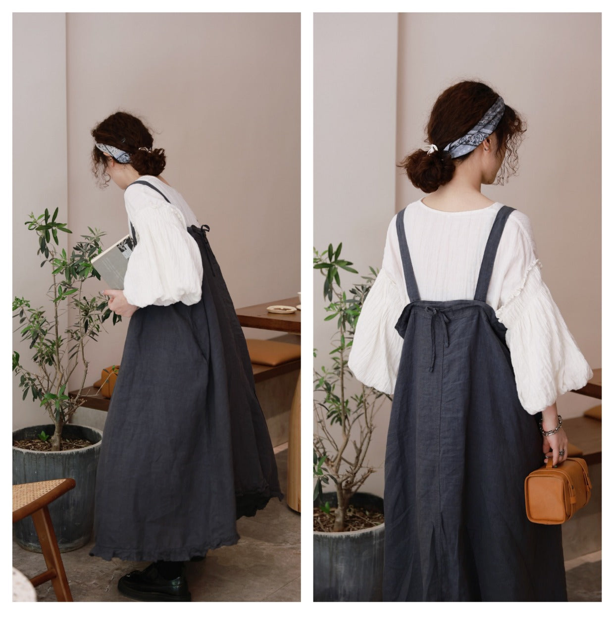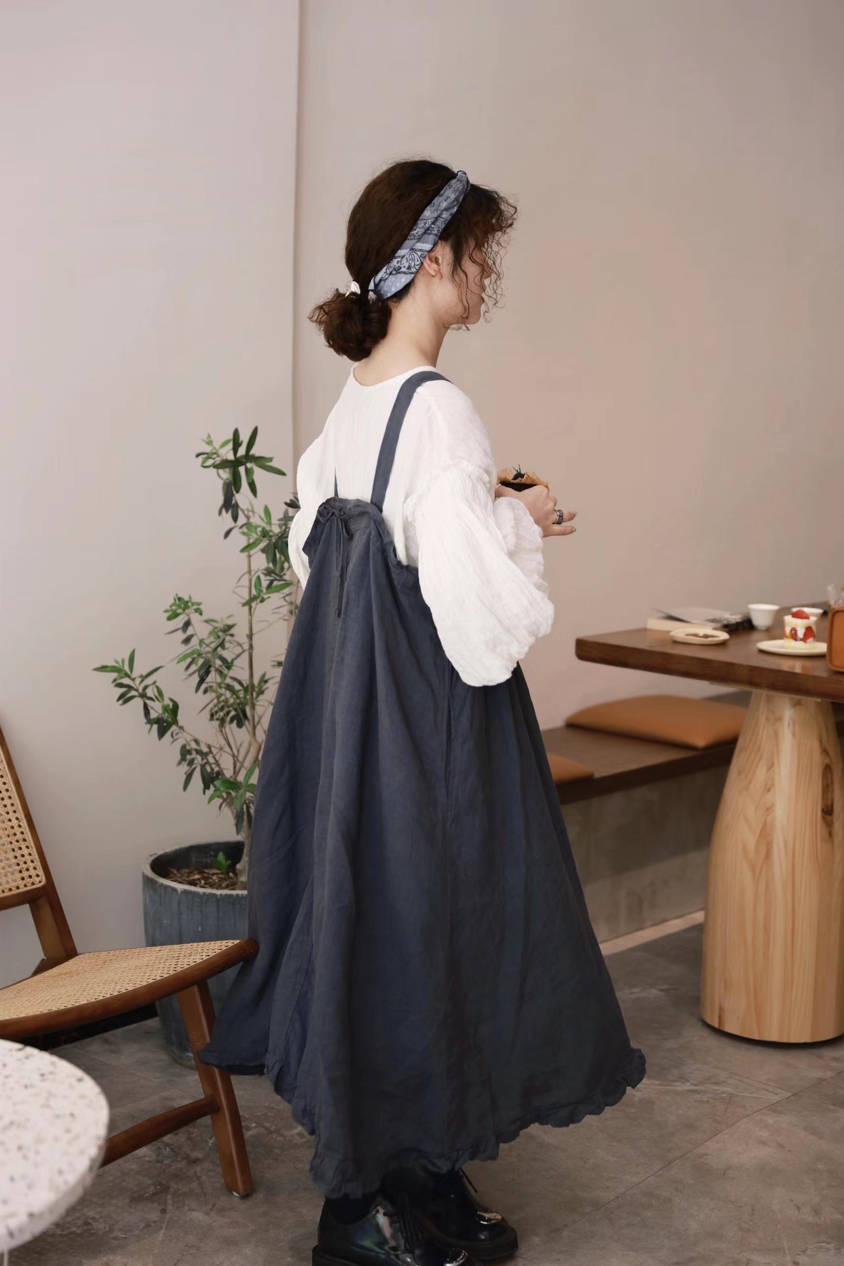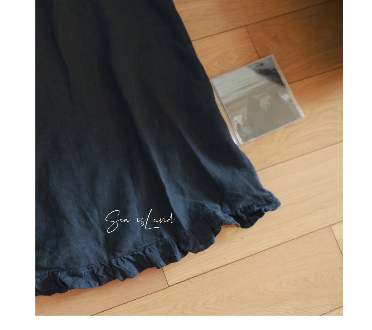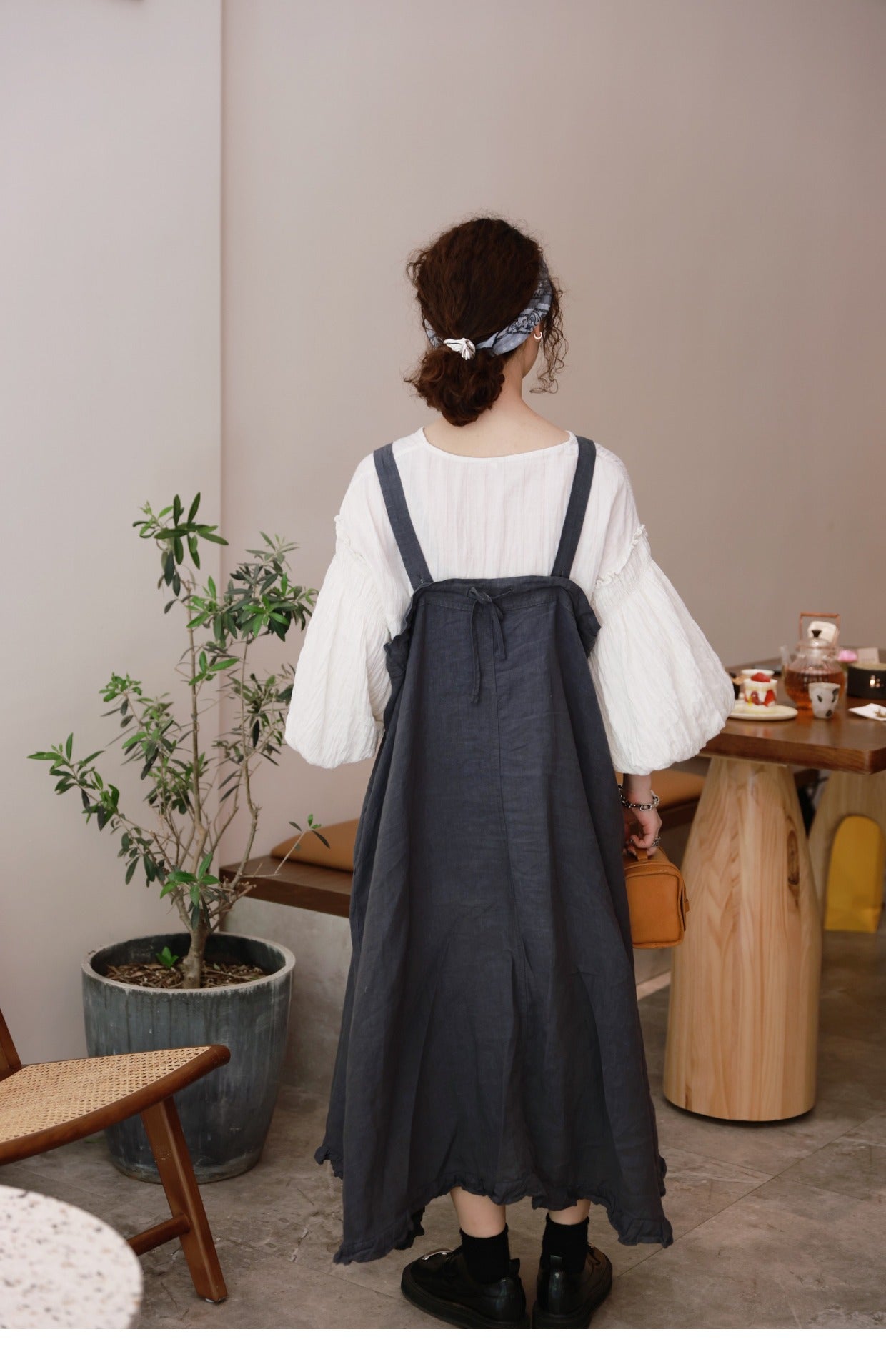 ◇裾フリル装飾もポイントに◇リネン ネイビーカラー ジャンパースカート ドレス ◇