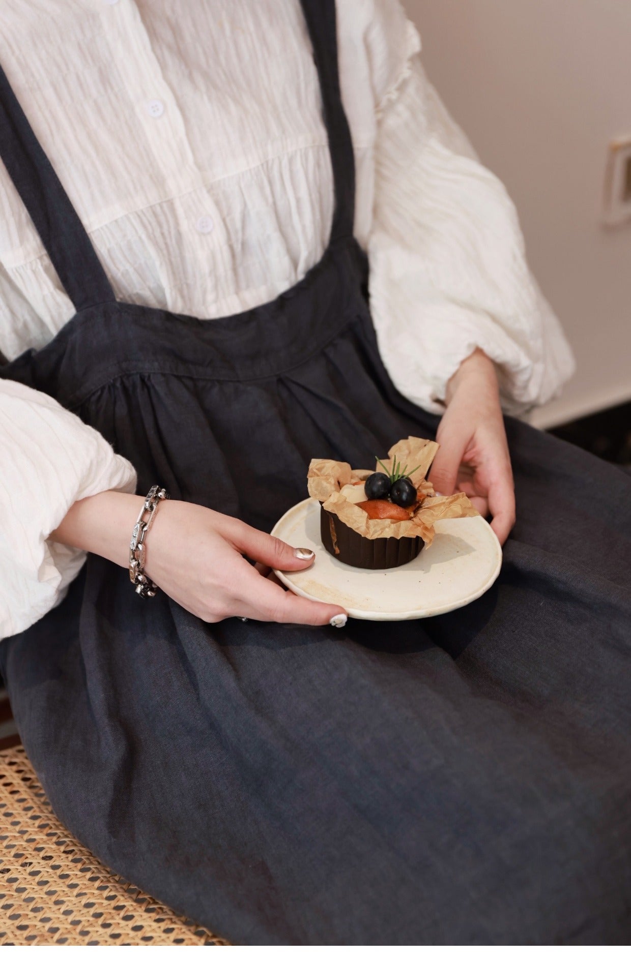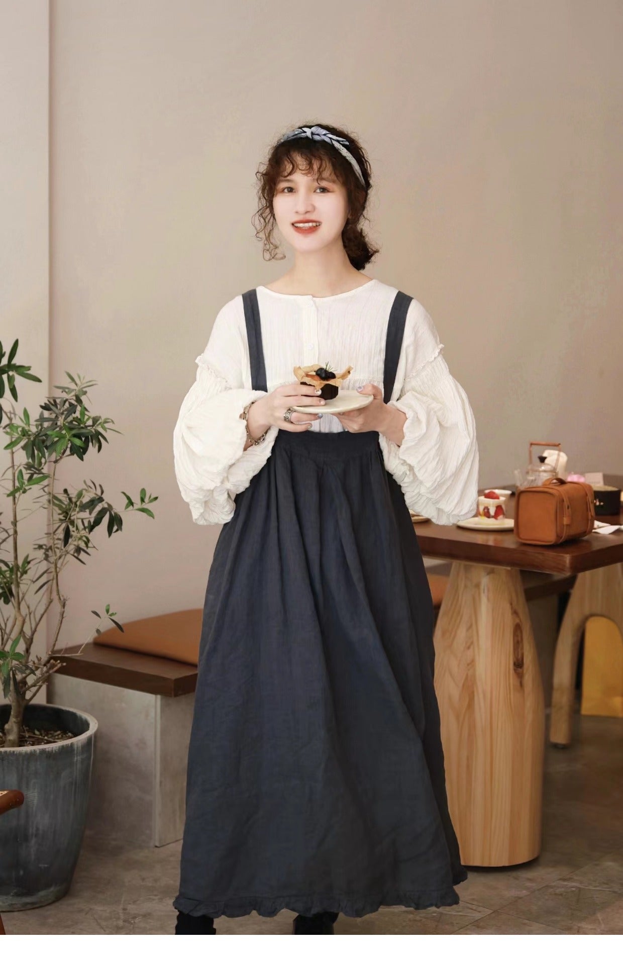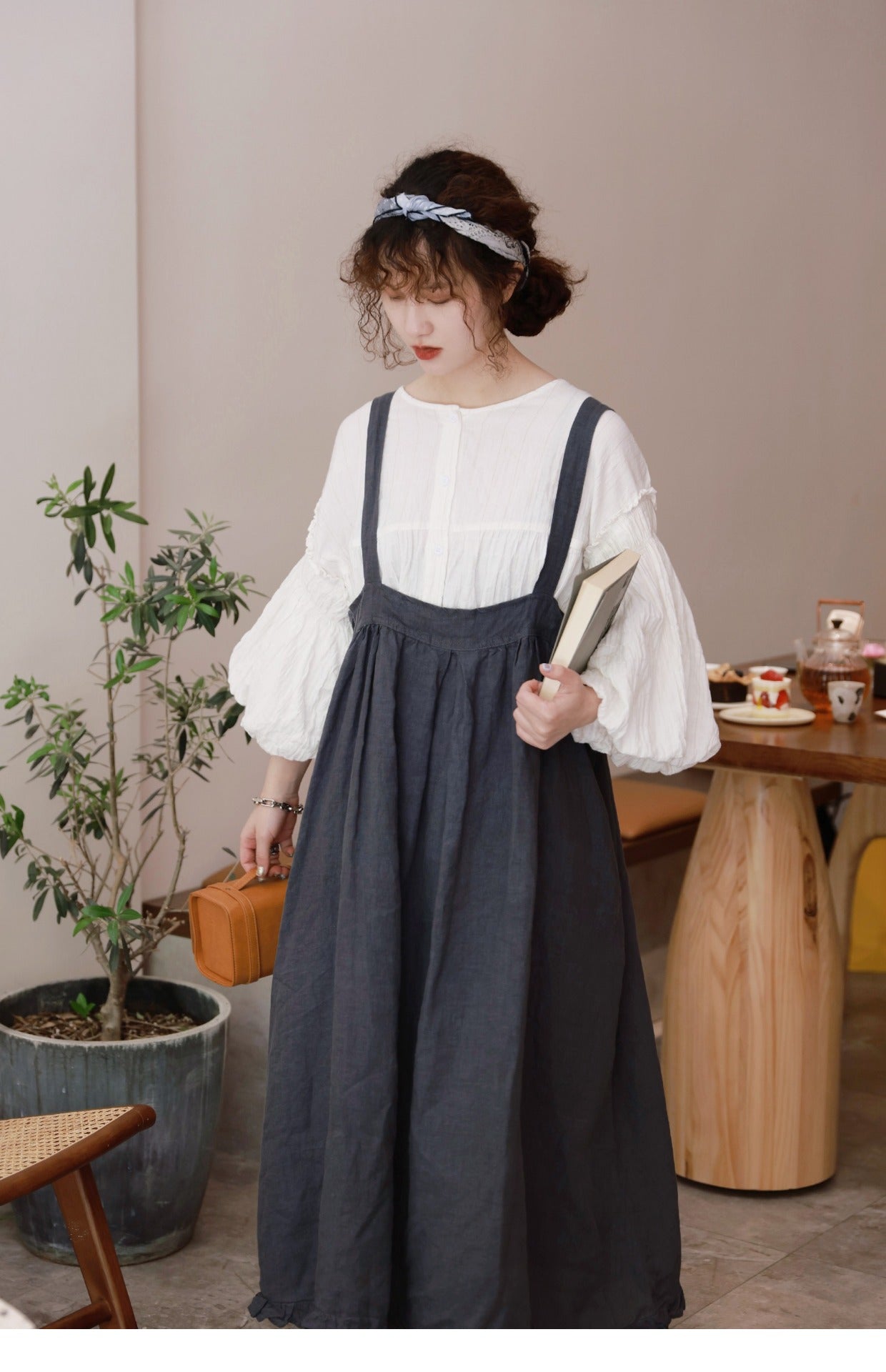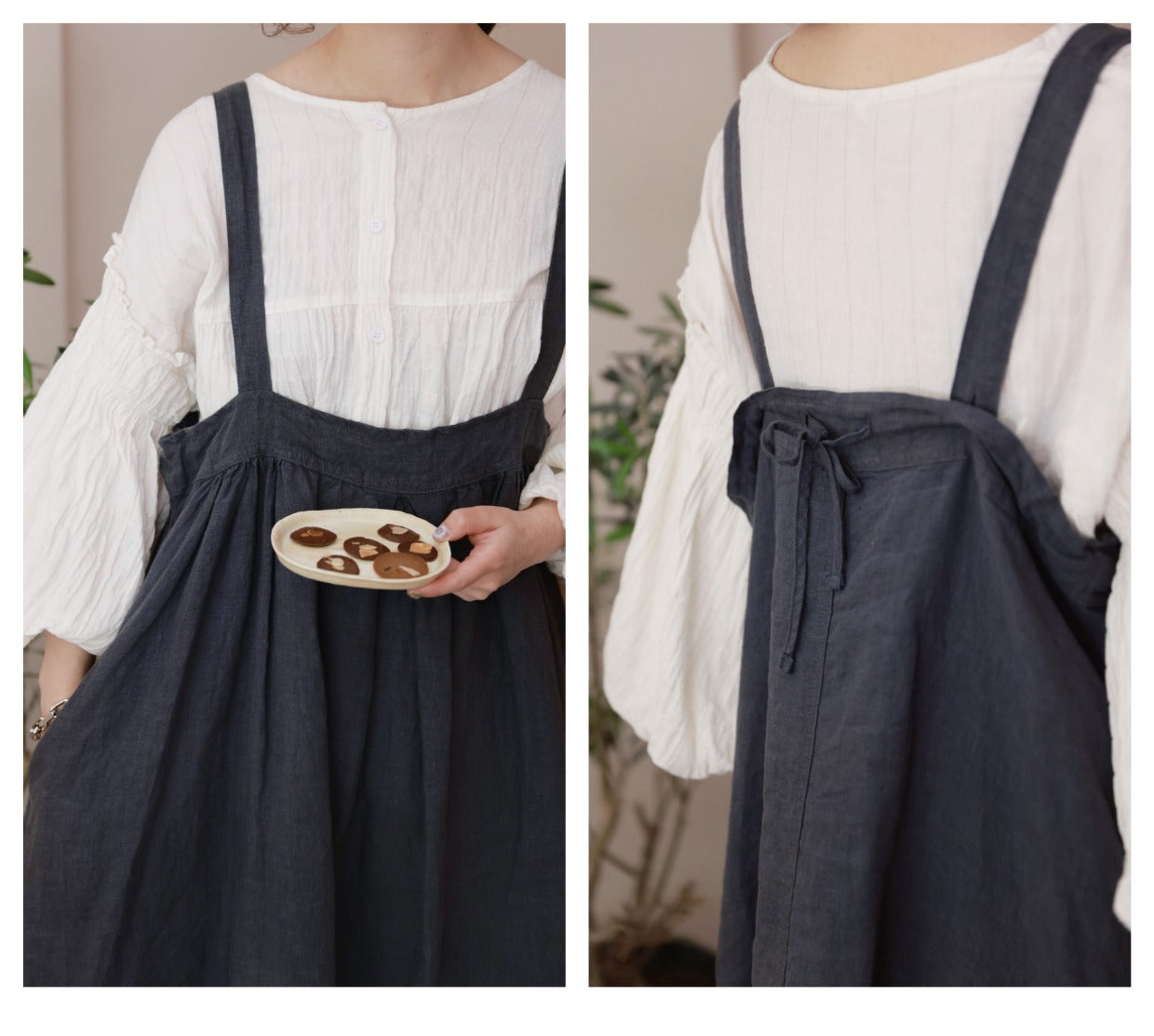 ◇裾フリル装飾もポイントに◇リネン ネイビーカラー ジャンパースカート ドレス ◇
