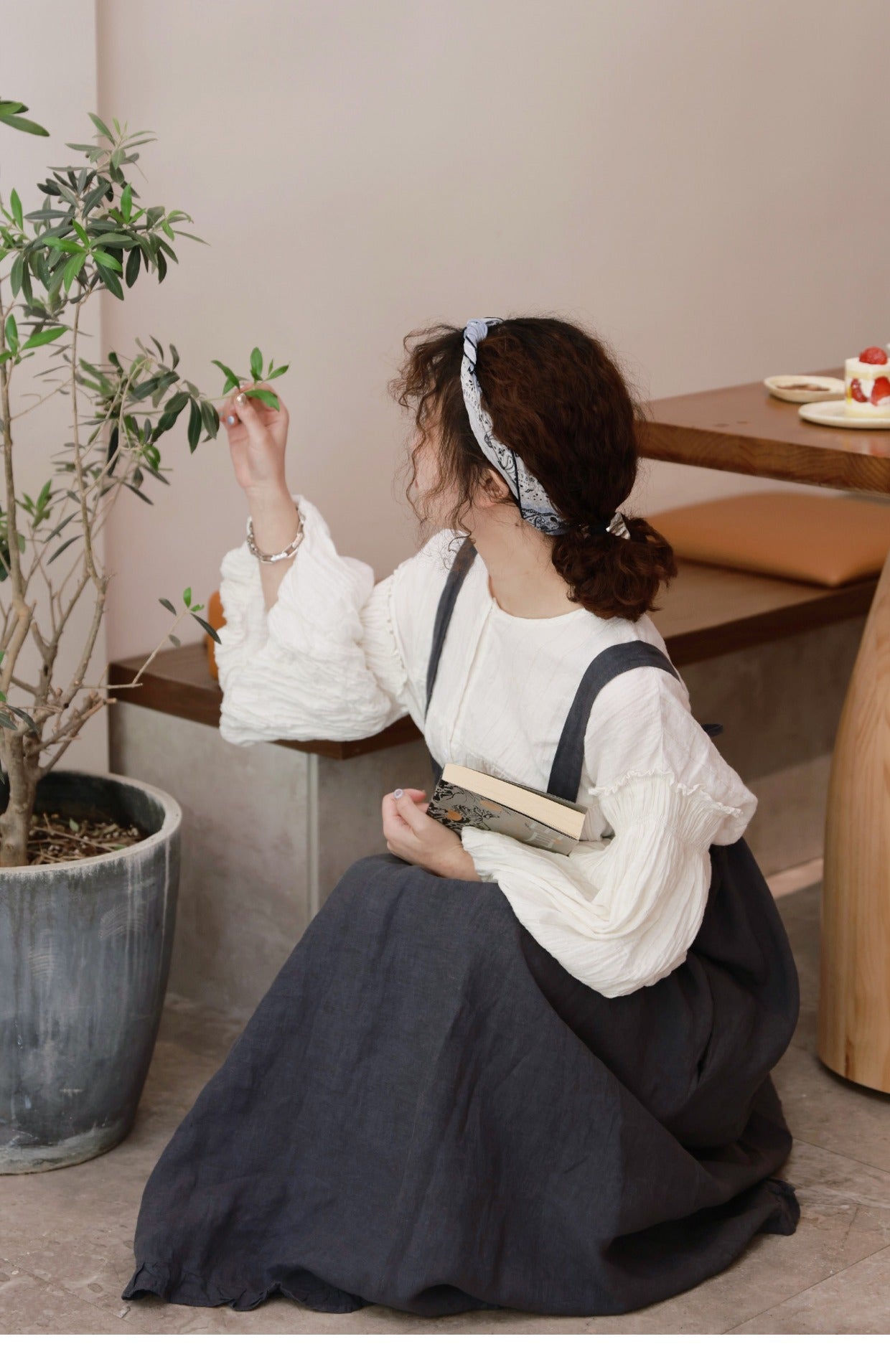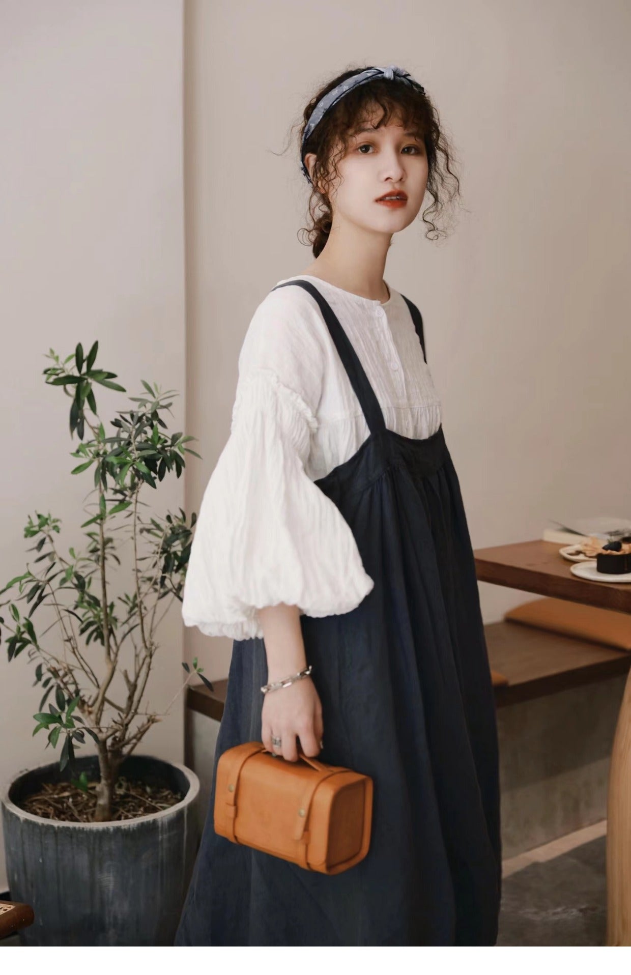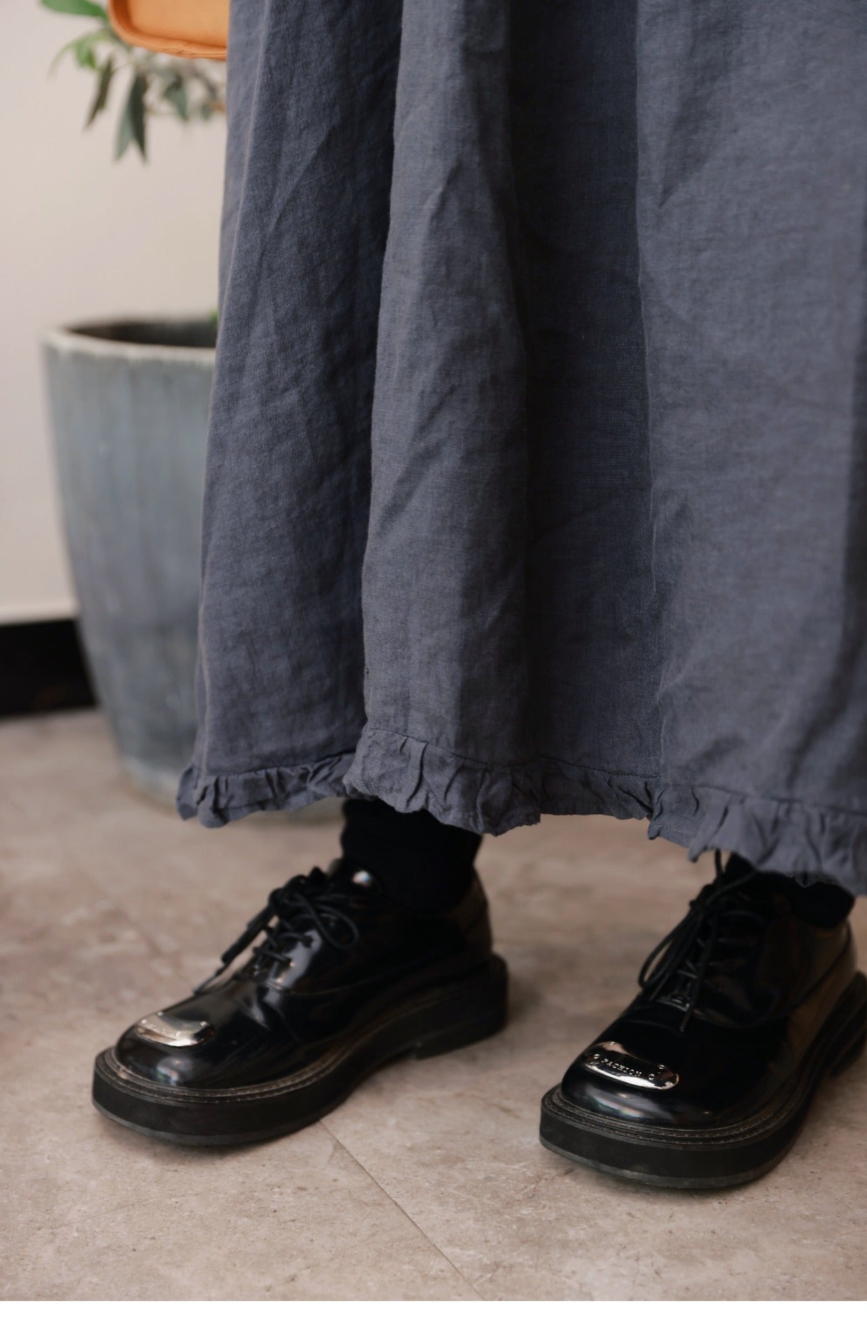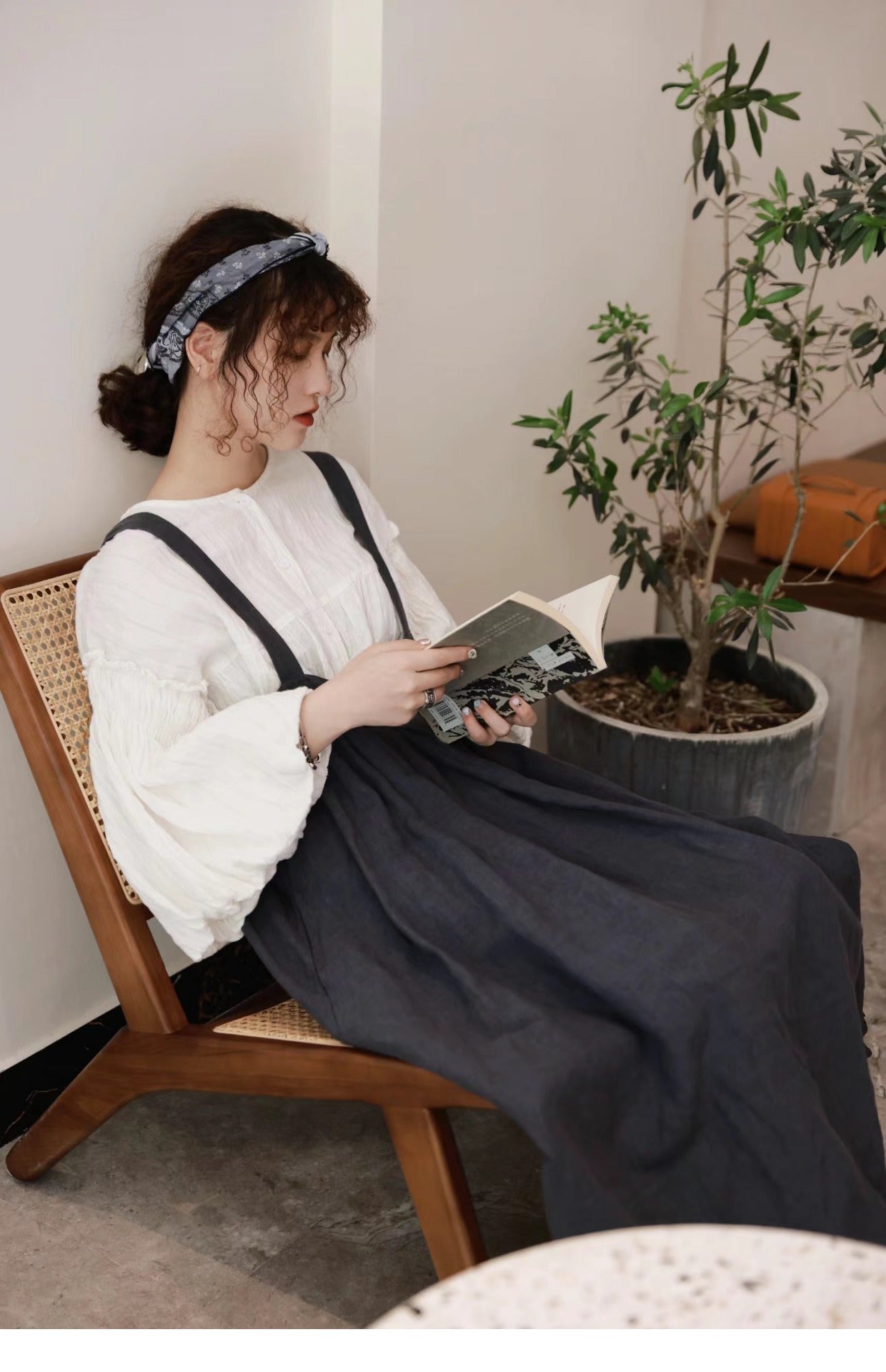 ◇裾フリル装飾もポイントに◇リネン ネイビーカラー ジャンパースカート ドレス ◇